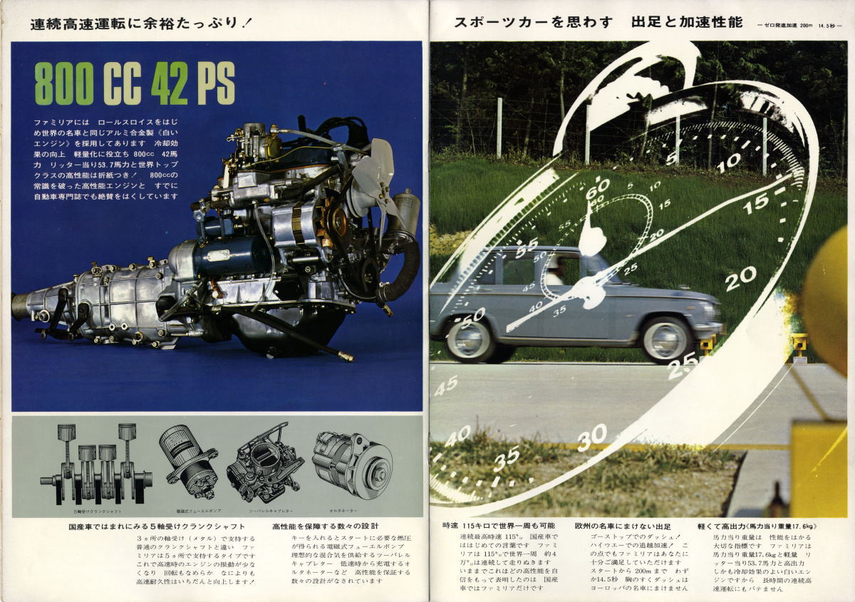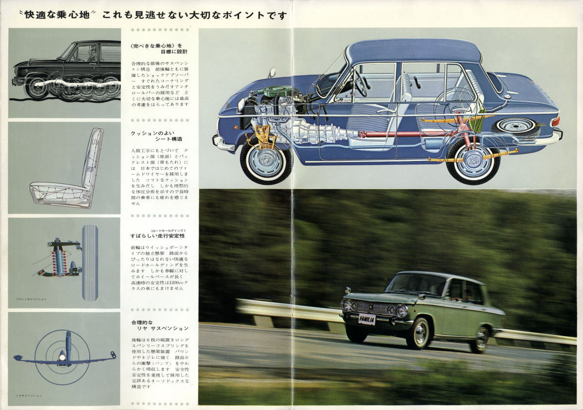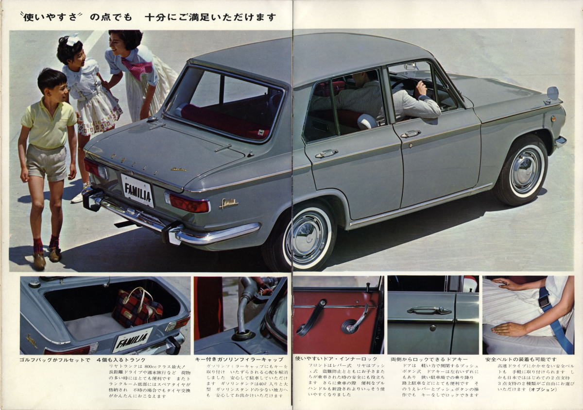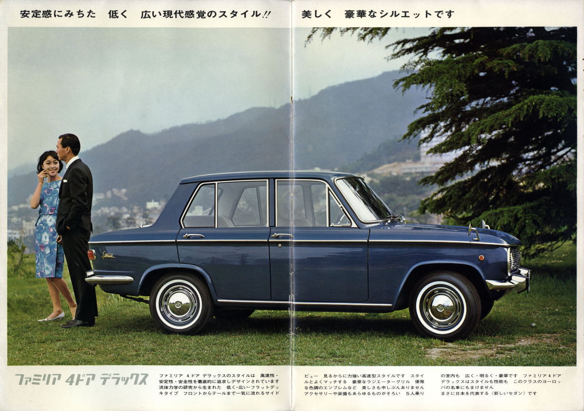1964年、前年に発売されたファミリアバンに続いてマツダから発売された、ファミリア・セダンです。ファミリアバンがアクセラスポーツの先祖ならこちらはアクセラセダンの先祖ということになりますね。カタログ写真で見る限り800ccの小型乗用車とは思えないぐらい存在感のあるカッコいいスタイルですが、実物はかなり小さいです。全長3700mm、全幅1465mmなので、ほぼ現在の軽自動車と同じサイズです。今の軽は全長が3400mm弱、全幅1480mm弱なので、全長が30センチほど長いだけですね。これほど小さな車体のクルマでも存在感があるのですからマツダのデザインセンスはなかなかです。まあマツダのデザインは現在もかなりすばらしいですが。