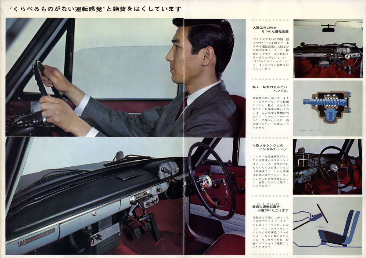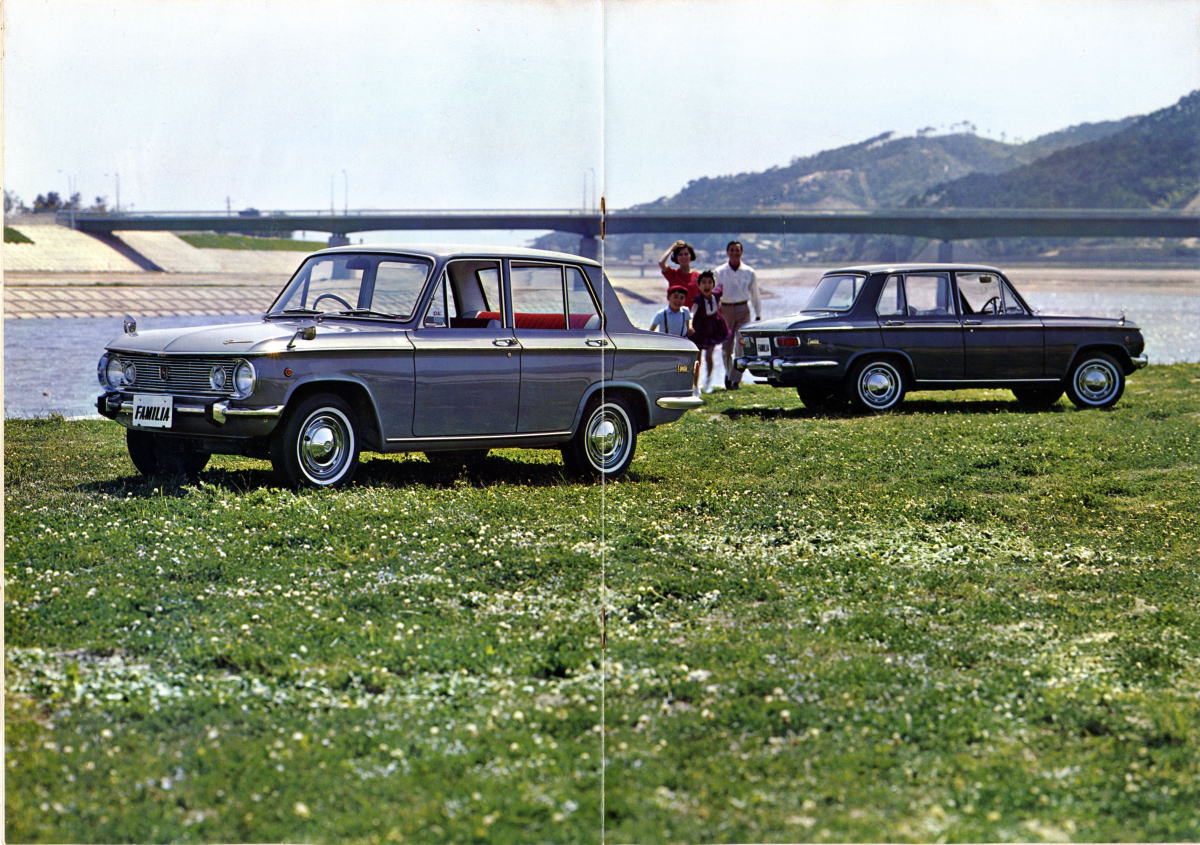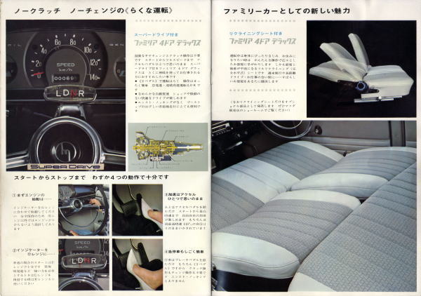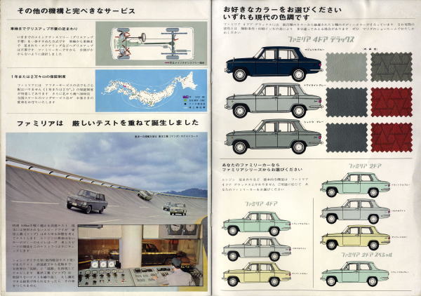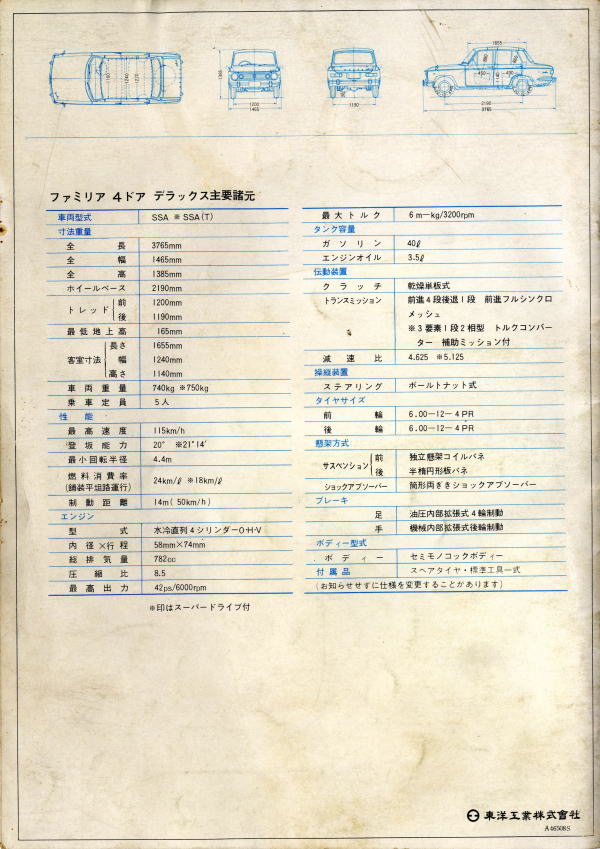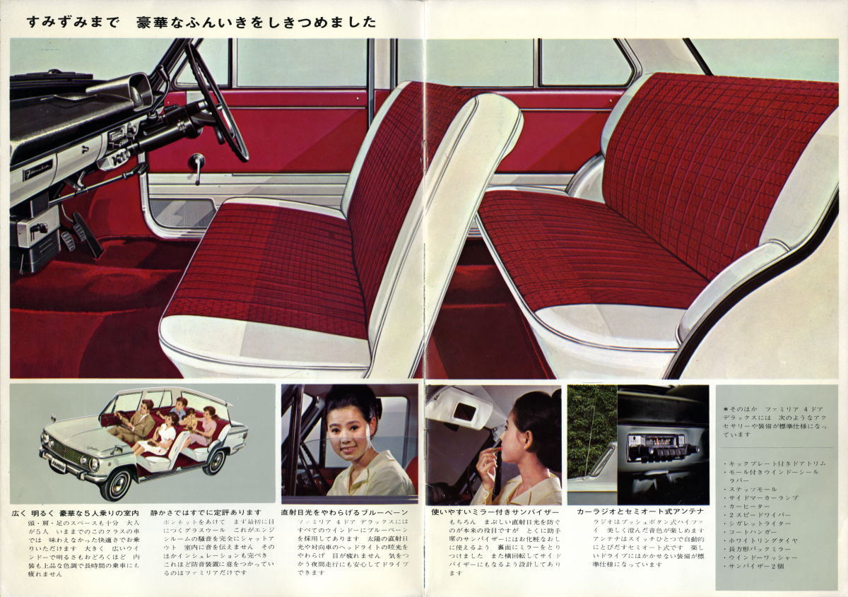 1964年、前年に発売されたファミリアバンに続いてマツダから発売された、ファミリア・セダンです。ファミリアバンがアクセラスポーツの先祖ならこちらはアクセラセダンの先祖ということになりますね。カタログ写真で見る限り800ccの小型乗用車とは思えないぐらい存在感のあるカッコいいスタイルですが、実物はかなり小さいです。全長3700mm、全幅1465mmなので、ほぼ現在の軽自動車と同じサイズです。今の軽は全長が3400mm弱、全幅1480mm弱なので、全長が30センチほど長いだけですね。これほど小さな車体のクルマでも存在感があるのですからマツダのデザインセンスはなかなかです。まあマツダのデザインは現在もかなりすばらしいですが。