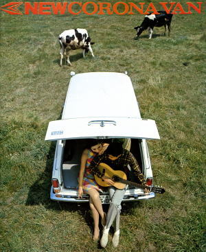 1964年にトヨタから発売された3代目コロナ(RT40型)のバリエーションであるコロナ・バン(RT46V型)です。このカタログ写真を見てください。リアゲートを開けて寄り添ったカップルがギターを奏でる姿、裕福な若い男女と思われるグループが狩りに興じる姿、窓から覗き込む美女の写真の下には「荷室は広く、リア・シートを倒しても床面はまったく平らです」とのフルフラットスペースのアピール(積載性能のアピールなのかカーS○Xができることのアピールなのか?)。
