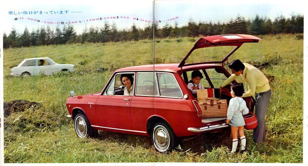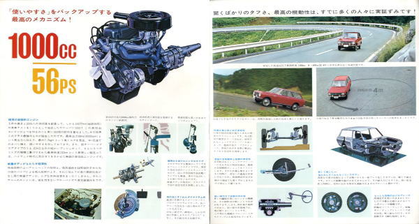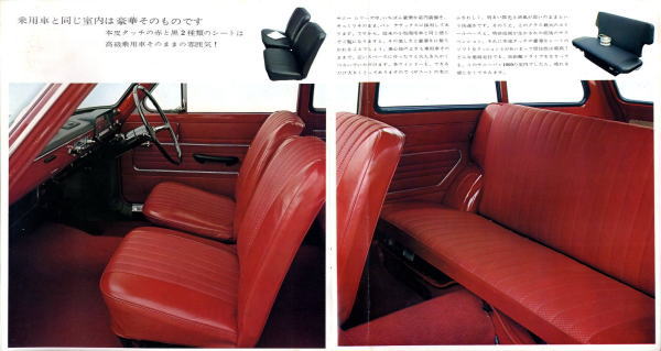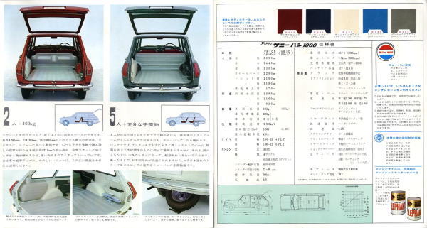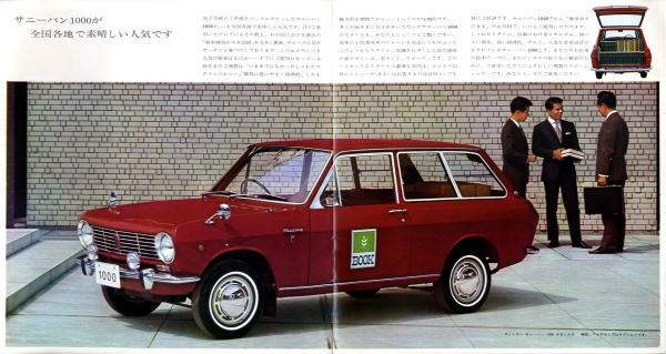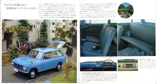 このカタログには1台のサニーバンで仕事をしているカットと家族でピクニックへ出かけているカットが載っていますが、当時は車を何台も所有できるような家庭はそれほどありませんでしたから、商売をされているところは仕事用のライトバンが家庭の乗用車でした。