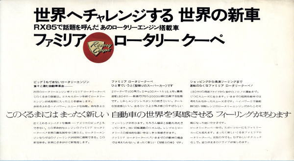 マツダのクルマ造りにおいて、こういう発想は今も昔も変わりませんね。現在ではマツダスピード・アクセラがそうです。あの巨体のMPVすら豪快に加速させてしまうターボエンジンをアクセラの車体に載っけてしまうんですものね。これからもファミリア・ロータリークーペやマツダスピード・アクセラのような、ちょっと茶目っ気のあるクルマを作り続けて欲しいものです。