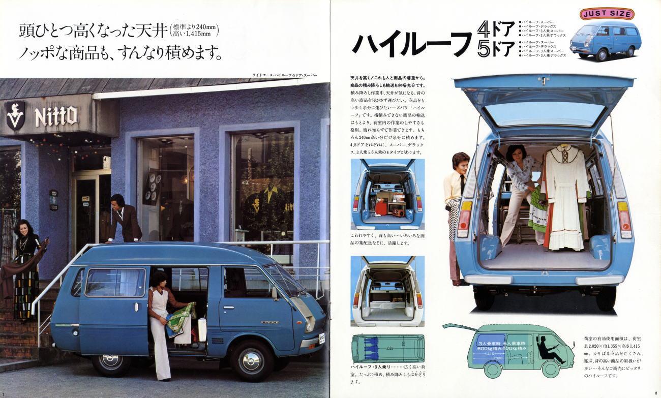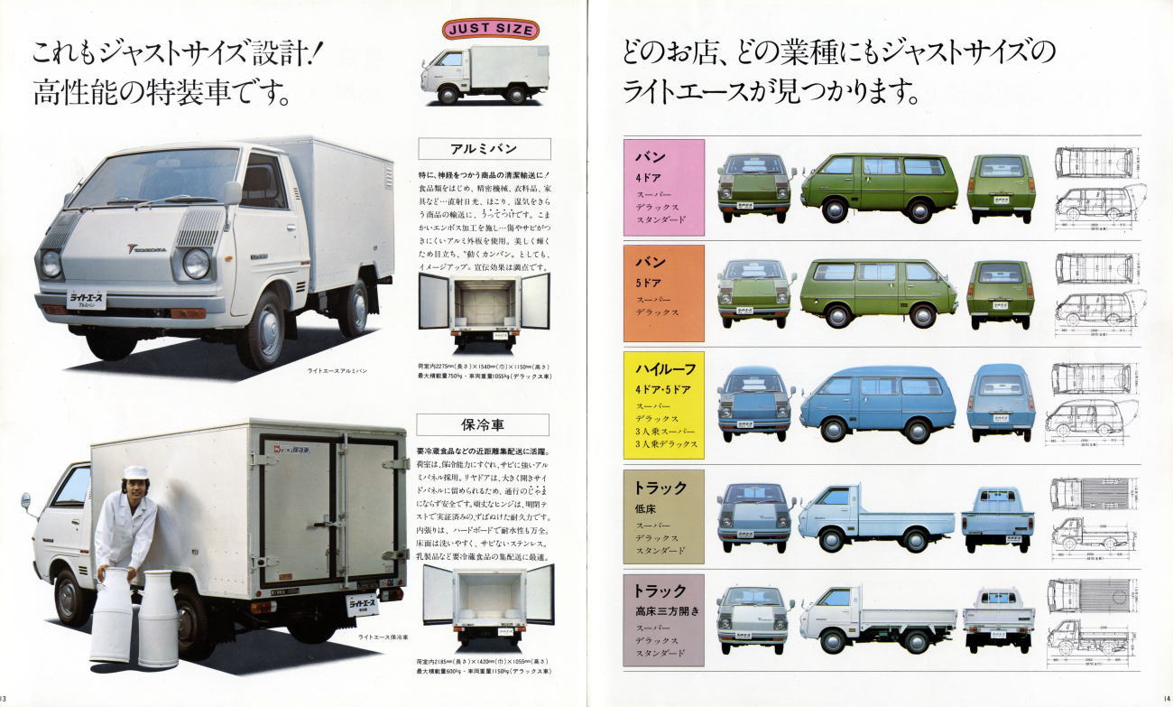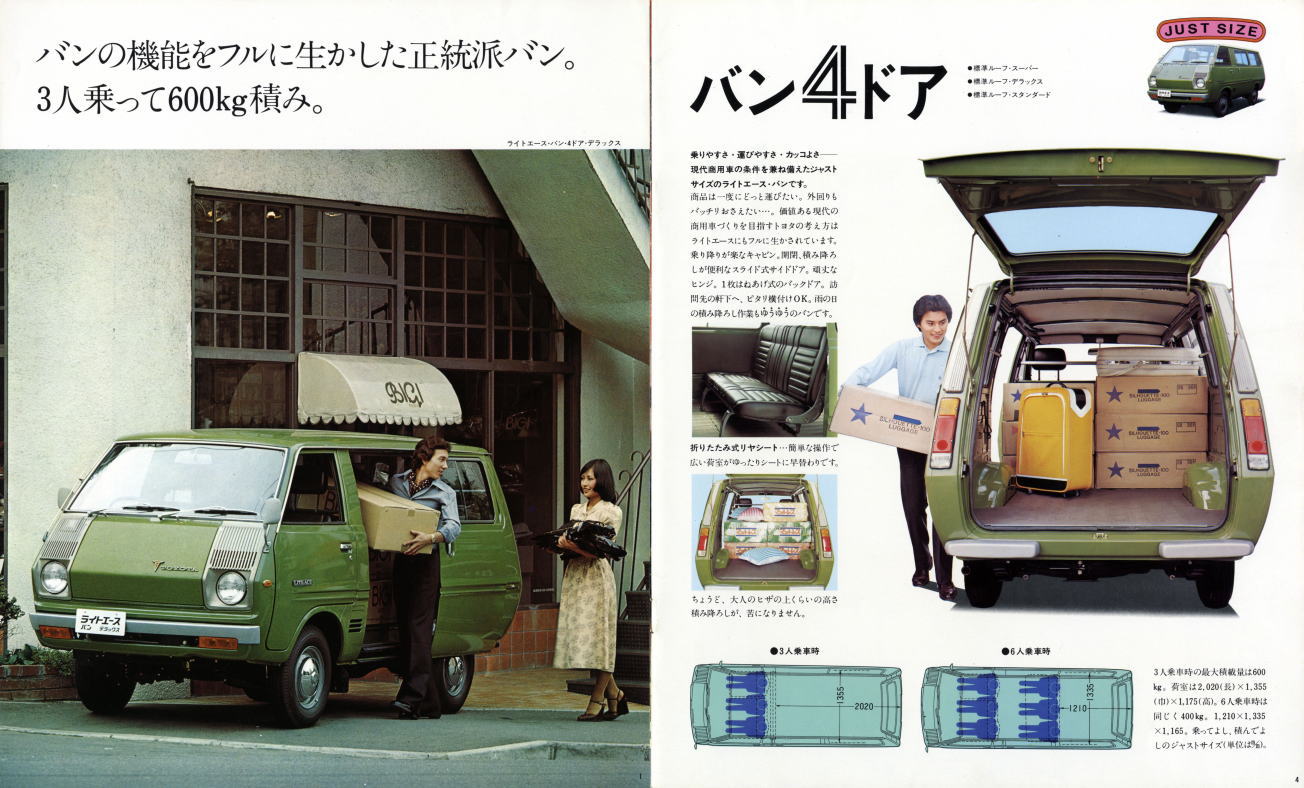 1970年にトラック、1971年にバンとワゴンが発売された、トヨタの初代ライトエース(KM10型)です。当時、トヨタには代表的な商用車としてハイエースがあり、またパブリカのエンジンを積んだミニエースという小型商用車もありました。初代ライトエースはハイエースとミニエースの中間を埋めるべく発売された車種です。