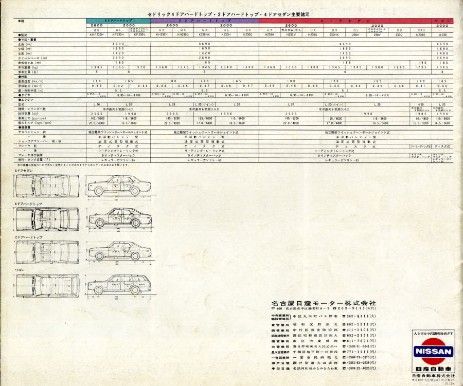この230型セドリックが宿敵クラウンを破った唯一のモデルです。クラウンのデザインがまずかったという言い方が一般的ですが、逆にセドリックのデザインが良かったという言い方ももちろんありだと思います。もし230型が先代130型同様にピニンファリーナ尻下がりデザインを続けていたら、まずい物同士の選択ということになり、やっぱりクラウンが勝っていたかもしれませんね。