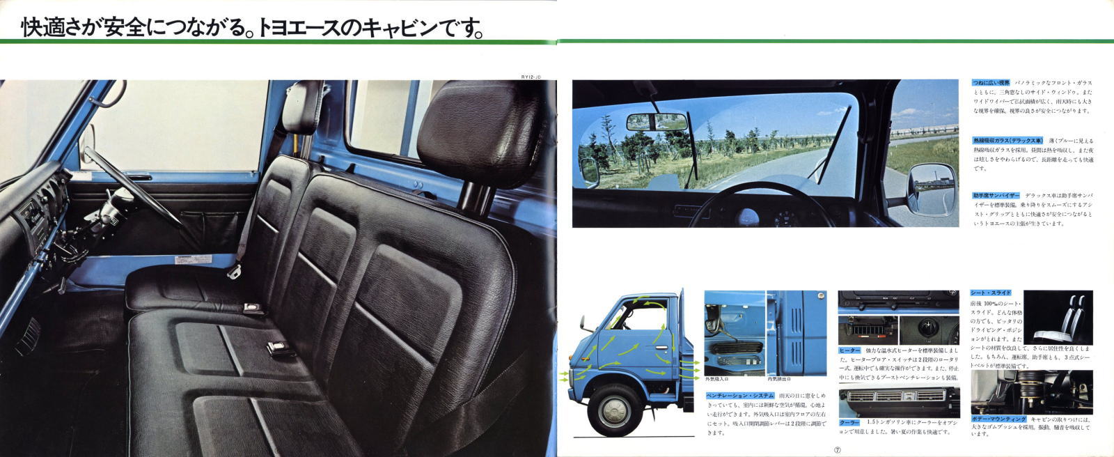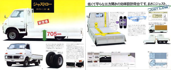 さて、この3代目トヨエース、エクステリアもインテリアも先代と比べるとずいぶん現代的になりました。なんといっても画像5枚目で特別に紹介されているように、グローブ・ボックスにはふたが付き、助手席ドアにもキーが付いたぐらいですから。逆に言うと、これらのことがカタログで紹介されていると言うことは、先代がいかに簡素な装備だったのかがわかりますね。
