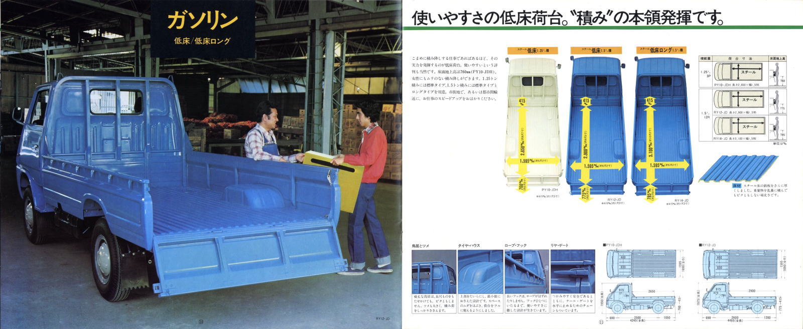 1971年にトヨタから発売された3代目トヨエース(PY/RY/JY型)です。3代目トヨエースは1979年まで生産され、このカタログは1977年のものですから、3代目とはいってもかなり熟成が進んだ時点でのカタログです。