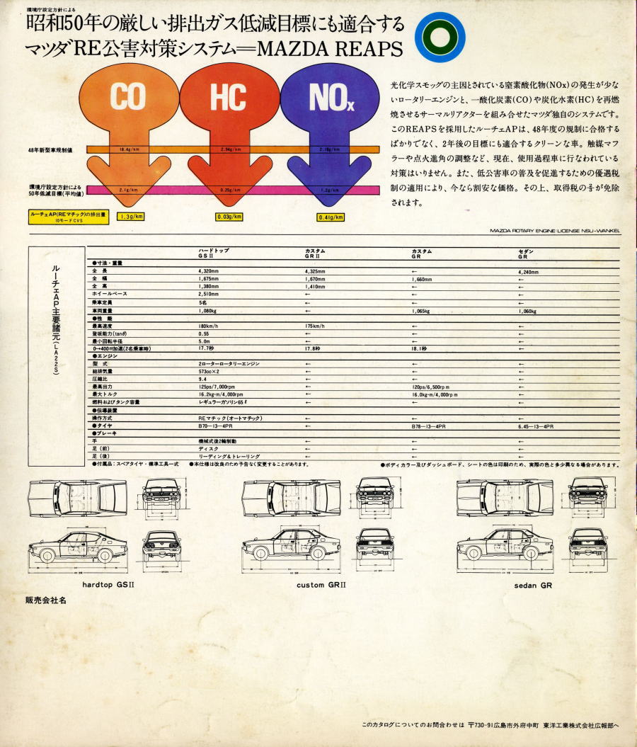 そんな中、マツダは他社に先駆けてマツダRE公害対策システム、「MAZDA REAPS」なるものを開発し、それを早々に搭載した車がこの2代目ルーチェです。面白いことに当時、マツダやホンダといったマイナーメーカーは排ガス規制対策を積極的に打ち出していたのですが、乗用車の7割を占めていたトヨタと日産は後手に回っていたようです。
