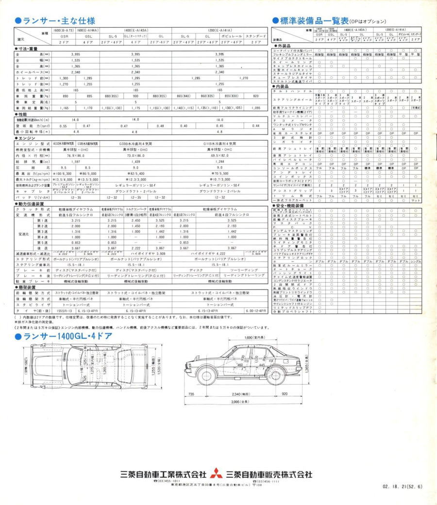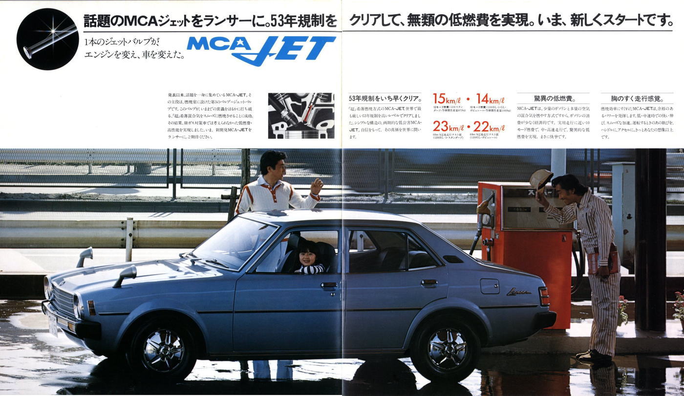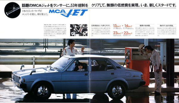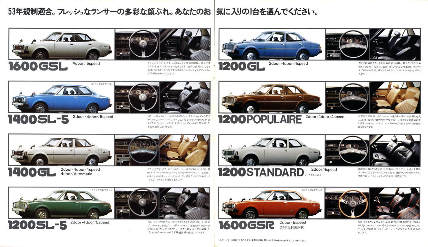 さて、この初代ランサー、個人的にはあまりカッコいいクルマだとは思っていませんでした。このカタログは1977年に発行されたもので、初代ランサーとしては最終型にあたります。1973年に登場した初期型ランサーもちょっと時代遅れで平凡なスタイルだなぁと思っていたのですが、マイナーチェンジでフロントグリルやテールランプのデザインが変わるたびに、さらに平凡なスタイルになっていきました。まあ感じ方は人それぞれですから、たまたま三菱の感性と私の感性が異なっていたんでしょうね。
