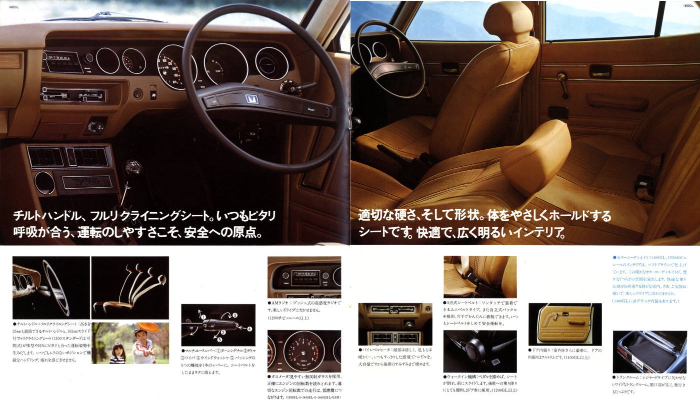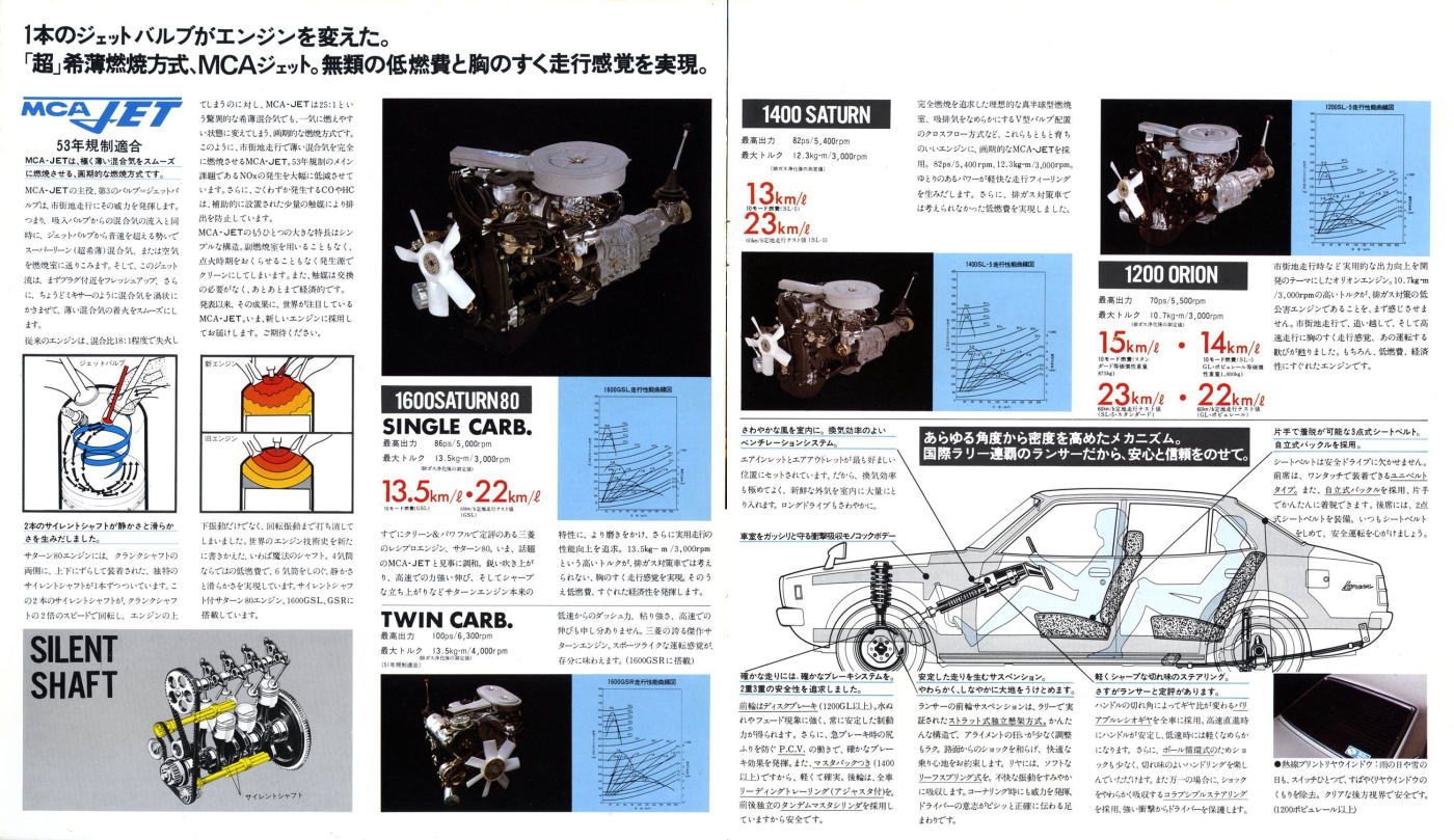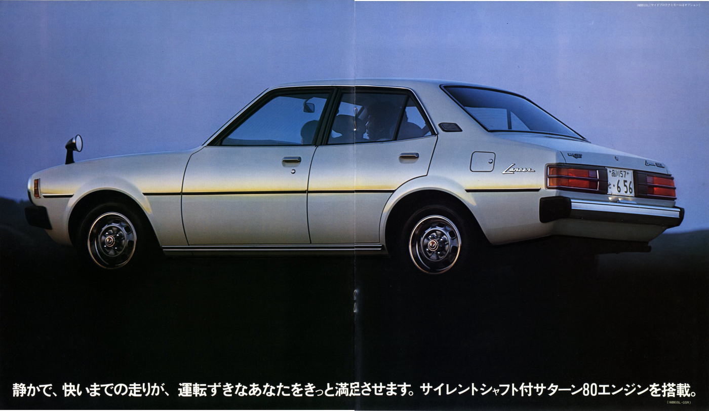 さて、この初代ランサー、個人的にはあまりカッコいいクルマだとは思っていませんでした。このカタログは1977年に発行されたもので、初代ランサーとしては最終型にあたります。1973年に登場した初期型ランサーもちょっと時代遅れで平凡なスタイルだなぁと思っていたのですが、マイナーチェンジでフロントグリルやテールランプのデザインが変わるたびに、さらに平凡なスタイルになっていきました。まあ感じ方は人それぞれですから、たまたま三菱の感性と私の感性が異なっていたんでしょうね。