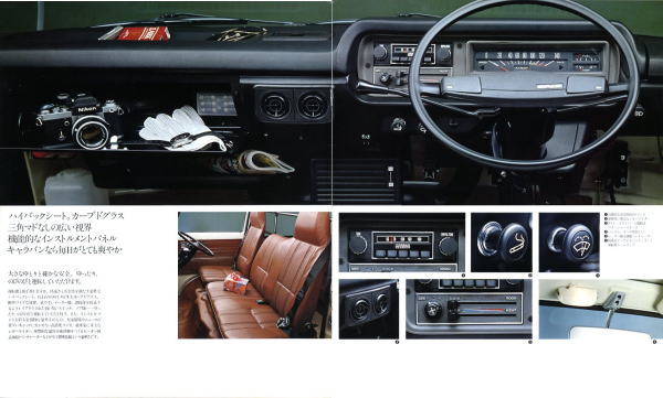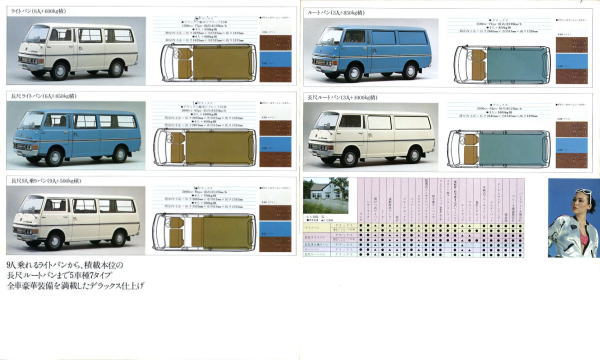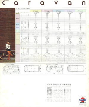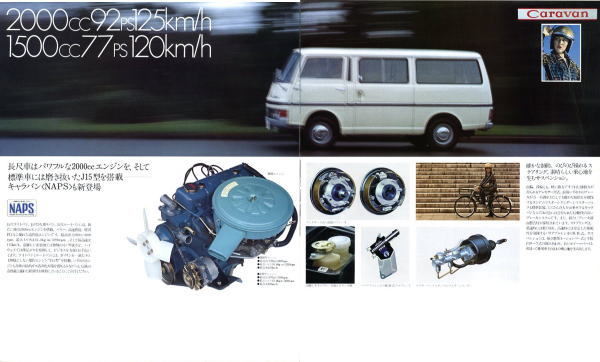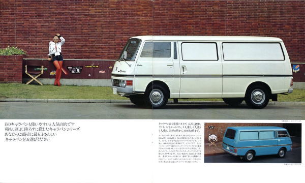 1973年に日産から発売された初代キャラバン(E20型)です。このカタログはバンのものですが、ワゴンであるコーチとマイクロバスも設定されていました。