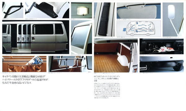 この初代キャラバン、ボディをぐるっと一周するモールが特徴的ですが、これはスライドドアのレールを目立たなくするためです。真っ白な壁に黒インクが跳ねてしまったら、インクを消すのではなくその部分を目立たなくするために黒インクで模様を書いてしまうという感覚ですね。しかしながらこのデザインはあまりカッコいいとは思えません。どことなく公的機関や病院のクルマに見えてしまいます。