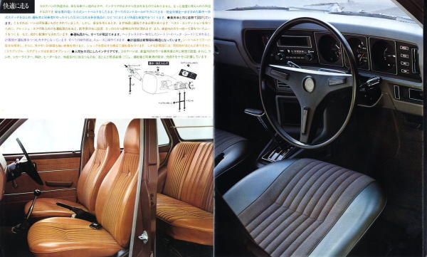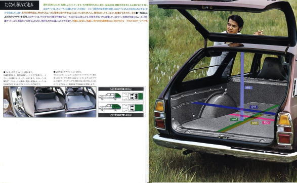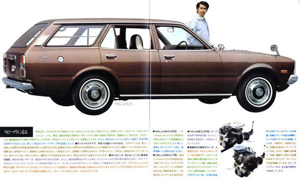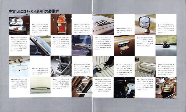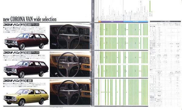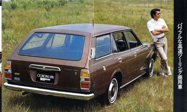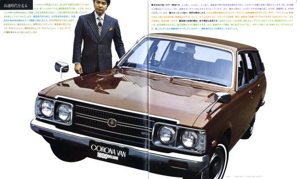 1973年にトヨタから発売された5代目コロナのライトバンバージョン、コロナバン(T106V/108V型)です。1973年というのは、関越自動車道、東名阪、西名阪等が高速自動車国道となった年ということもあり、このカタログでも至るところに「高速時代を走る」という類の文面が書かれています。