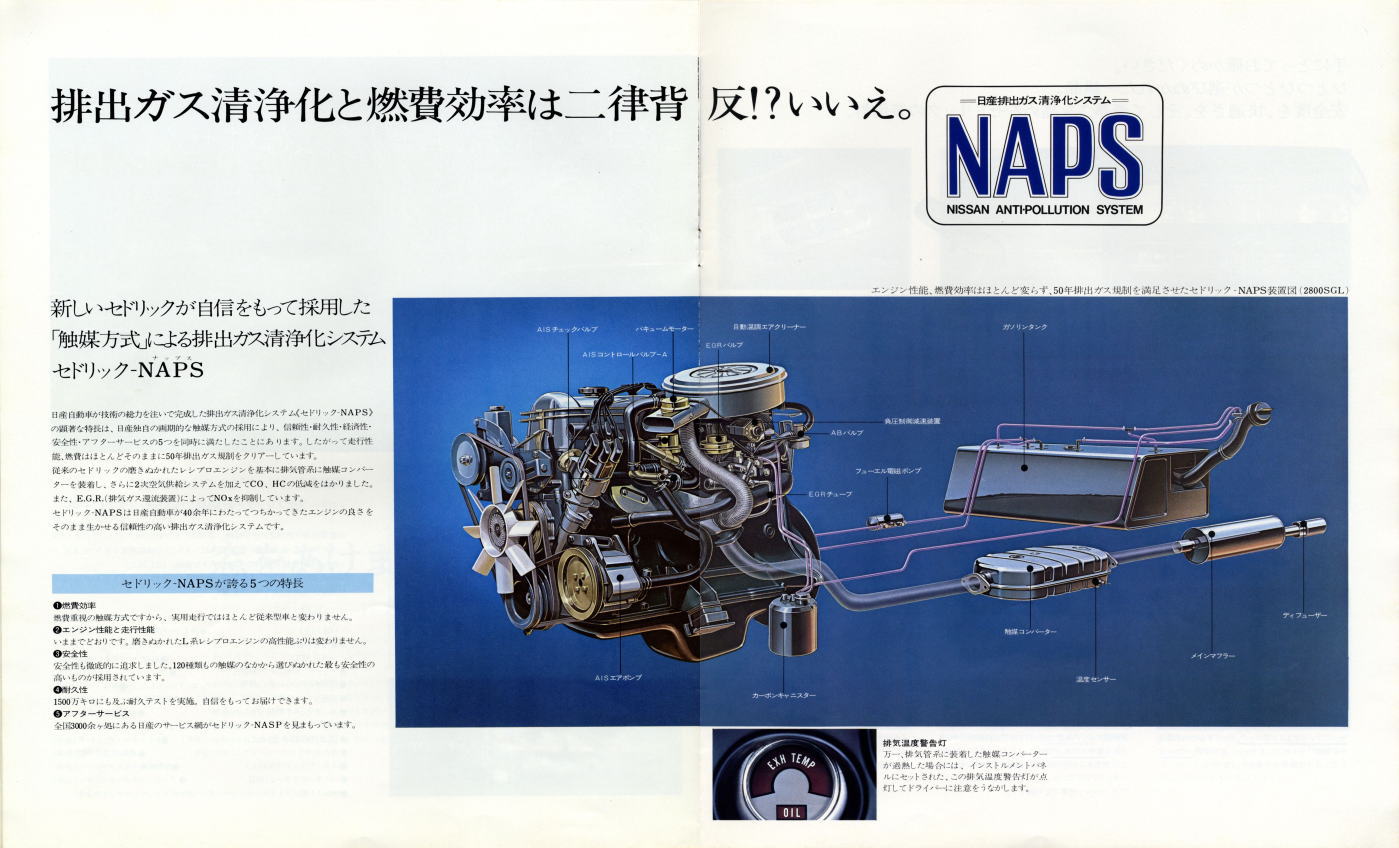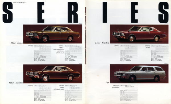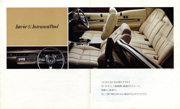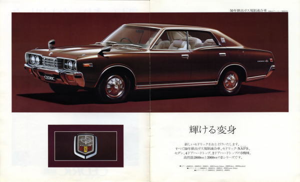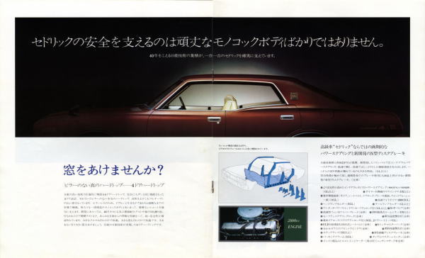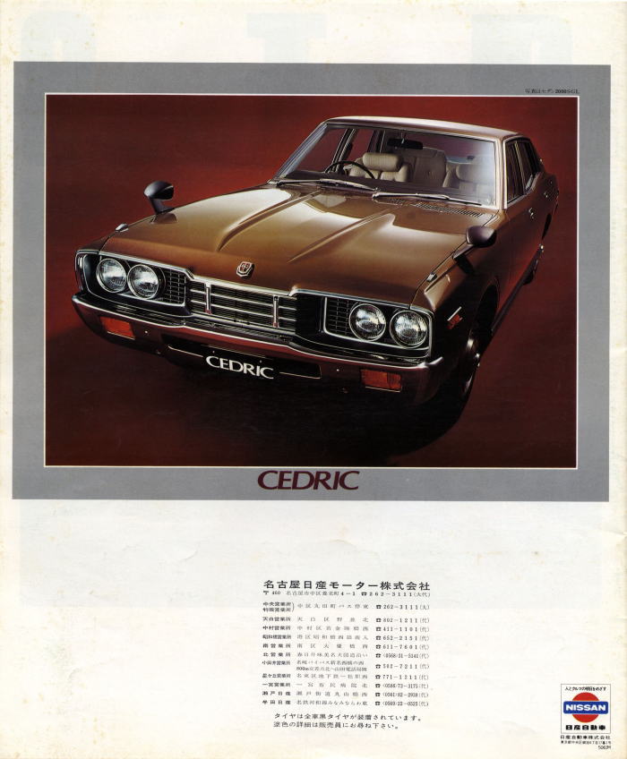 “ぜいを尽くした装備類。厳選されたシート。活動の、思索の、そして憩いの時をゆたかに演出するセドリックです。”ゆえに“これ以上なにをお望みですか?”が全文ですね。確かに当時の330セドリックは『これ以上なにをお望みですか?』というぐらいの高級車でした。しかし多くの人々が『さらにあれもこれも』と望んでいたようで、現在のフーガは当時の330セドリックとは比べようもないほどの超高級車になっています。いったいこの流れはどこまで続くんでしょうね?