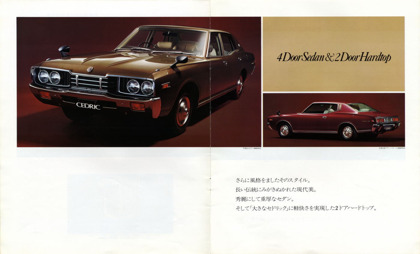 1975年に日産から発売された4代目セドリック(330型)です。330セドリックについては以前に本カタログのご紹介をしましたが、二谷英明夫妻が表紙のカタログが見つかりましたので、再度ご紹介させて頂きます。