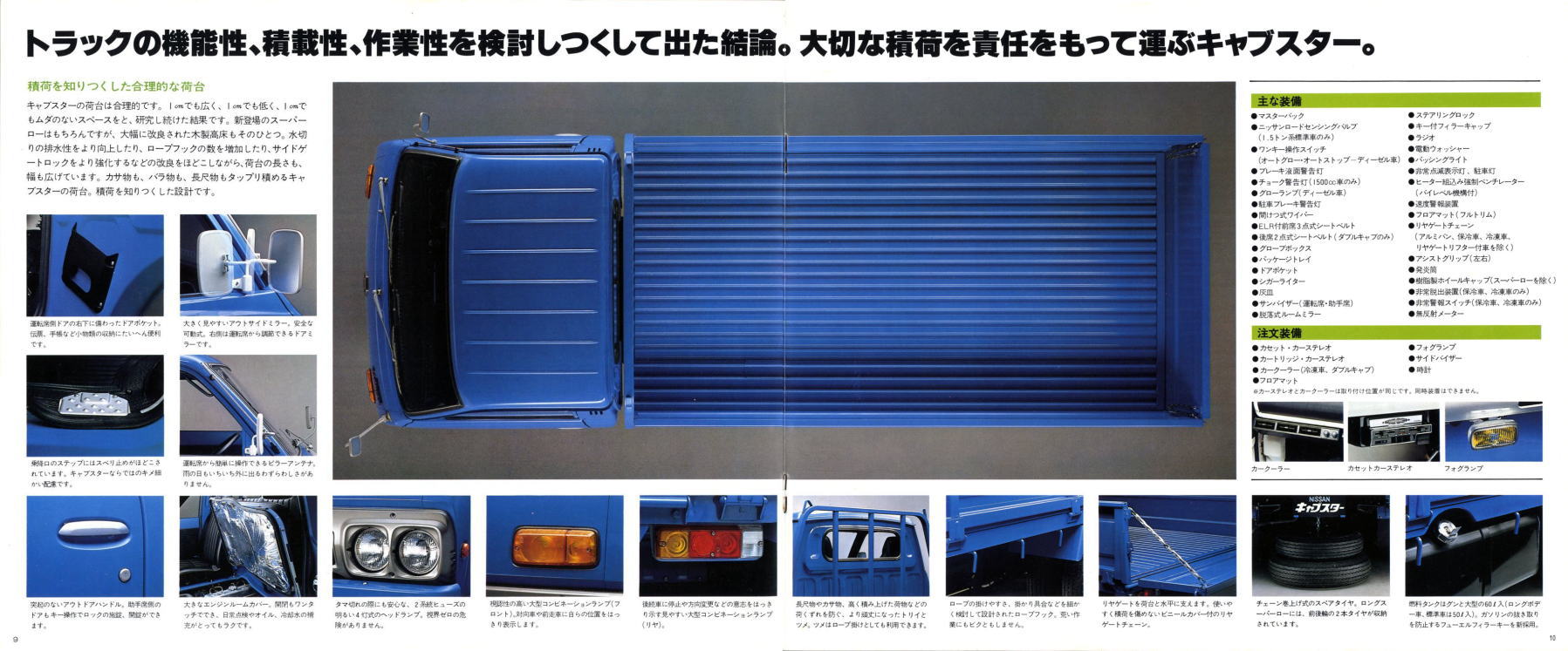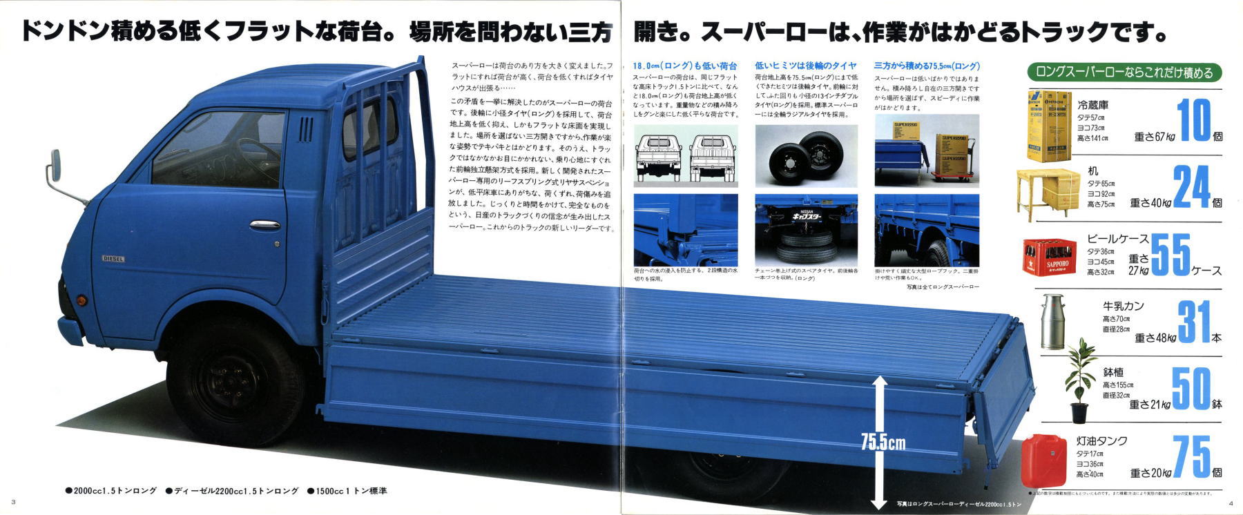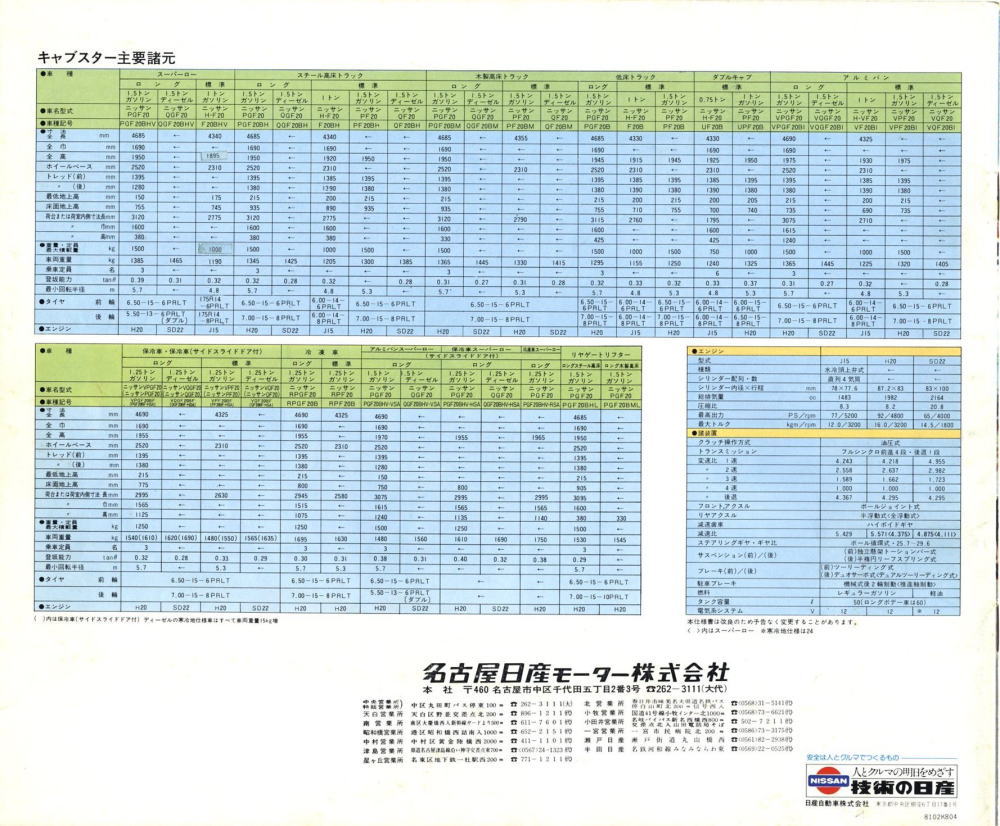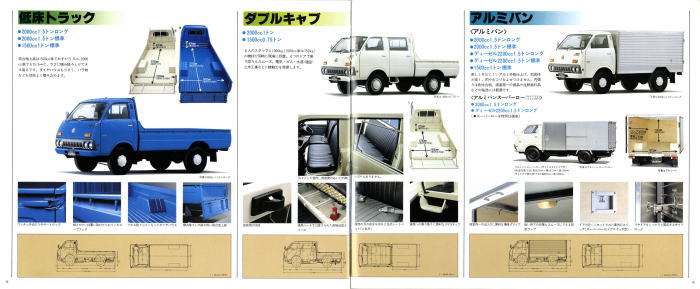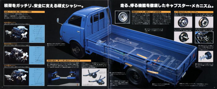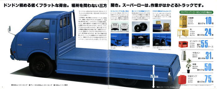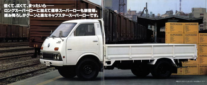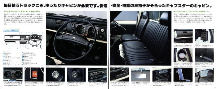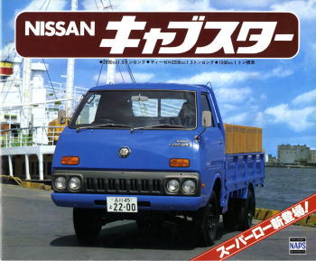 1976年に日産から発売された小型トラック、2代目キャブスター(F20型)です。このカタログは1978年に1トン積みスーパーローが追加されたときのもの。マツダのボンゴがこのクラスで小径ダブルタイヤの“まったいら”を設定してから、各社ぞくぞくと同様の“まったいら”を設定していきました。このキャブスターのカタログ、平仮名で“まったいら”と書いてあるあたり、完全にボンゴをパクっていますね。