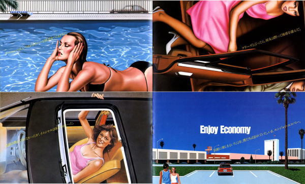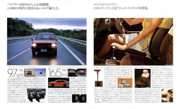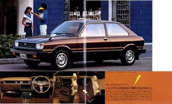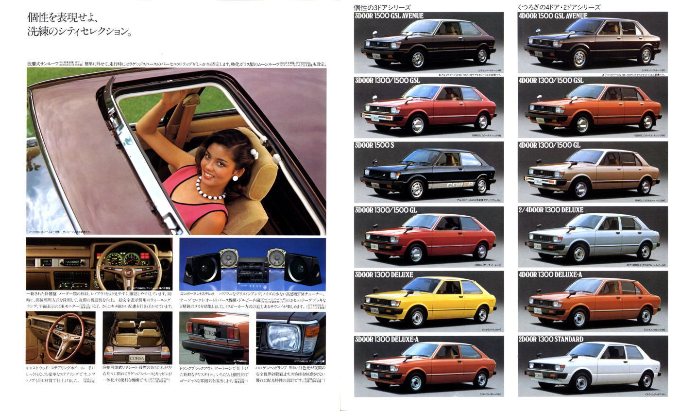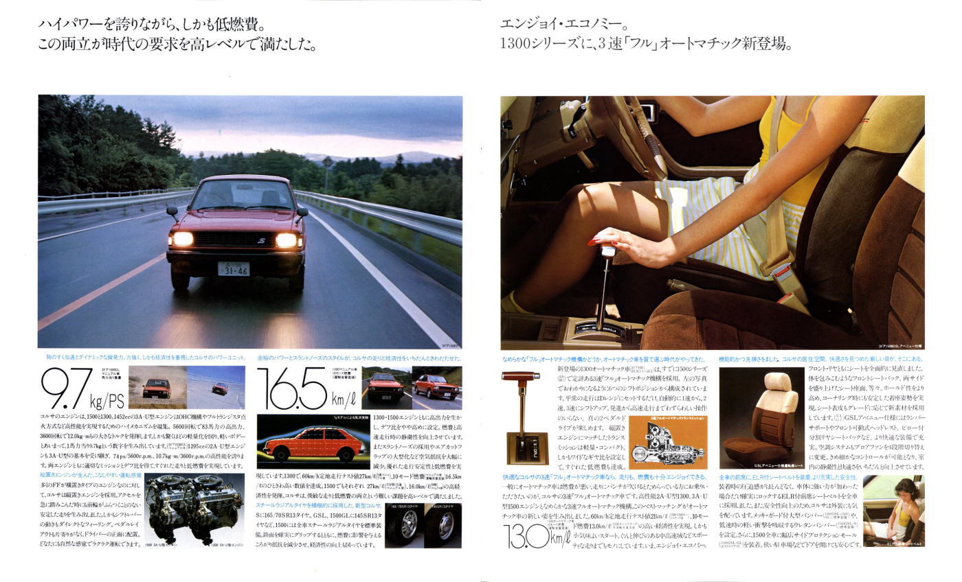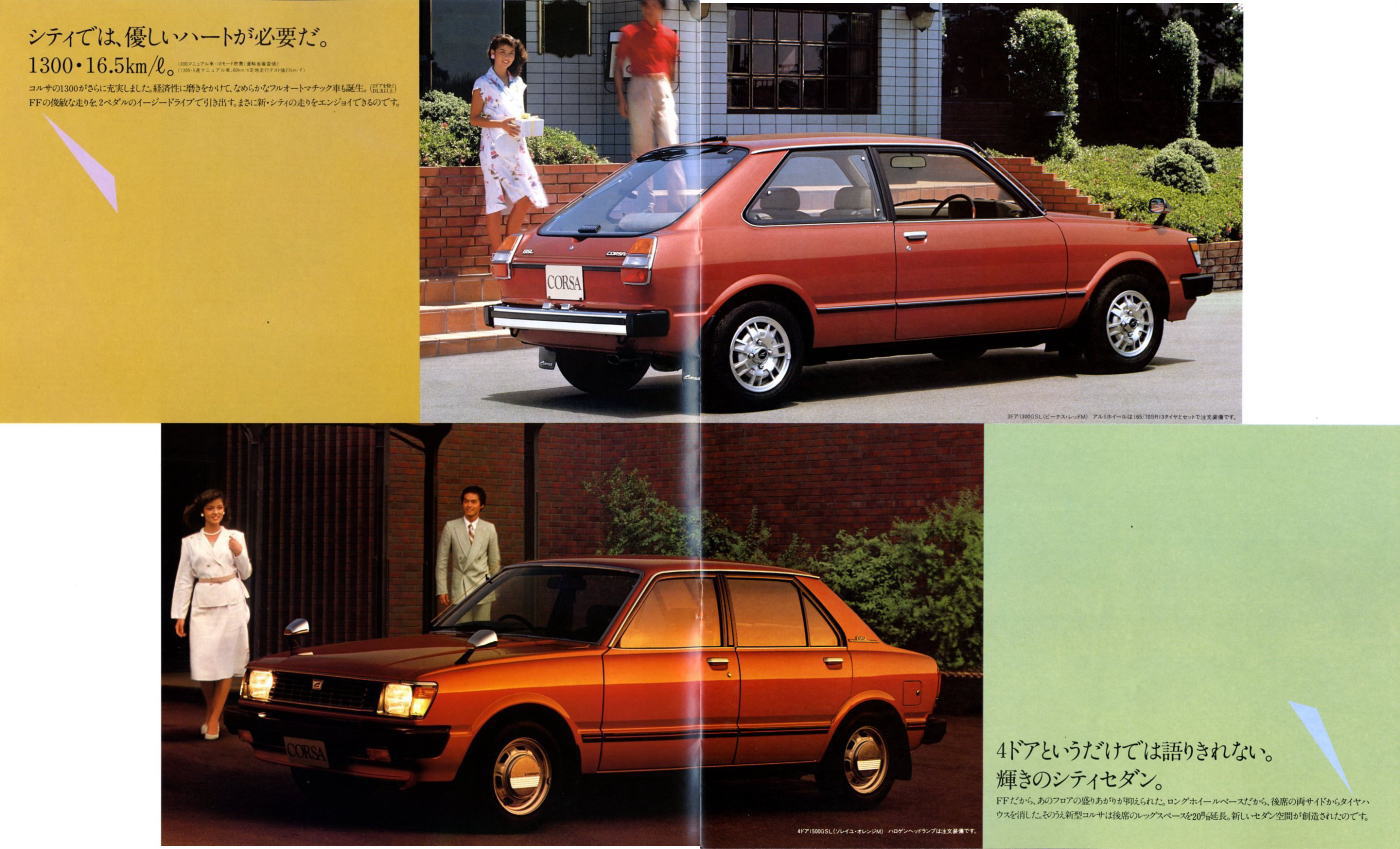 1978年にトヨタから発売された初代コルサ(AL10型)です。姉妹車ターセルとともに、トヨタ初のFF車として世に出されました。このカタログには載っていませんが、当時人気絶好調だった山口百恵さんがイメージキャラクターとなり、“百恵の、赤い靴。”というキャッチフレーズで紹介されていましたね。山口百恵さんも素敵ですが、このカタログの4枚目画像、左下のピンクのタンクトップを着たお姉さんのイラスト、ノーブラ乳首の透け具合もなかなか素敵です。