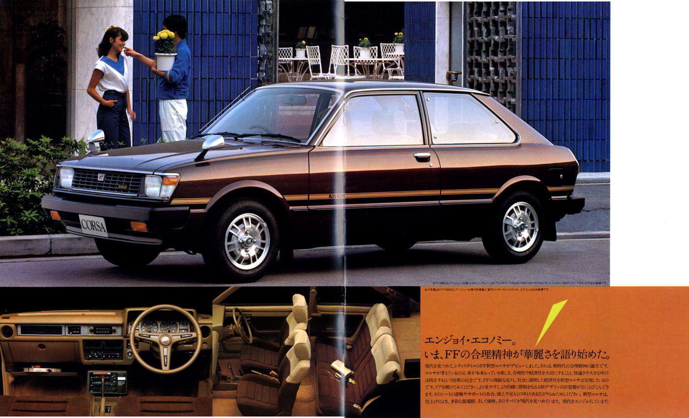 さて、このコルサ、縦置きエンジンFF車という、現在の感覚ではちょっと珍しいスタイルのクルマですが、カタログの至るところに記載されている通り、キーワードは“エンジョイ・エコノミー”です。なんでも“新時代の合理精神の誕生”とのことで、“車が本来もっている楽しさ、合理性や経済性を大切にすることと、快適さや大きなゆとりは両立するという技術の信念”を実現したクルマだそうです。