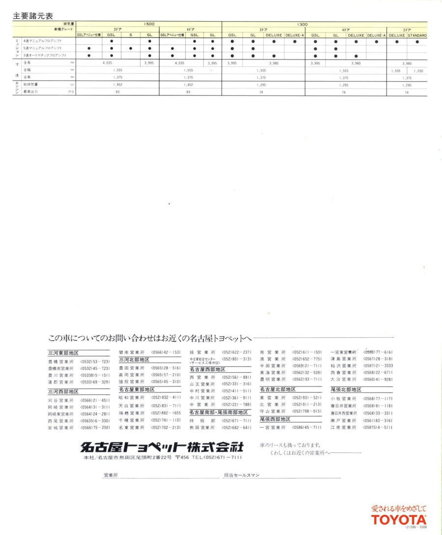 このカタログは30年以上前のものですが、なんだか書かれている内容が現在でもそっくりそのまま当てはまりそうですね。そんなことを考えながらこのコルサのカタログを眺めていたら、全長4メートル程のコンパクトなボディにも関わらず2,500mmというロングホイールベースというのは、現在人気のコンパクトカーとほぼ寸法が同じであることに気付きました。(ヴィッツ:3885mm・2510mm、フィット:3900mm・2500mm、ちなみに当時のカリーナが4230mm・2500mm)
