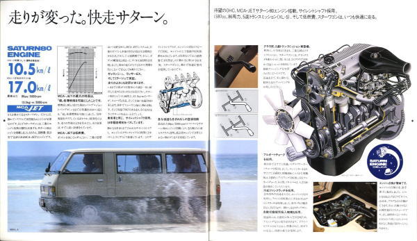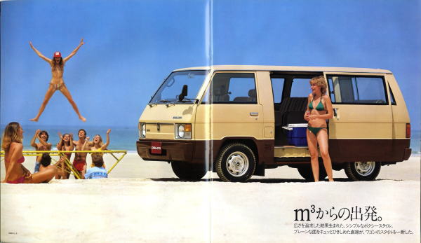 そんな「硬派な」イメージがある三菱デリカですが、このカタログは実に「軟派」です。メカニズム主義の三菱らしくF1とのツーショットや詳細な性能解説ももちろんあるのですが、極小ビキニの女性がなんと数多く写っていることか。