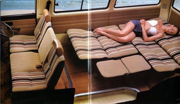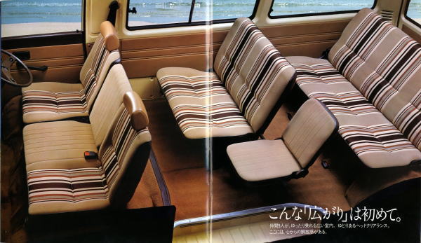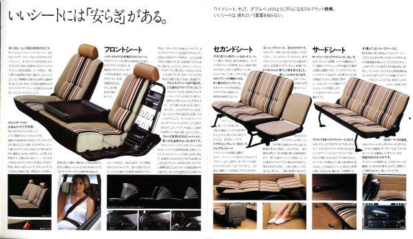 5枚目と6枚目の画像を見てください。5枚目画像の右ページが折込ページとなっており、それを開くと現れるのは「好きにしてください」といわんばかりの格好で無防備に横たわる美女。カタログコピーにもあるように、確かに『こんな「広がり」は初めて。』です。なんとも男の本能を刺激するストレートなカタログですね。きっとこのカタログを見てデリカを購入し、『こんな「広がり」』を堪能した男性が大勢いることでしょう。