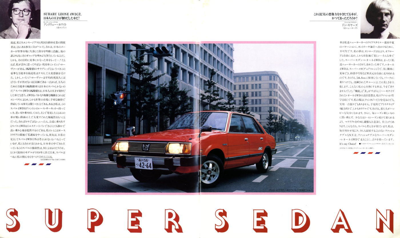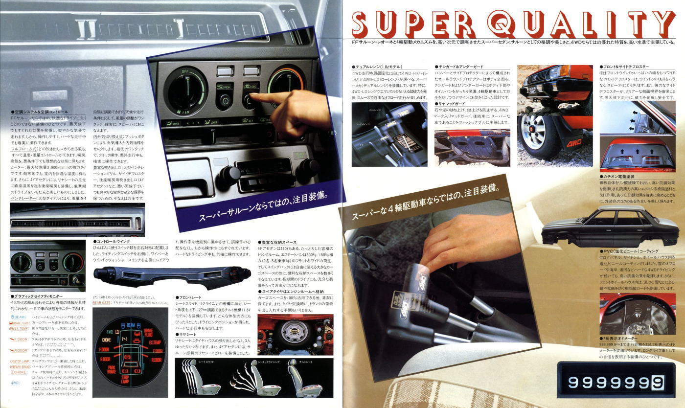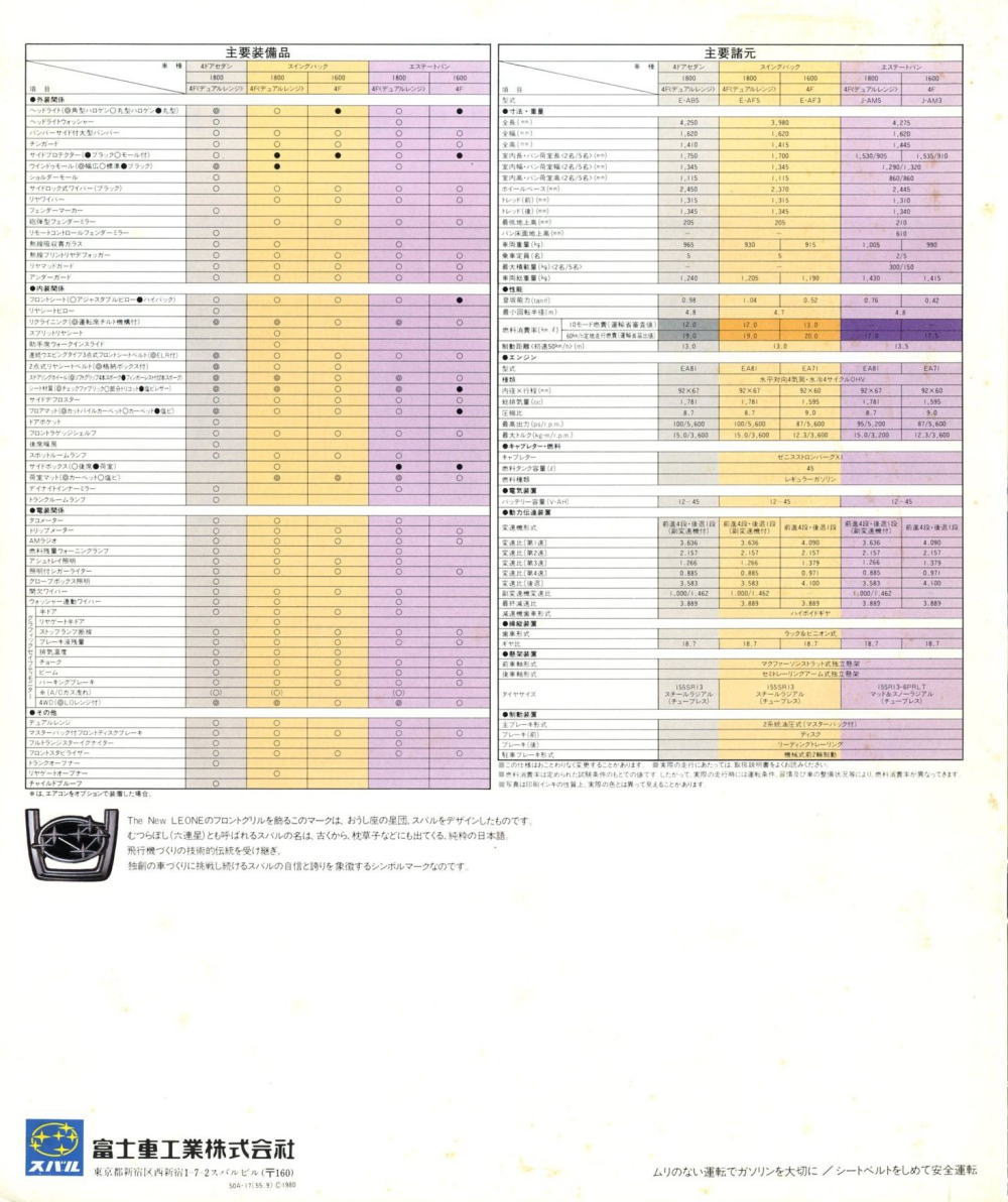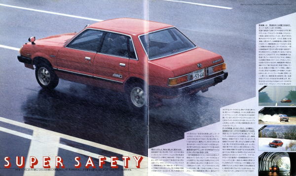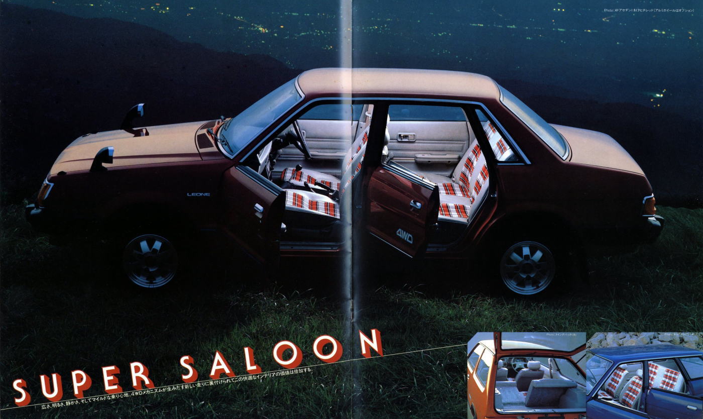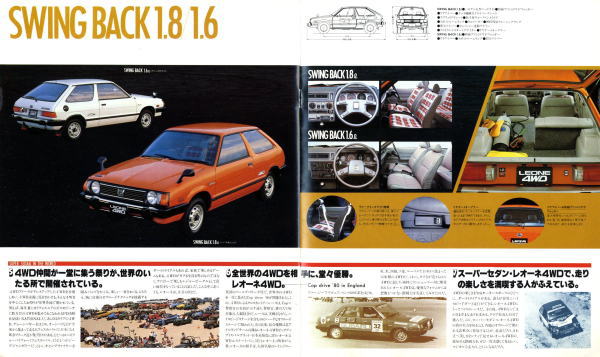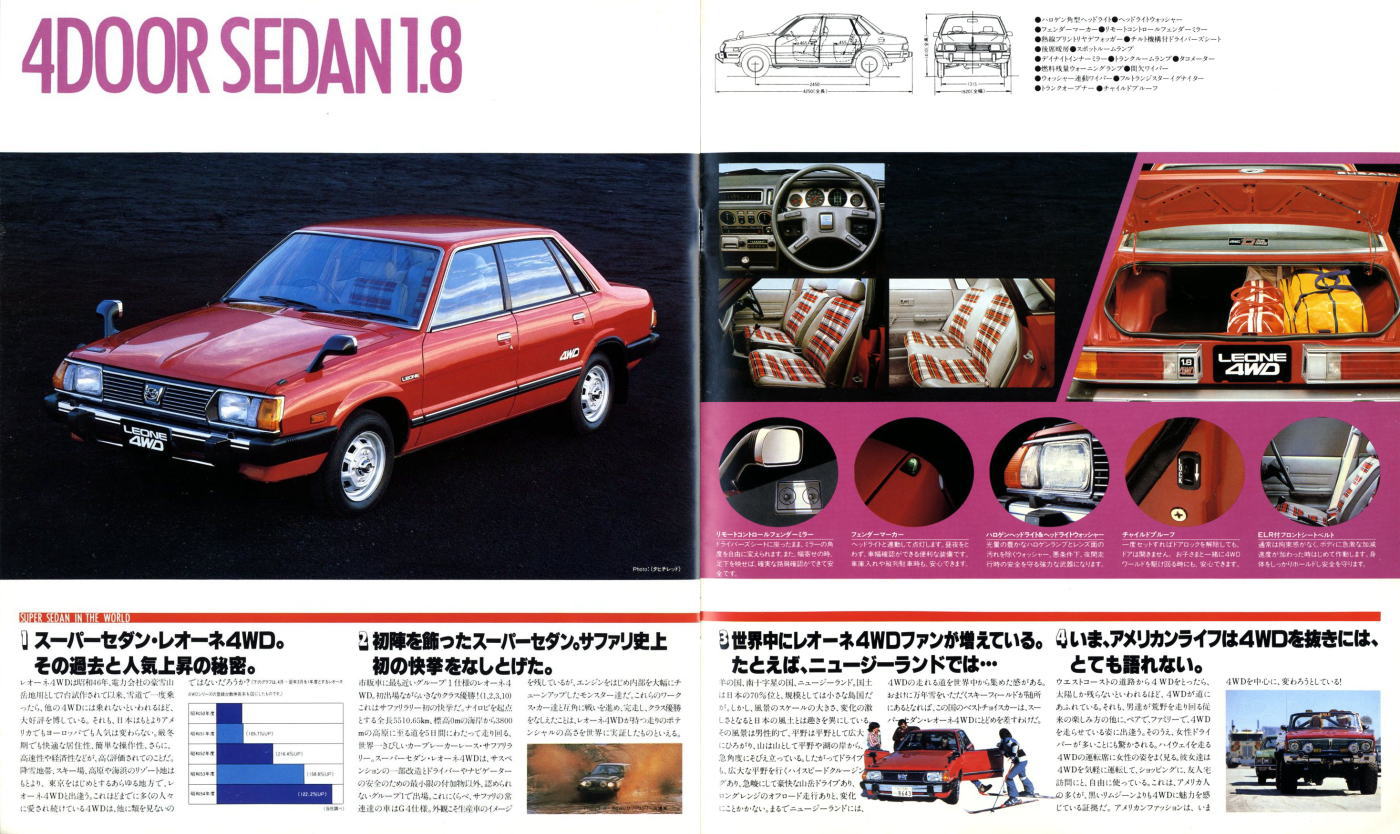 1979年にスバルから発売された2代目レオーネ4WD(AF/AB/AM型)です。このカタログは前期型4WDのものなのでセダン、スイングバック、エステートバンしか紹介されていませんが、これらの他にFFの2ドアハードトップ、そしてマイナーチェンジ後にはツーリングワゴンが加えられ、とても多彩なラインナップが展開されていました。もちろんこのカタログで紹介されているボディタイプにもそれぞれに1.6Lと1.8LのFFが用意されていましたから、バリエーションの豊富さはすごいものですね。