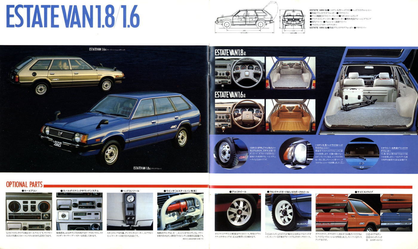 さて、私にとっての“スバル”とはこの型のレオーネです。このカタログを見ていると、現在のレガシィ、インプレッサ、フォレスター、エクシーガが全て集約されているかと錯覚してしまうほど“スバル”が詰まっていますね。サファリラリーの走行シーンは現在のインプレッサWRXそのものですし、エステートバンはレガシィツーリングワゴンやアウトバック、フォレスター等が自然と連想されるような姿をしていますね。それにオプションパーツとして紹介されているエステートバン専用のウインチを見ると、初代エステートバンの開発経緯がもともと東北電力から四輪駆動のバンを造って欲しいという要請があったから、というエピソードが思い出されますね。SUV色を強めた現行フォレスターにはこの電動式ウインチ、よく似合いそうです。