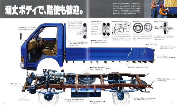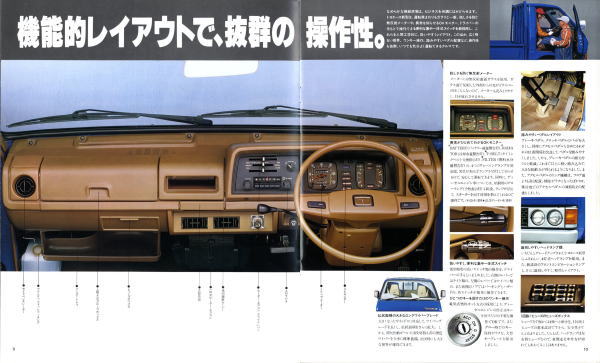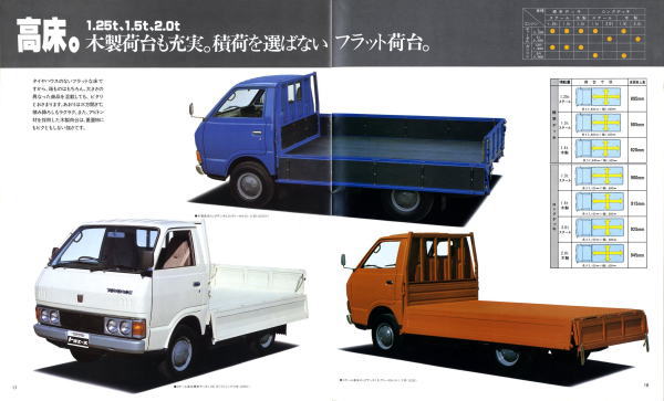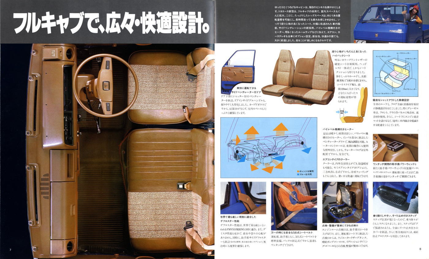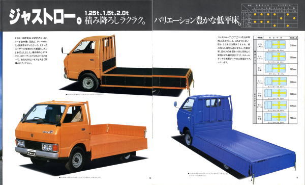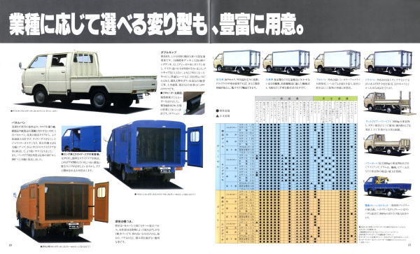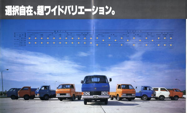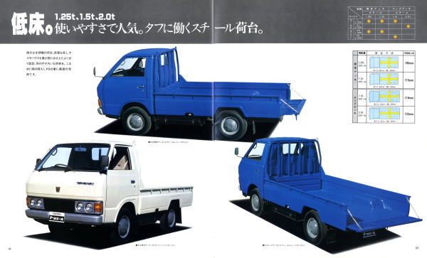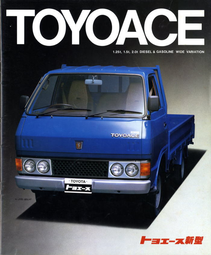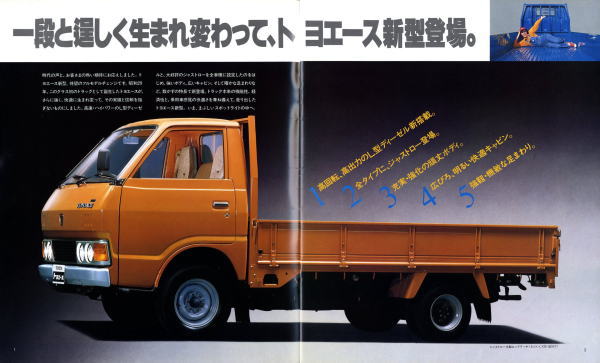 1979年にトヨタから発売された4代目トヨエース(Y20/30型)です。先代まではセミキャブオーバータイプでしたが、この代からキャブオーバータイプに変更されましたので、現在のトラックに慣れた目で見ても特に違和感は感じませんね。とはいえ、標準設定色にオレンジ色が設定されている点には違和感を感じます。この代のトヨエース、青と白はよく見かけたのですが、オレンジ色は一度も見たことがありません。販売比率はどれぐらいだったんでしょうね。