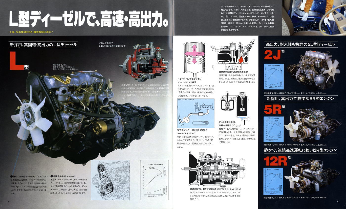 さて、このトヨエース、仕事でよく乗っていました。カタログでも大きく紹介されている『新採用、高回転・高出力のL型ディーゼル』モデルです。トヨエースとして運転している分にはそれなりに可もなく不可もなくのエンジンだと感じていたのですが、このL型ディーゼルエンジンは同時期のマーク2やクラウンにも搭載されていました。