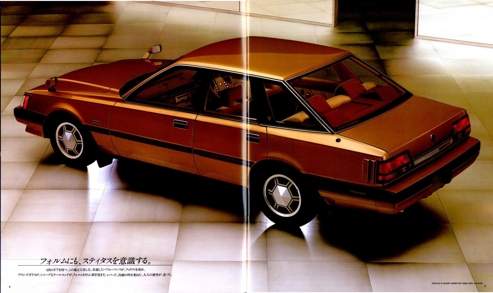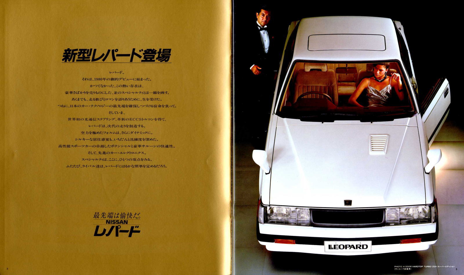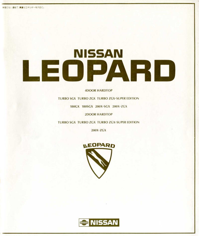 1980年に日産から発売された初代レパード(F30型)です。このカタログは83年に発行されたもので、直6・2.8Lがラインナップから外され、V6・3Lターボが追加される前の時期にあたり、3ナンバーグレードが存在しないちょっと中途半端なものです。ちょうどライバルであるソアラにその差をどんどん広げられていた時期のものですね。
