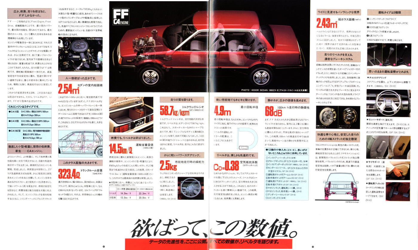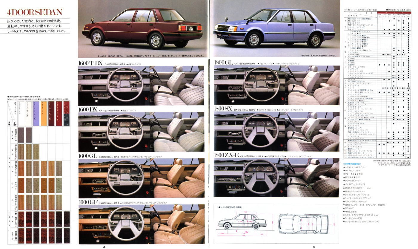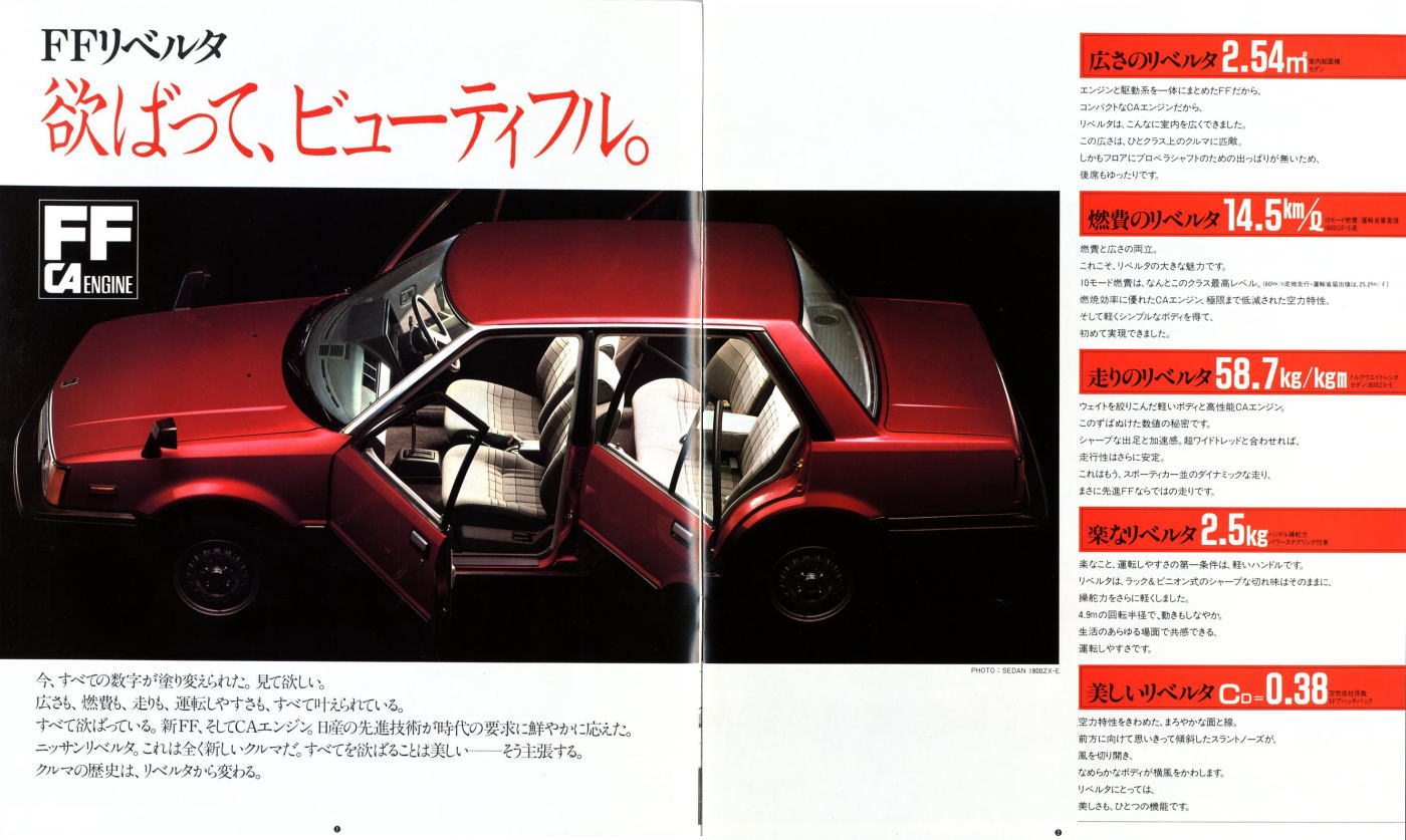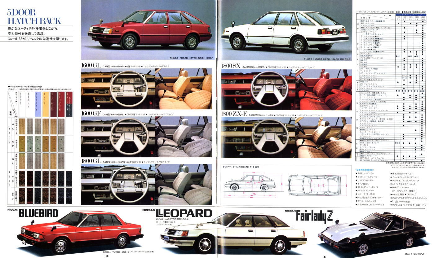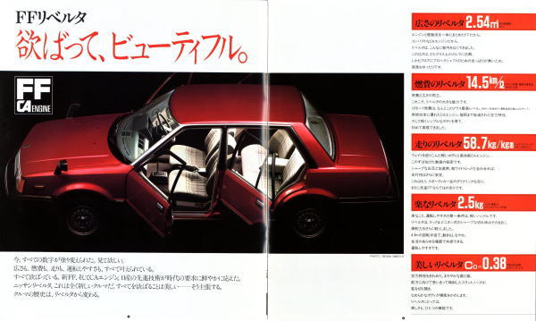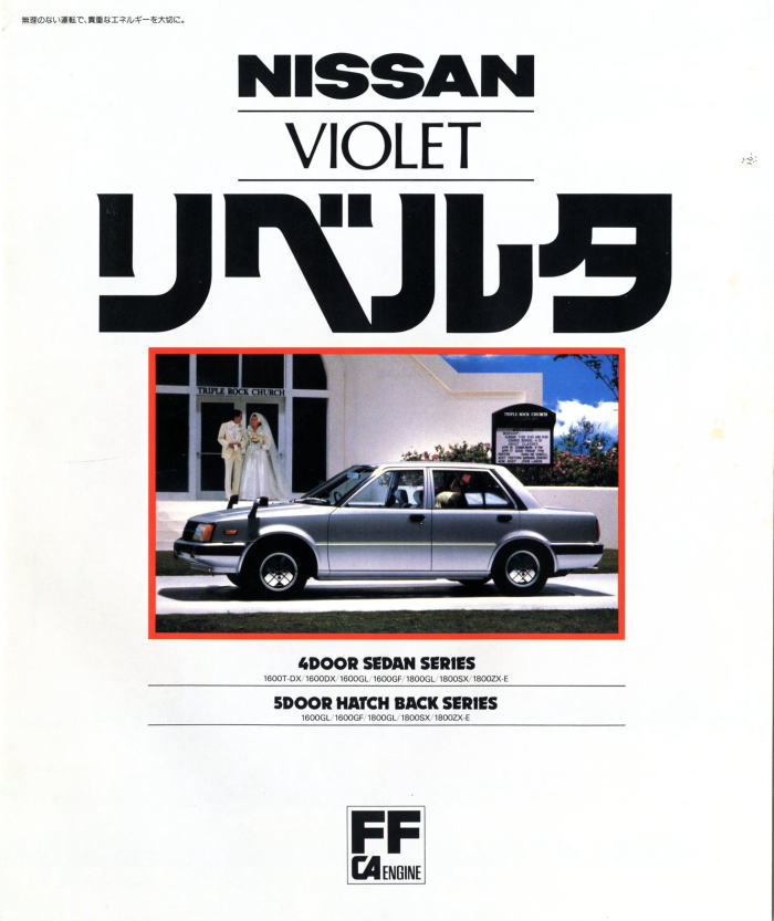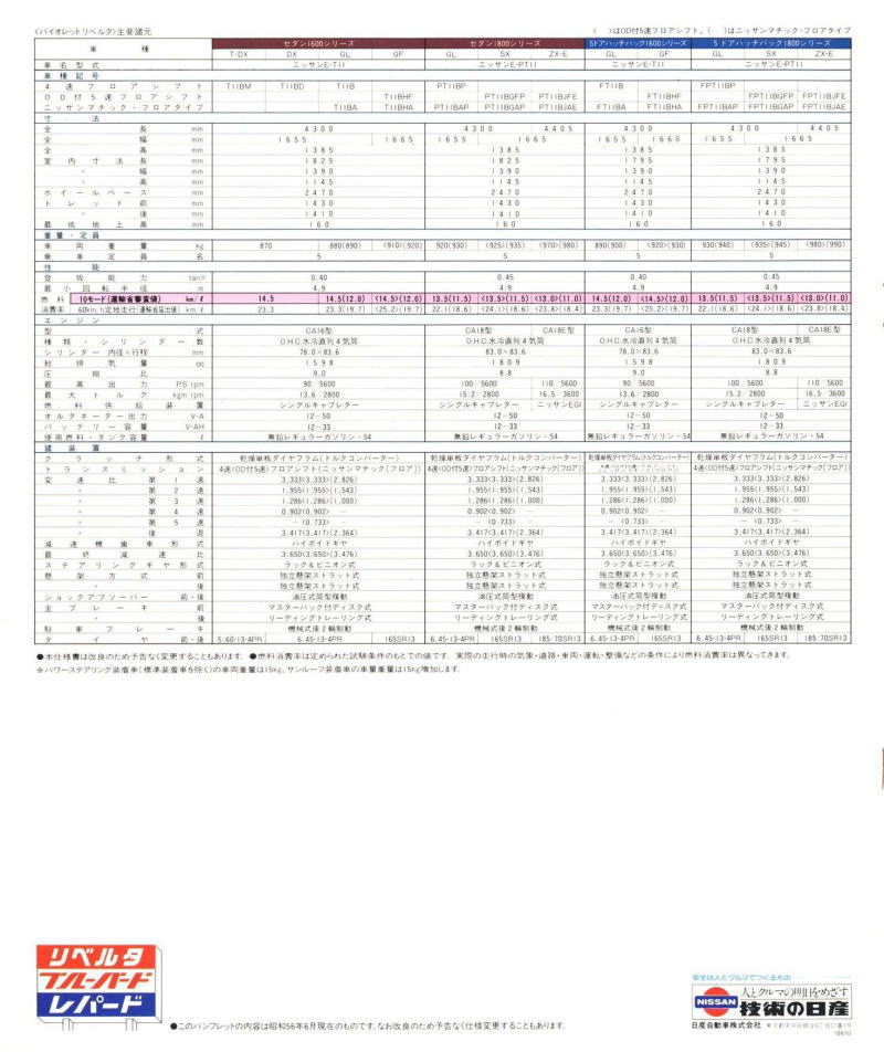 このカタログは販売店の総合カタログではなく、バイオレットリベルタ単独のカタログにも関わらず、なぜか最後のページには日産を代表するカッコいい大御所3台、ブルーバード・レパード・フェアレディZが静かに鎮座しているんですよね。FF化のメリットをこれでもか、というほど連呼した挙句に、FRの、それもバイオレットリベルタよりも数段カッコいい大御所3台を並べるセンスが私には理解できません。特にこの中の910型ブルーバードとは、車格も価格帯もかぶっています。私ならバイオレットリベルタ購入を中止して、910型ブルーバードの商談に入ると思います。