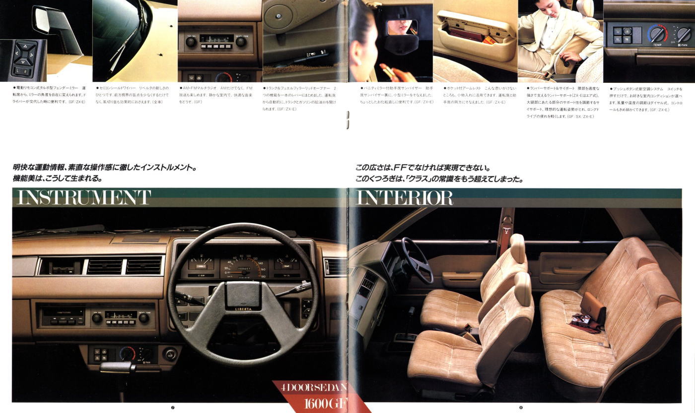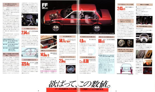 このカタログ、あらゆるページのあらゆる部分でFF化のメリットをくどいぐらいに紹介しています。じっくり読んでいくと、それほどカッコいいとは思えないバイオレットリベルタでも、なんだかとても走行性能が良くて使い勝手の良い素晴らしいクルマに思えてきます。セダンも端正なスタイルで素敵!5ドアハッチも使いやすそうで素敵!と徐々にバイオレットリベルタの魅力にノックアウトされそうになっていくのですが、最後のページで我に返ることになります。