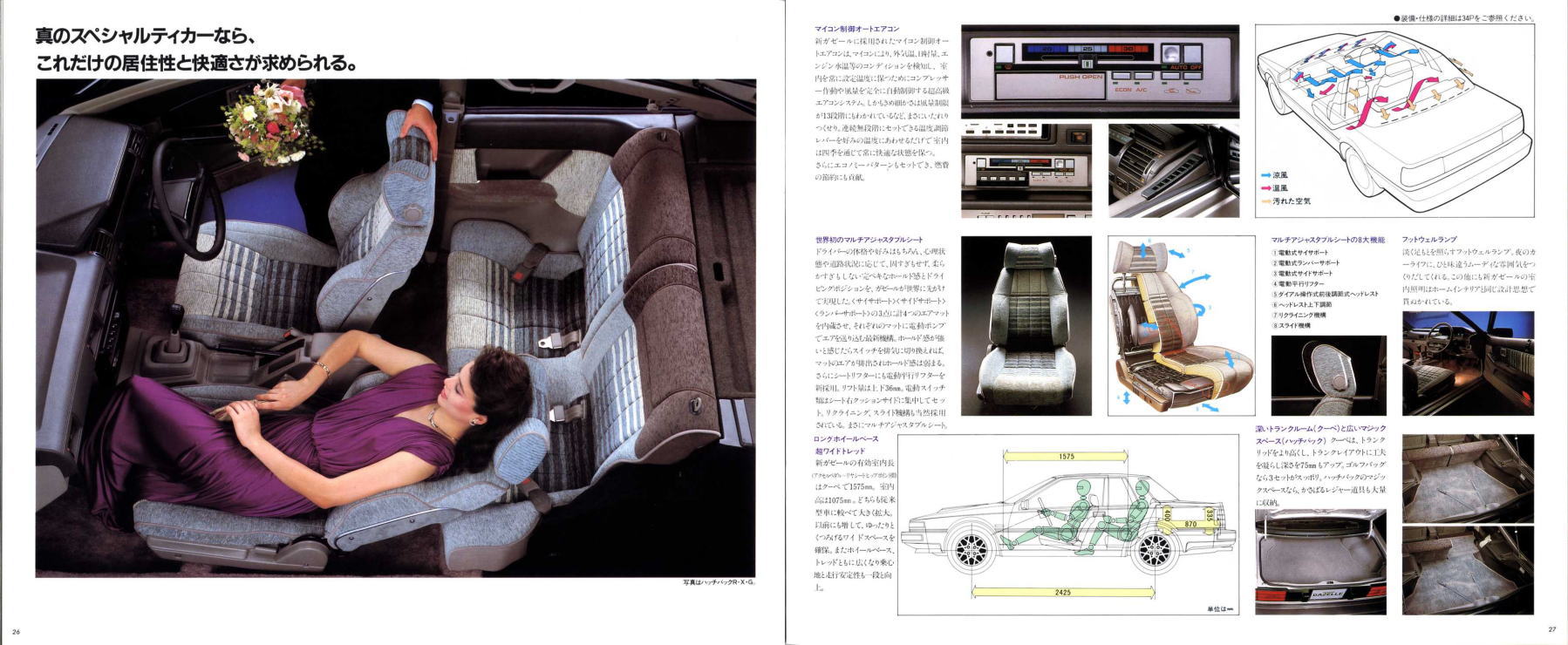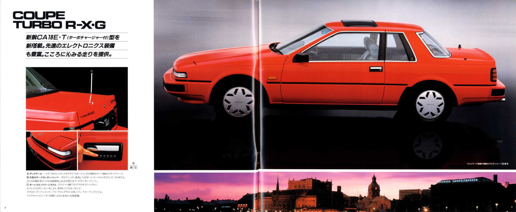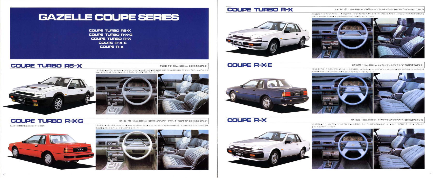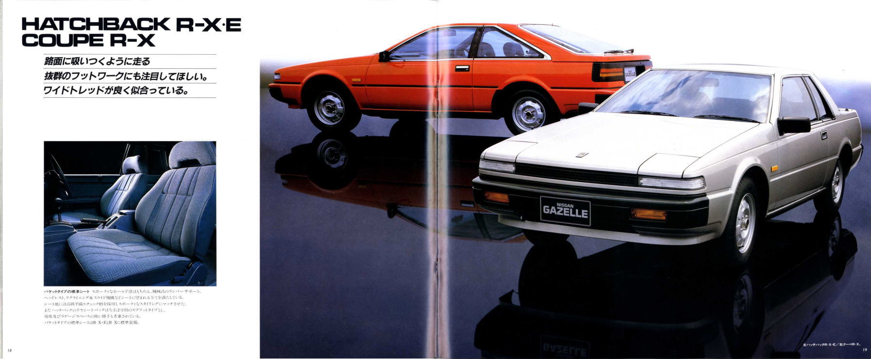 さらにキーレスエントリーシステムは、「マイクロコンピューター技術による日本初の先進装備」だそうです。このガゼールのキーレスエントリーは、パワーウインドウの下降やトランクオープンまでできるようです。カタログ写真によると、運転席のドアノブ部分にいろいろなボタンが付いており、それによって操作するようなので、現在のキーレスエントリーシステムとはちょっと雰囲気が違いますね。今ではほとんどのクルマに付いているキーレスエントリーですが、日本初はこのガゼール、このような「日本初」が本当の意味でのセールスポイントのような気がしますね。