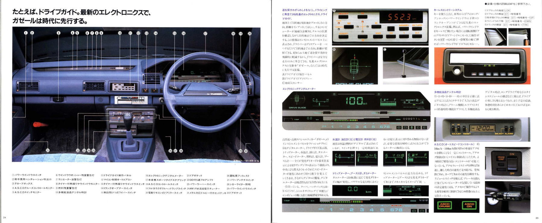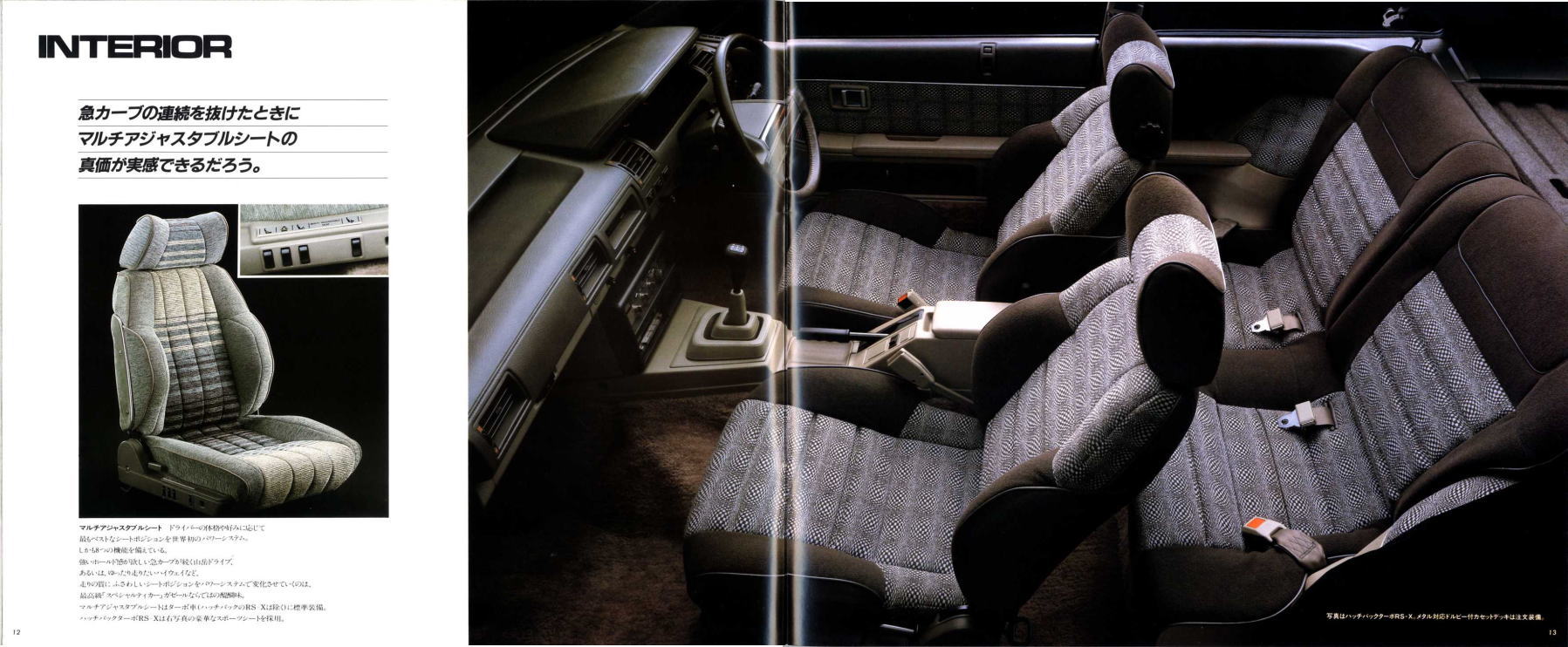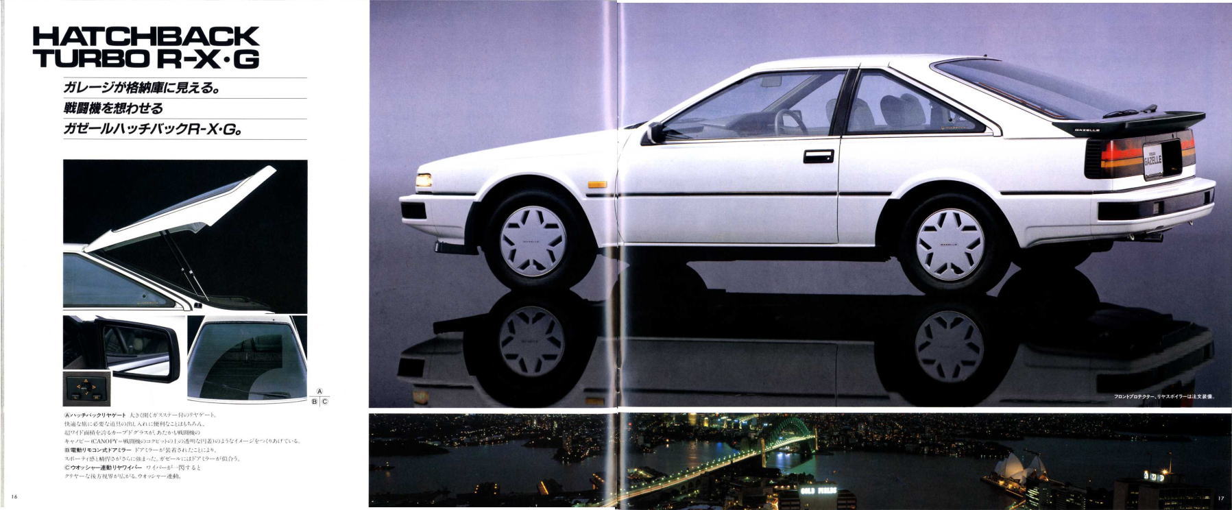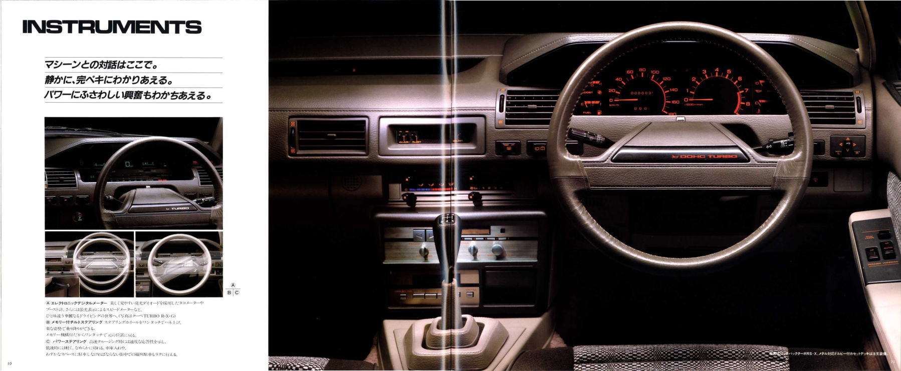 さて、この2代目ガゼール、クルマとしての売りはもちろん高性能ターボエンジン搭載による走りの良さなのですが、それ以外にも面白いセールスポイントがたくさんあります。まずヘッドライト、カタログによると、「フルリトラクタブルヘッドランプにワイパーがついたのは世界初」とのことです。ガゼールが世界初なら、世界2番目、3番目はどんなクルマだったんでしょう。少なくとも国産車では存在しなかったような気がします。2番目、3番目がない「世界初」って、セールスポイントになるのかどうかちょっと疑問ですね。とはいえ、ピョコっと上がったヘッドランプを小さなワイパーがシュッシュッと拭き取る様は鳩時計みたいで面白そうですね。