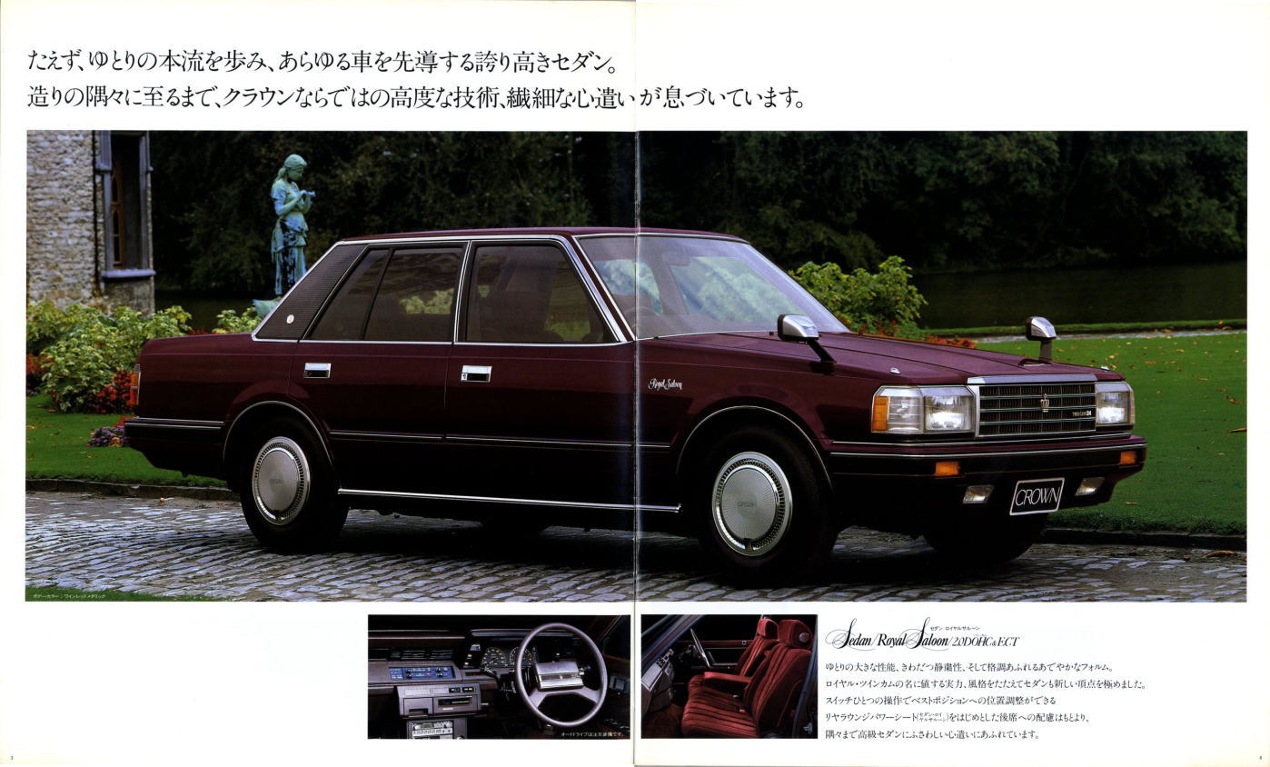 1983年にトヨタから発売されたクラウン(S120系)・2000シリーズ、いわゆる“5ナンバークラウン”の専用カタログです。当時は3ナンバーのクラウンと言ってもバンパーが拡大されて寸法が大きくなっていただけですので、この5ナンバー枠に収まっているクラウンを見ても全然違和感は無く、どこからどう見ても“クラウン”してますね。