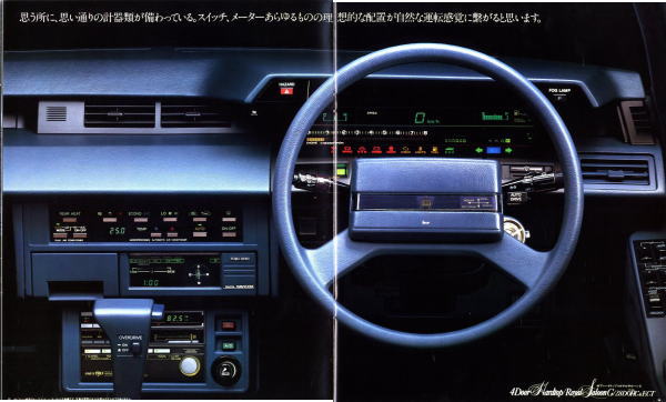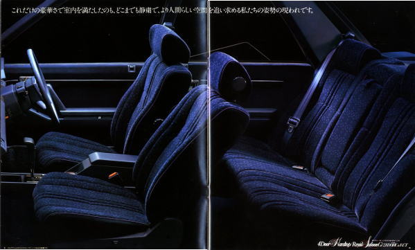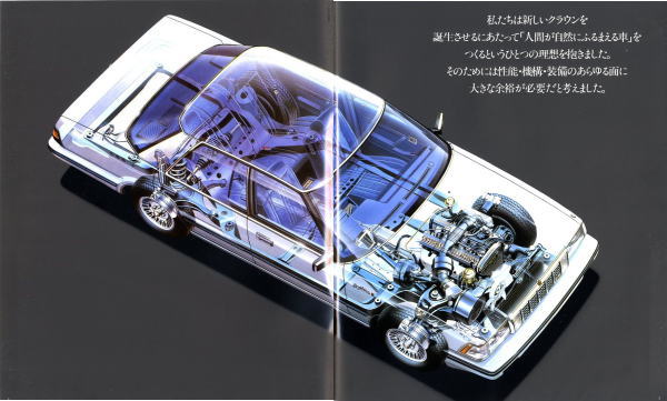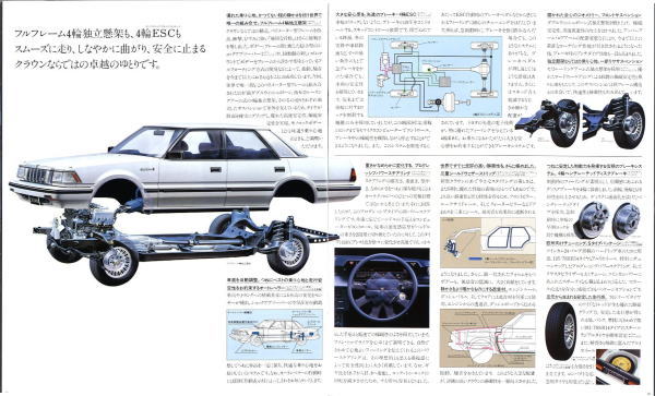 同時期に発売されたライバルのセドリックは国産車初のV6エンジン搭載というトピックがありましたが、このMS120型クラウンは基本的にキープコンセプトのモデルなのでどこからどう見てもクラウンですね。外観上の目立つところといえば、クリスタル・ピラーと称する樹脂で化粧したCピラーがアクセントになっているぐらいで、きわめて保守的なジャパニーズ高級車・クラウンです。