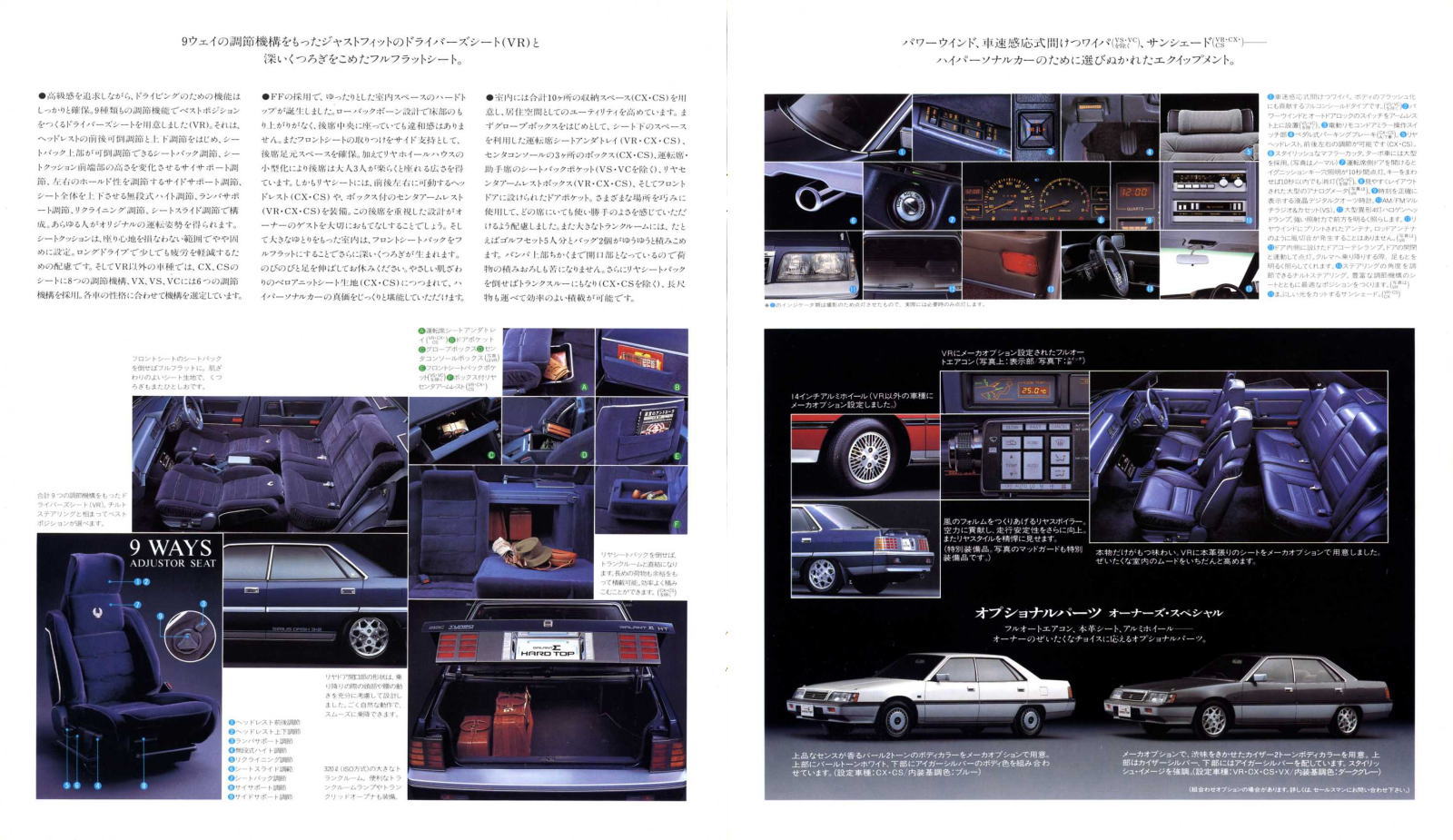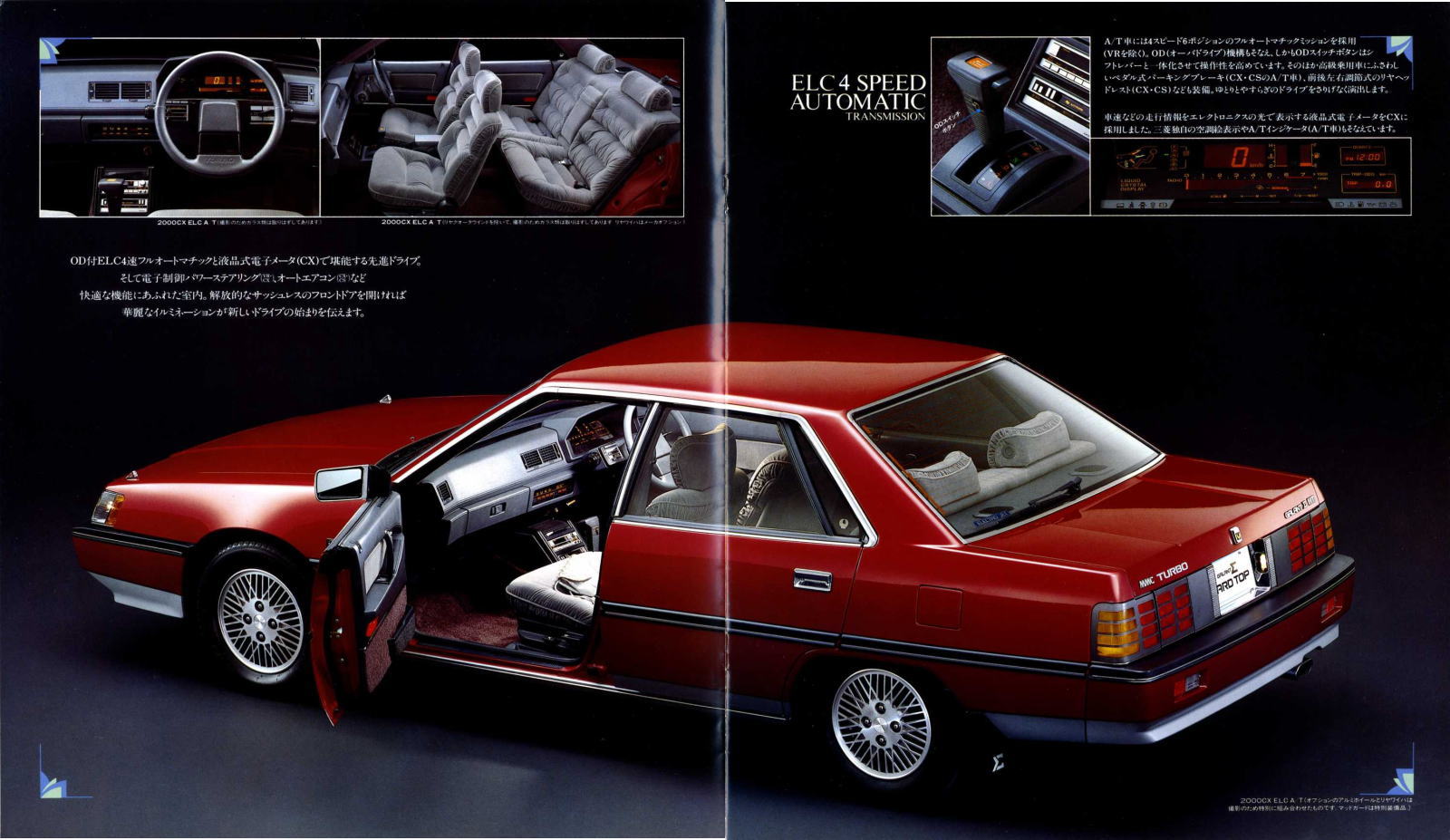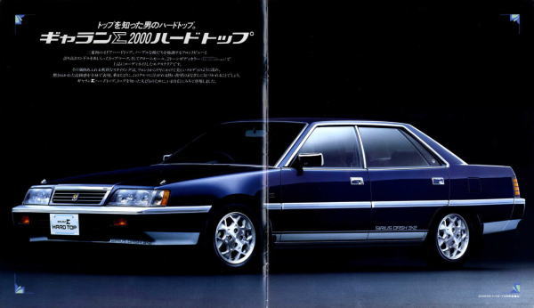 さて、このギャランΣハードトップ、カタログでは冒頭に「トップを知った男のハードトップ。」と、なにやらわかるようでわからない形容が使われている通り、いまいち方向性がよくわからないクルマでしたね。三菱曰く、「ノーブルな顔立ちを強調」し、「上品にコーディネイトしたエクステリア」の「風格あふれる斬新なスタイリング」で「磨きぬかれた高級感を全身で表現」したようです。