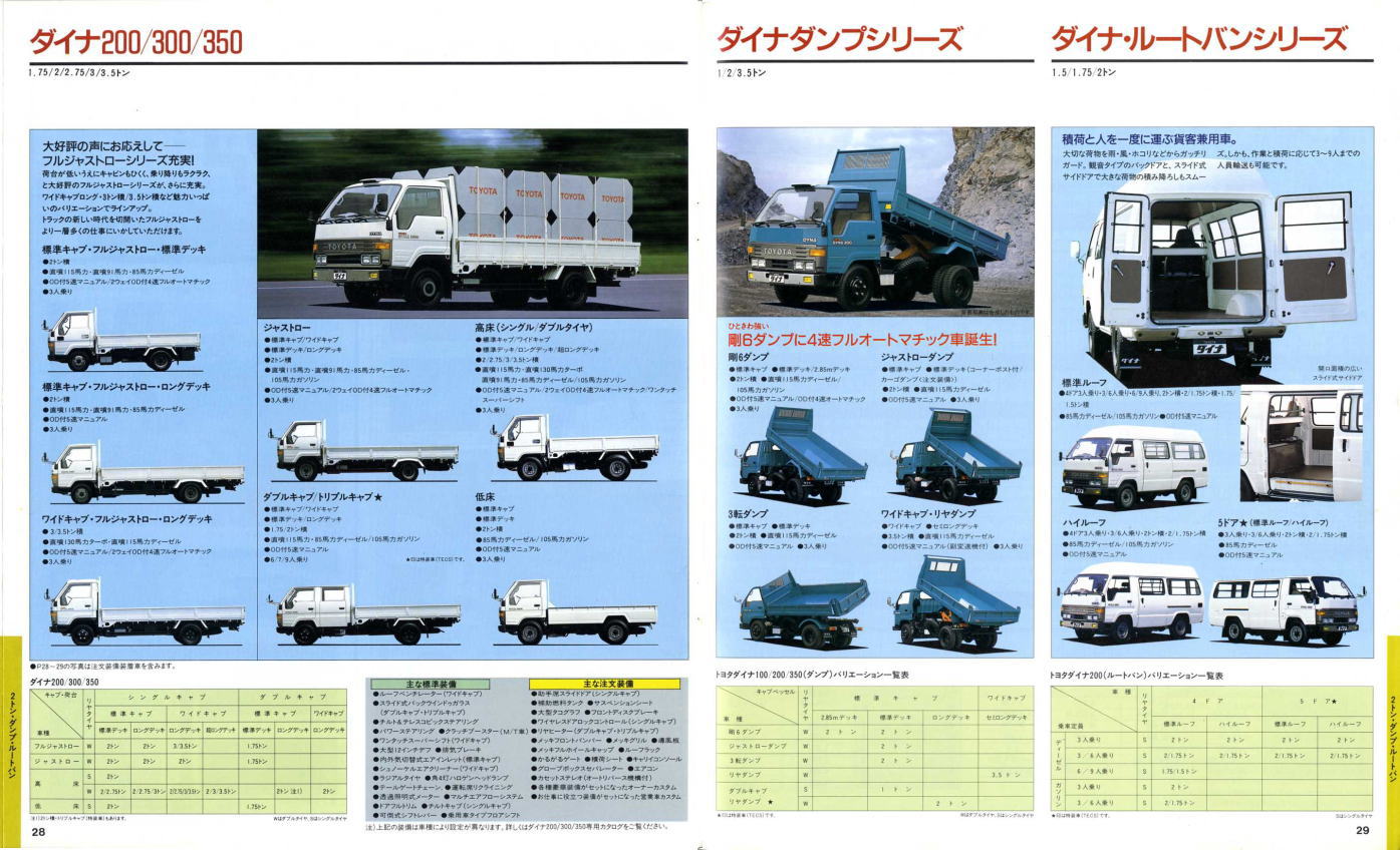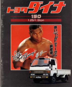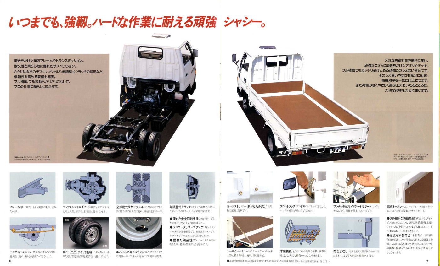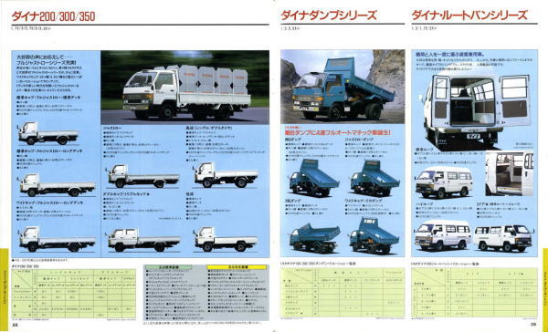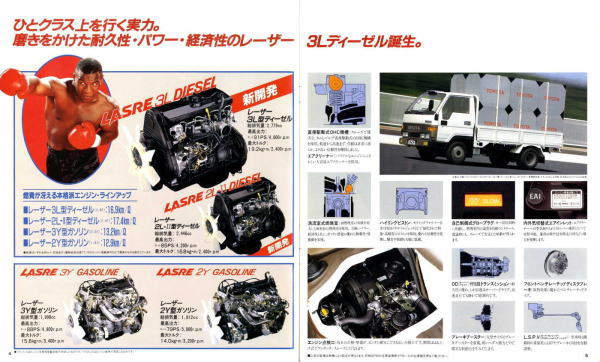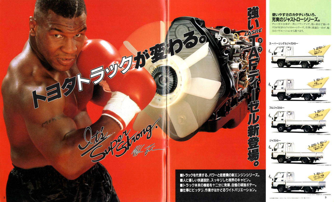 1984年にトヨタから発売された5代目ダイナ(Y50/60型)です。発売当初は丸型ヘッドライトでしたが、このカタログが発行された1988年の時点では角型に変更されています。バブル絶頂期に発行されたカタログなのでイメージキャラクターにはいかにもギャラが高そうなマイク・タイソン氏が起用されていますね。ヘビー級のボクサーが写っているととても力強そうなトラックに見えますが、これがもしフライ級のボクサーだと全然力強そうに見えません。イメージキャラクターってやっぱり重要ですね。(とはいえ、タイソン氏の次は確かシブがき隊のふっくんだったような気が・・・)