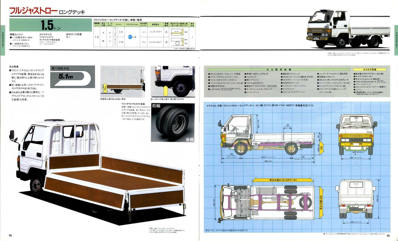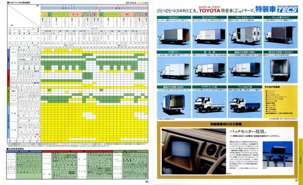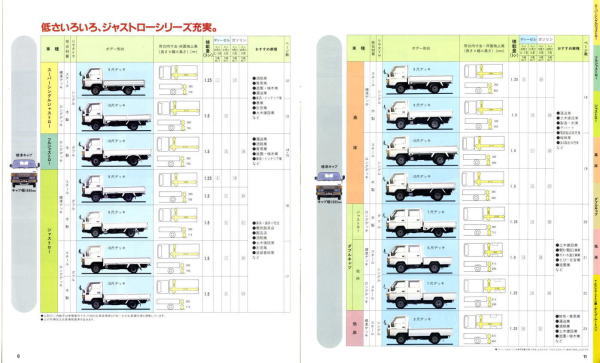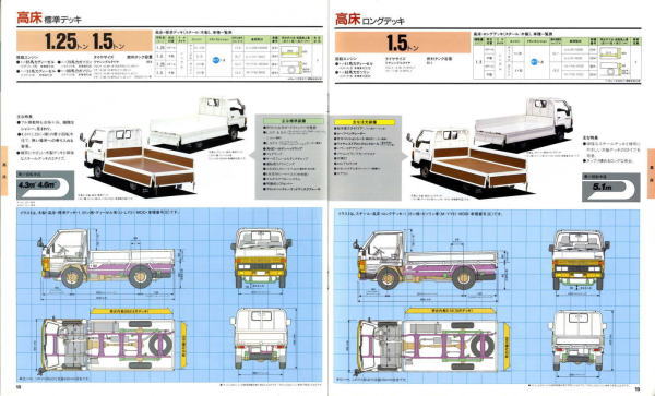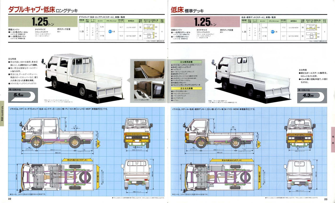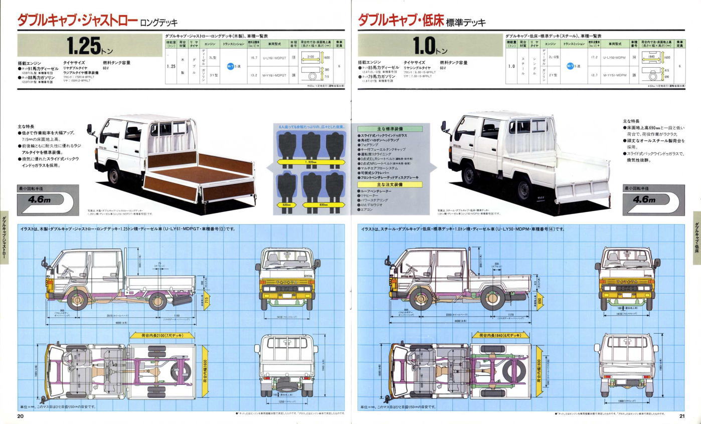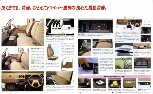 1984年にトヨタから発売された5代目ダイナ(Y50/60型)です。発売当初は丸型ヘッドライトでしたが、このカタログが発行された1988年の時点では角型に変更されています。バブル絶頂期に発行されたカタログなのでイメージキャラクターにはいかにもギャラが高そうなマイク・タイソン氏が起用されていますね。ヘビー級のボクサーが写っているととても力強そうなトラックに見えますが、これがもしフライ級のボクサーだと全然力強そうに見えません。イメージキャラクターってやっぱり重要ですね。(とはいえ、タイソン氏の次は確かシブがき隊のふっくんだったような気が・・・)