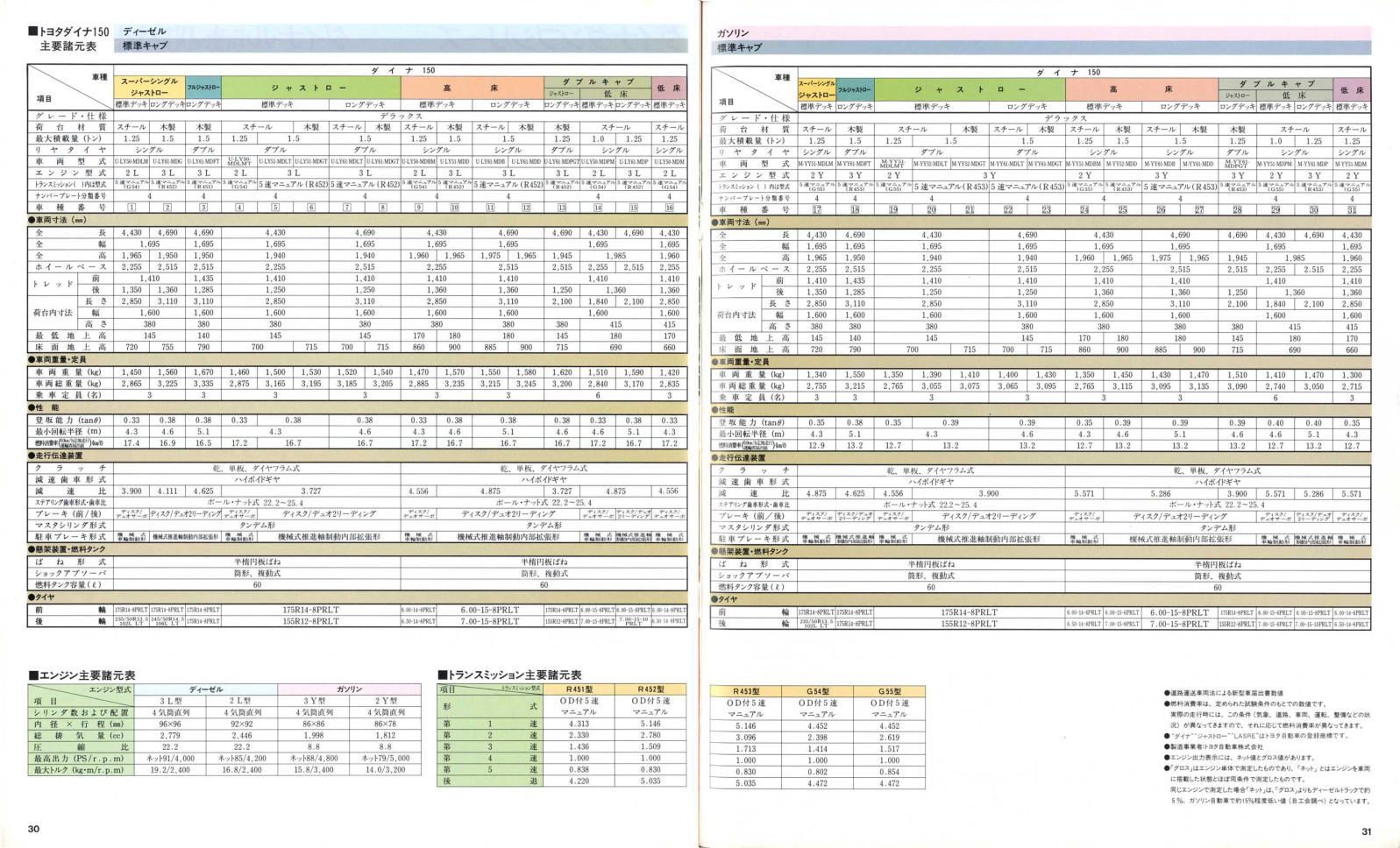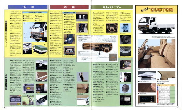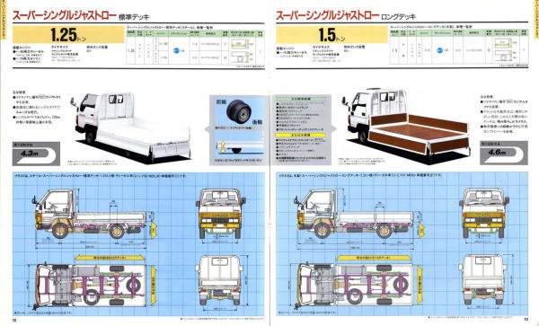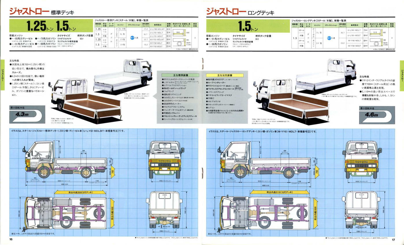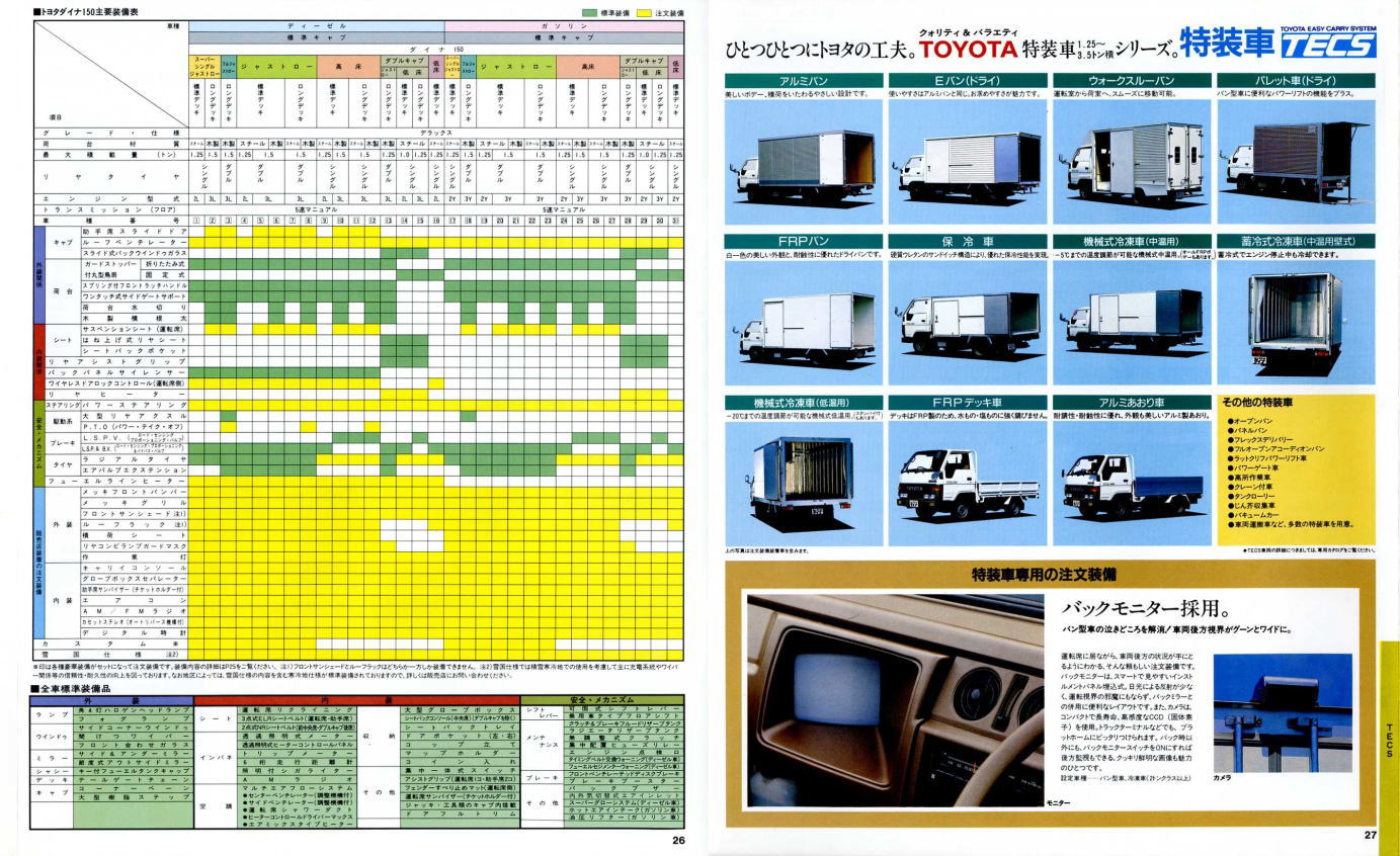 1984年にトヨタから発売された5代目ダイナ(Y50/60型)です。発売当初は丸型ヘッドライトでしたが、このカタログが発行された1988年の時点では角型に変更されています。バブル絶頂期に発行されたカタログなのでイメージキャラクターにはいかにもギャラが高そうなマイク・タイソン氏が起用されていますね。ヘビー級のボクサーが写っているととても力強そうなトラックに見えますが、これがもしフライ級のボクサーだと全然力強そうに見えません。イメージキャラクターってやっぱり重要ですね。(とはいえ、タイソン氏の次は確かシブがき隊のふっくんだったような気が・・・)