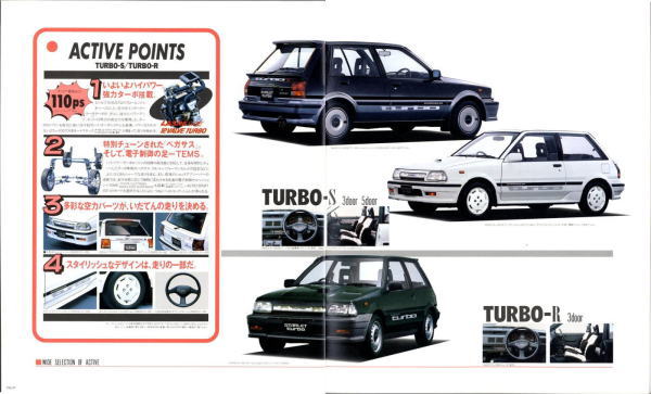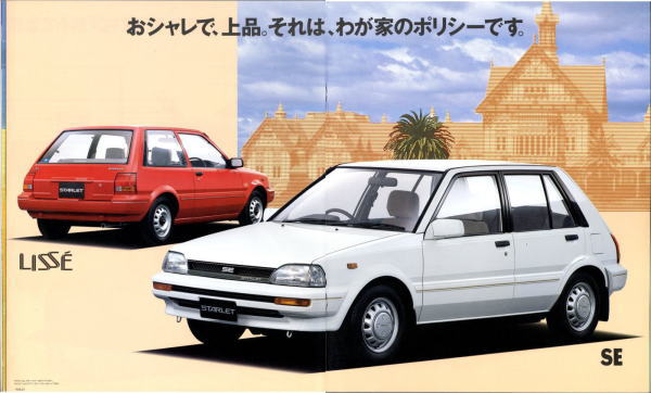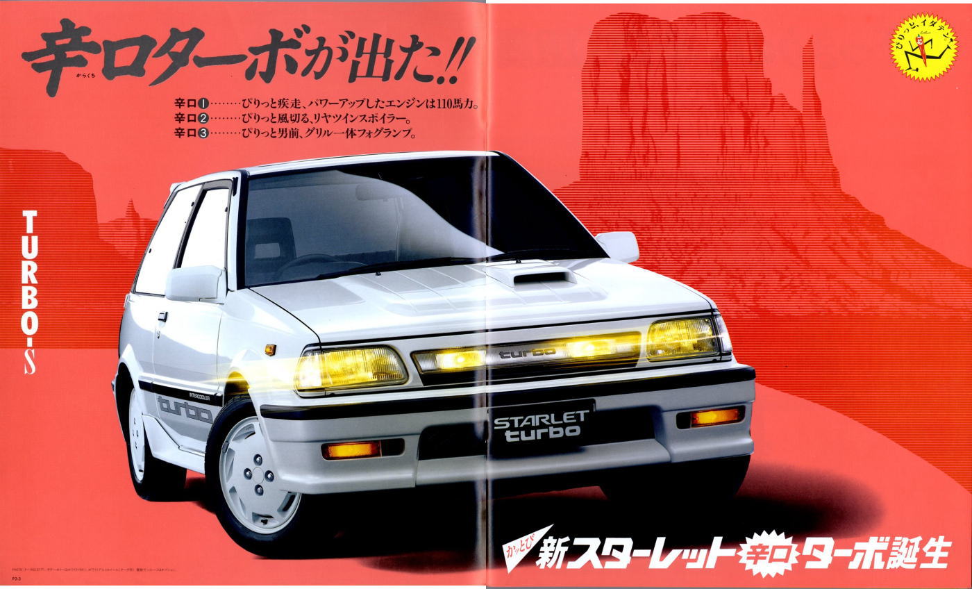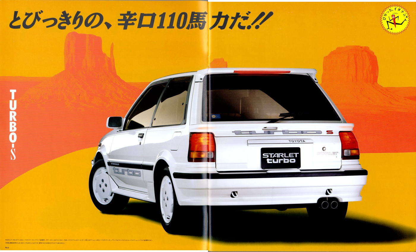 さて、3代目スターレット、このカタログはモデル末期のものなので“辛口ターボ”というキャッチフレーズが記載されていますが、その言葉通り、本当に辛口なクルマでした。こういう“辛口”(じゃじゃ馬的?)が好きな方にはたまらないクルマなんでしょうが、個人的にはこのクルマは“中辛”ぐらいがちょうど良いのではないかと思っていました。まあそう考える方はノンターボのグレードを選べば良いだけですから、辛口も中辛も甘口も用意してくれていた当時のトヨタはある意味、とても良心的でしたね。