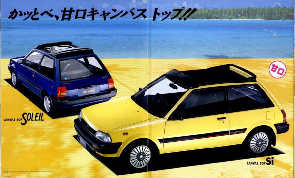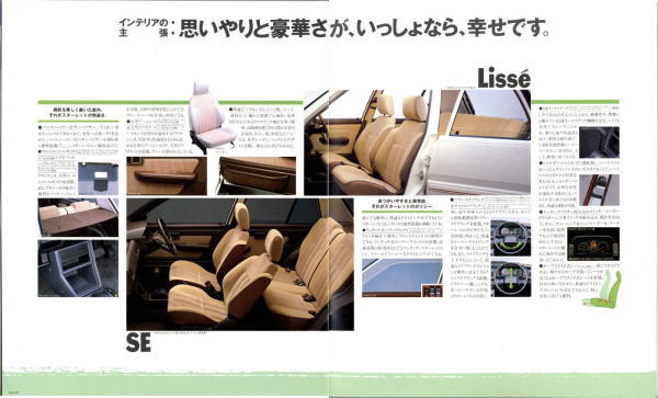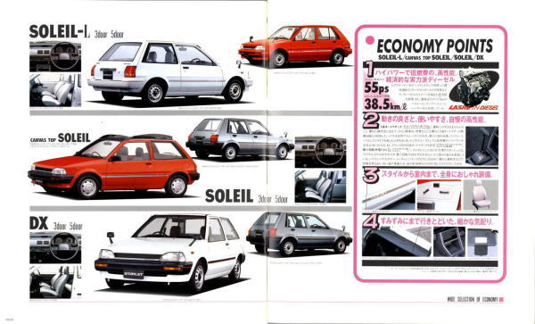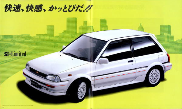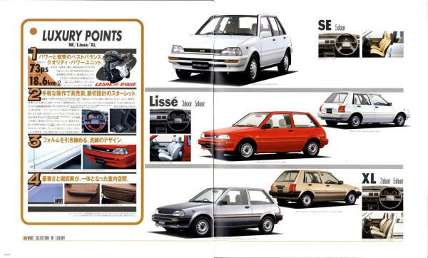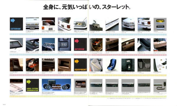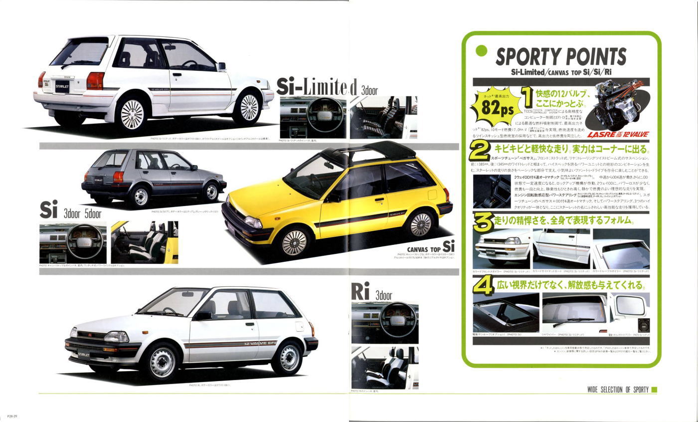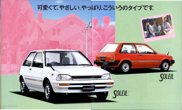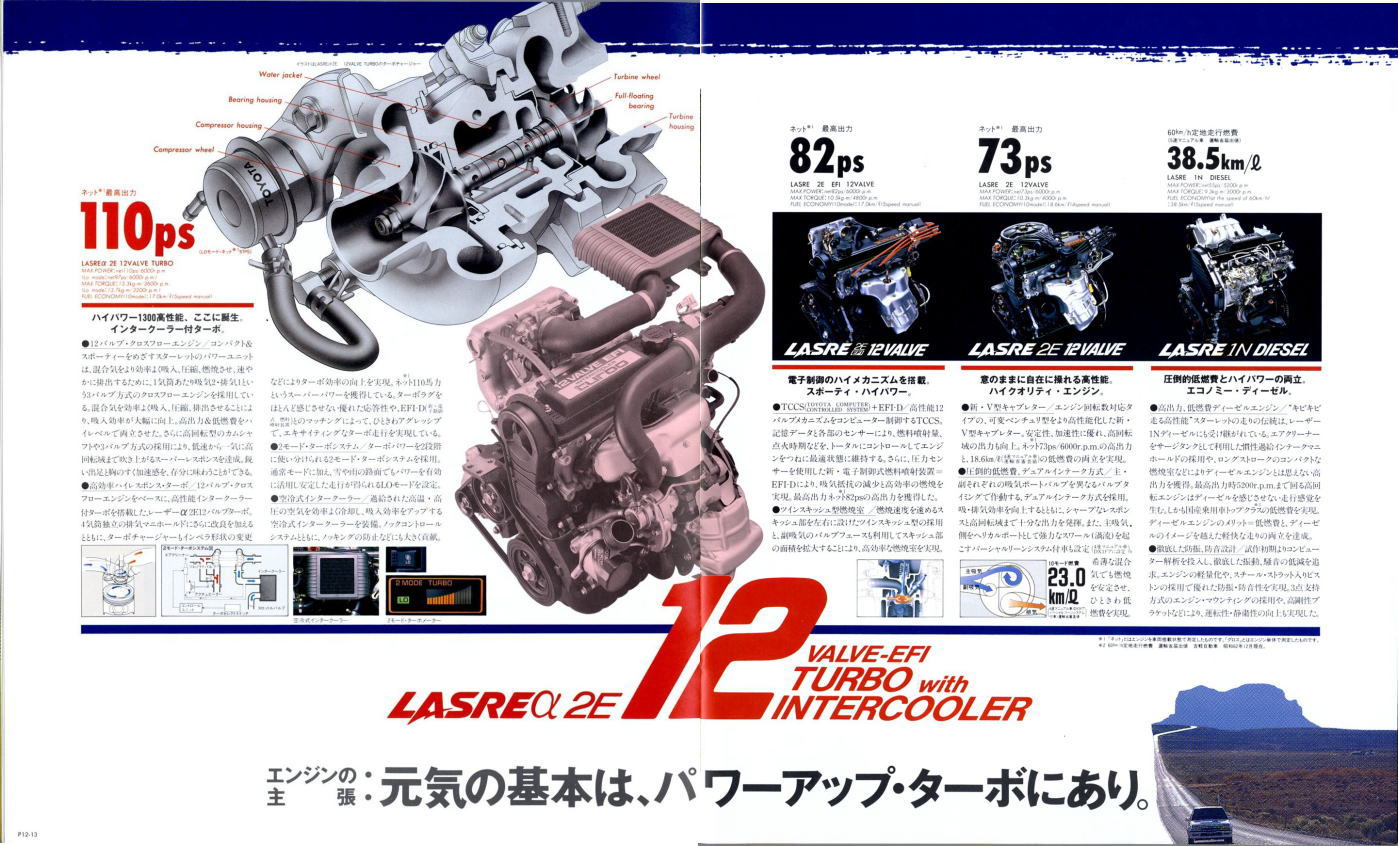 さて、3代目スターレット、このカタログはモデル末期のものなので“辛口ターボ”というキャッチフレーズが記載されていますが、その言葉通り、本当に辛口なクルマでした。こういう“辛口”(じゃじゃ馬的?)が好きな方にはたまらないクルマなんでしょうが、個人的にはこのクルマは“中辛”ぐらいがちょうど良いのではないかと思っていました。まあそう考える方はノンターボのグレードを選べば良いだけですから、辛口も中辛も甘口も用意してくれていた当時のトヨタはある意味、とても良心的でしたね。