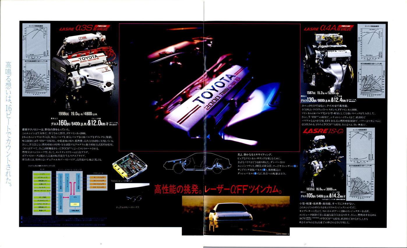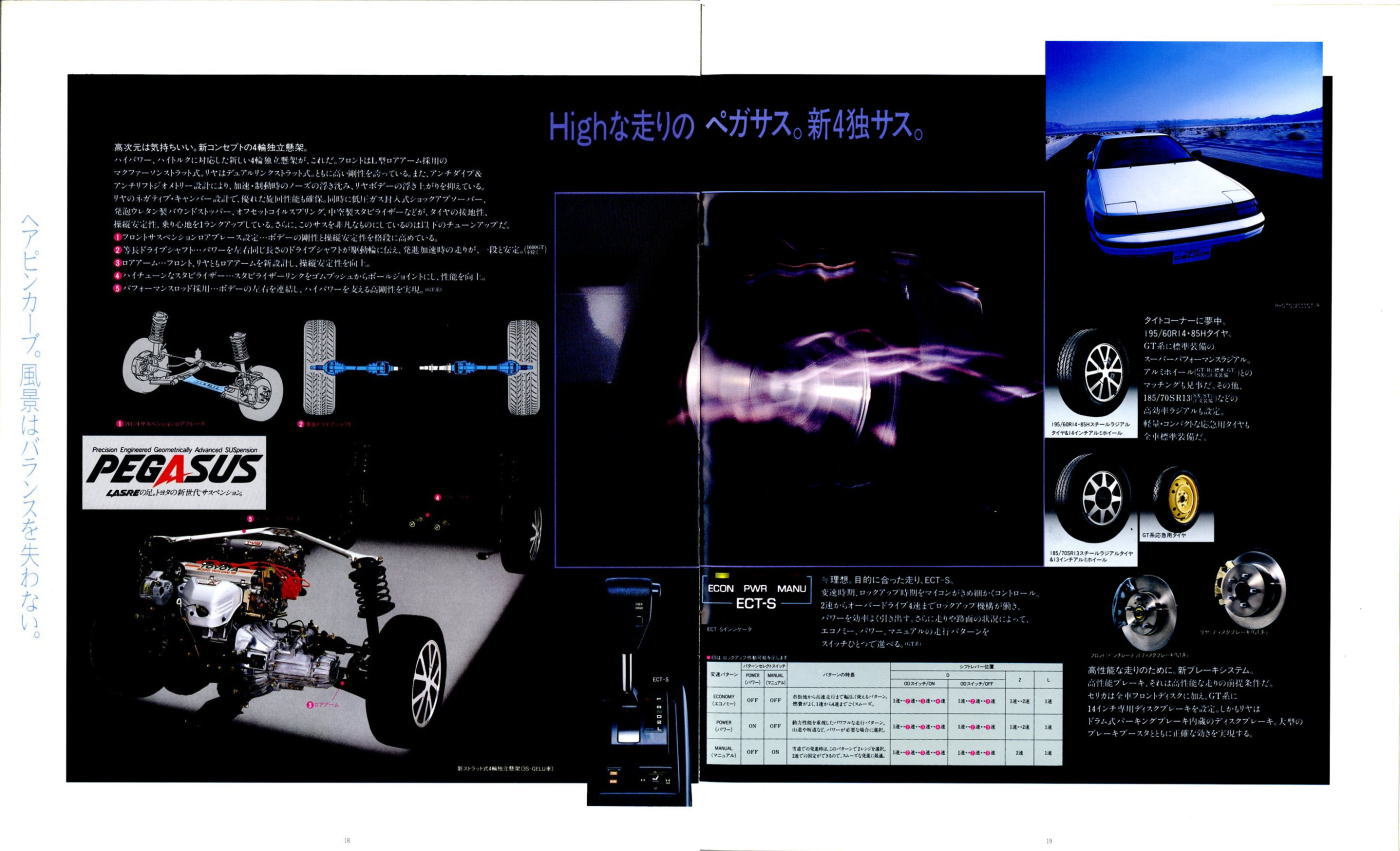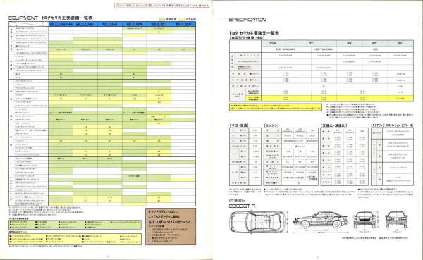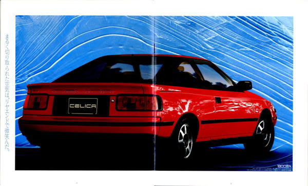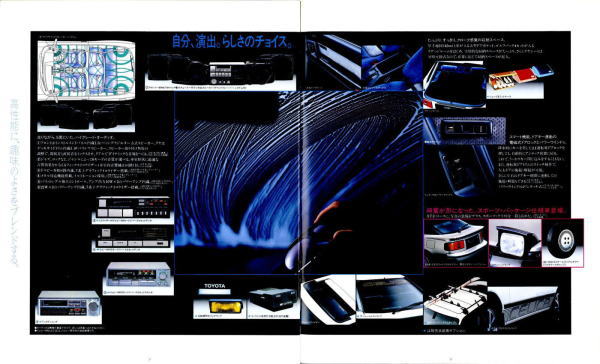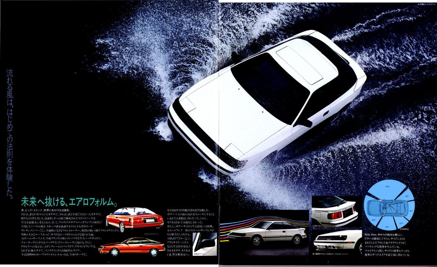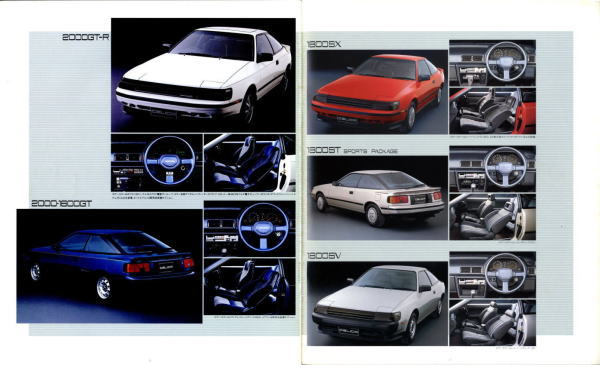 さてこの4代目セリカ、掲載したカタログはセリカ登場時のものなのでちょっとラインナップが寂しいですが、後にフルタイム4WDのGT-FOURやオープンカーのコンバーティブルといった個性的なグレードが追加されます。セリカの中だけでも魅力的なクルマが選び放題、姉妹車のカリーナEDやコロナクーペ、さらには上級のスープラやソアラ、下級のレビン/トレノと、当時はスペシャリティカーのオンパレードですね。出るぞ出るぞと騒がれながらハチロク1台の話題で2年以上も時間が稼げてしまう現在では考えられない状態です。