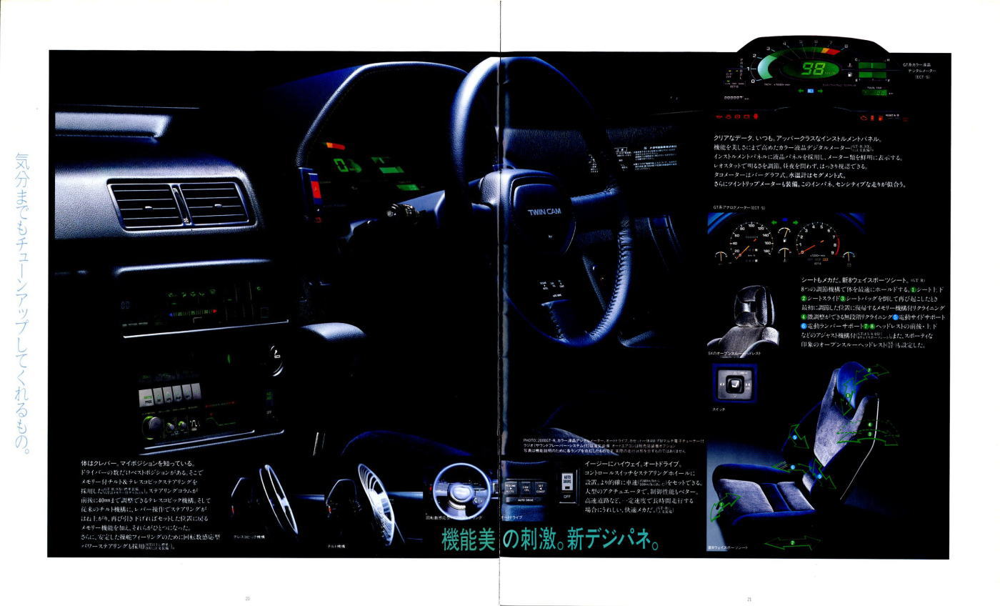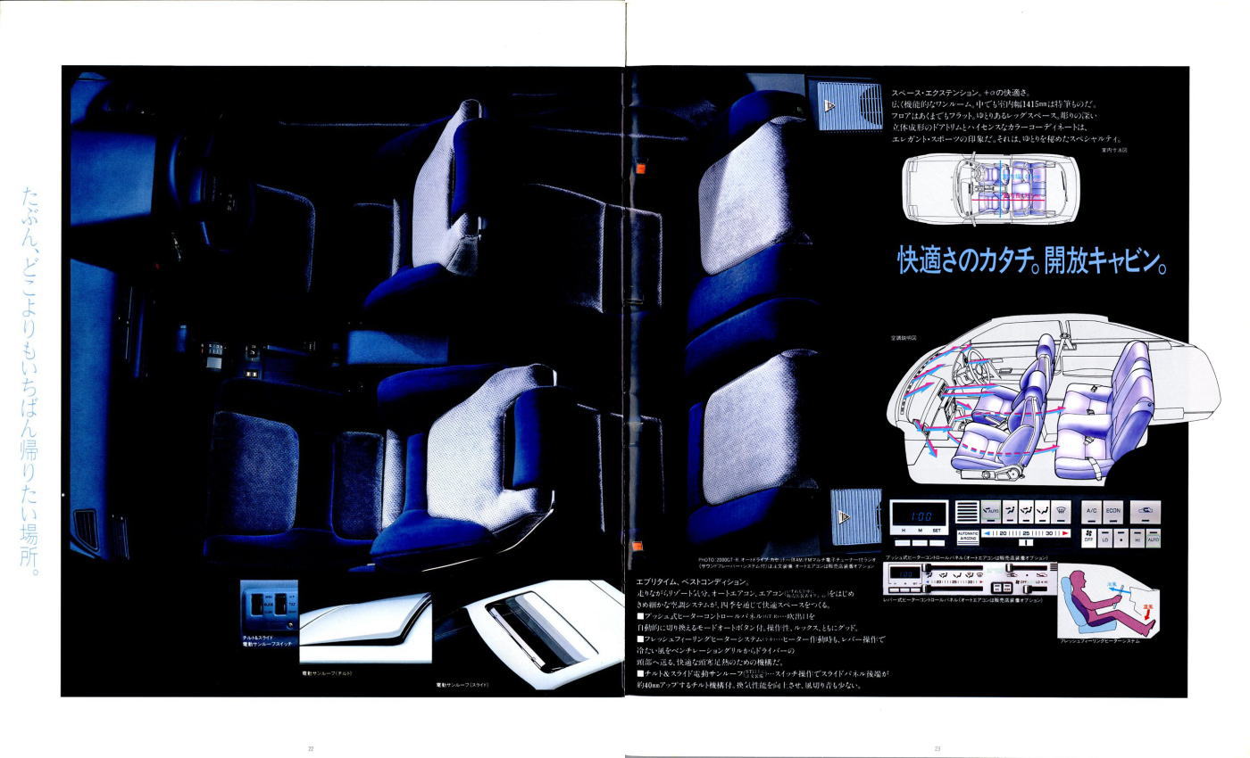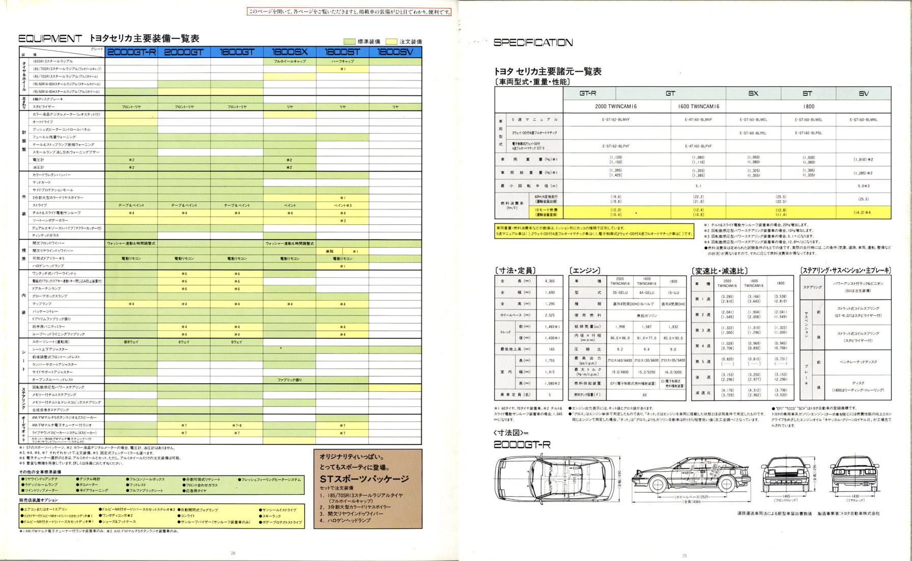 さてこの4代目セリカ、掲載したカタログはセリカ登場時のものなのでちょっとラインナップが寂しいですが、後にフルタイム4WDのGT-FOURやオープンカーのコンバーティブルといった個性的なグレードが追加されます。セリカの中だけでも魅力的なクルマが選び放題、姉妹車のカリーナEDやコロナクーペ、さらには上級のスープラやソアラ、下級のレビン/トレノと、当時はスペシャリティカーのオンパレードですね。出るぞ出るぞと騒がれながらハチロク1台の話題で2年以上も時間が稼げてしまう現在では考えられない状態です。