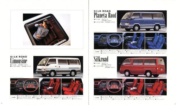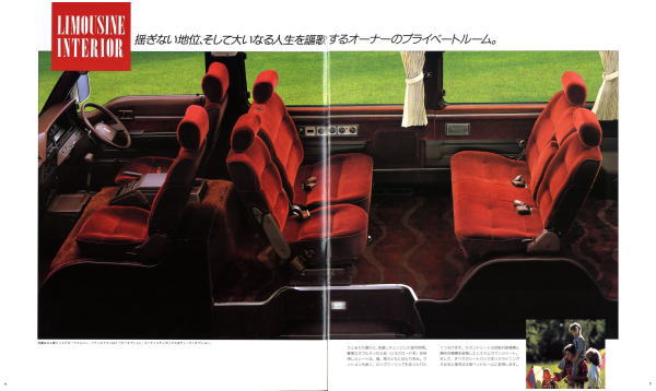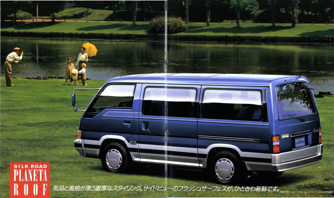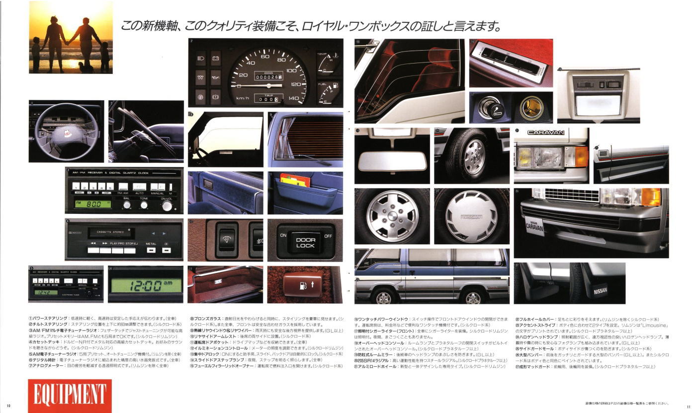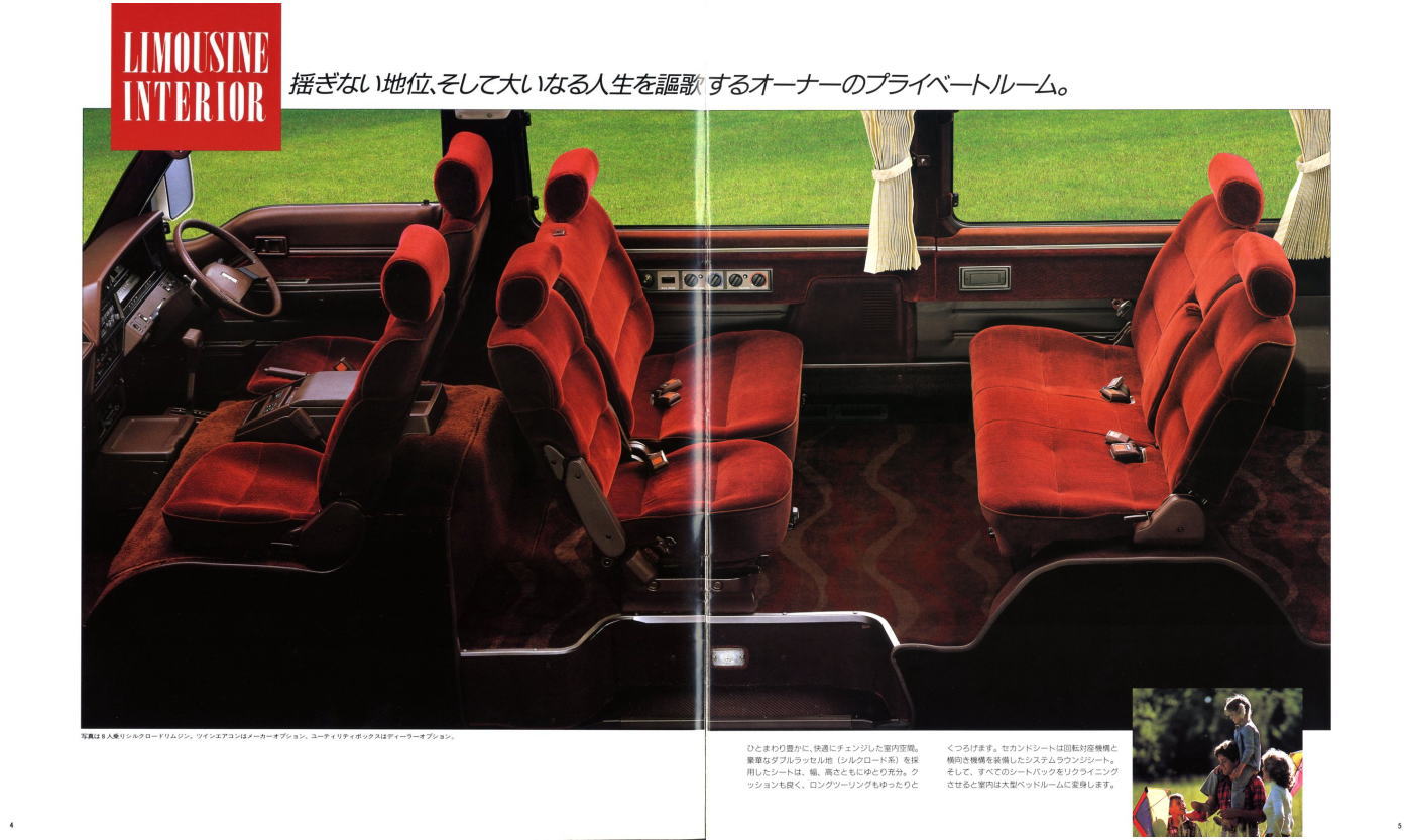 1986年に日産から発売された3代目キャラバン・コーチ(E24型)です。「最高級のロイヤル・ワンボックス」というキャッチコピーが使われている通り、当時の好景気を反映して豪華な内装をこれ見よがしにPRしていますね。