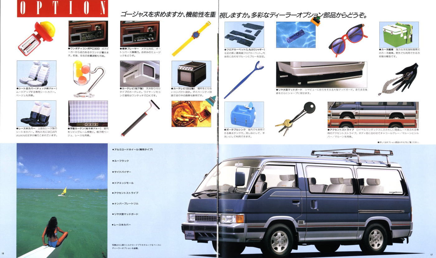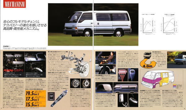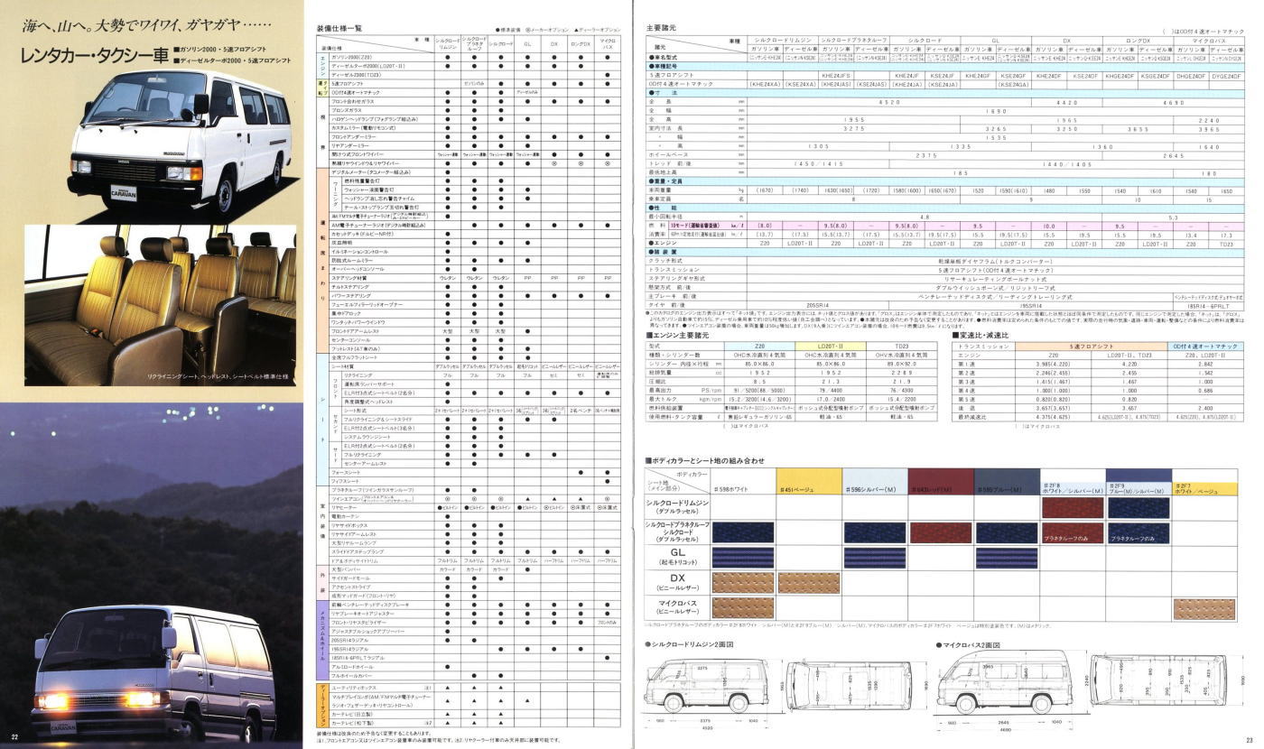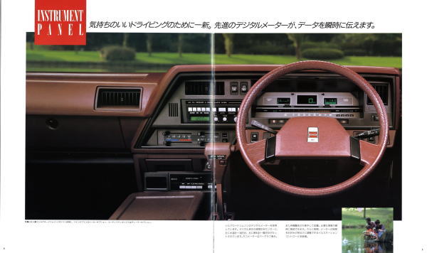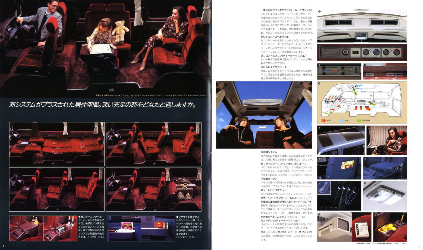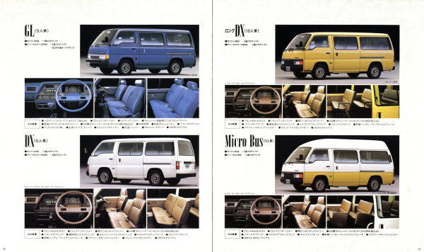 1986年に日産から発売された3代目キャラバン・コーチ(E24型)です。「最高級のロイヤル・ワンボックス」というキャッチコピーが使われている通り、当時の好景気を反映して豪華な内装をこれ見よがしにPRしていますね。