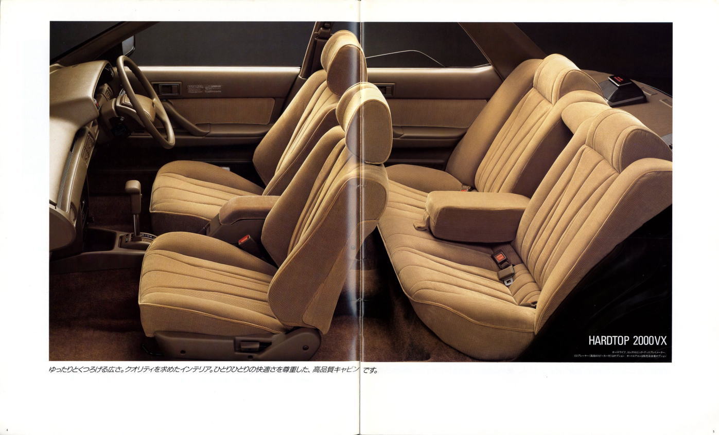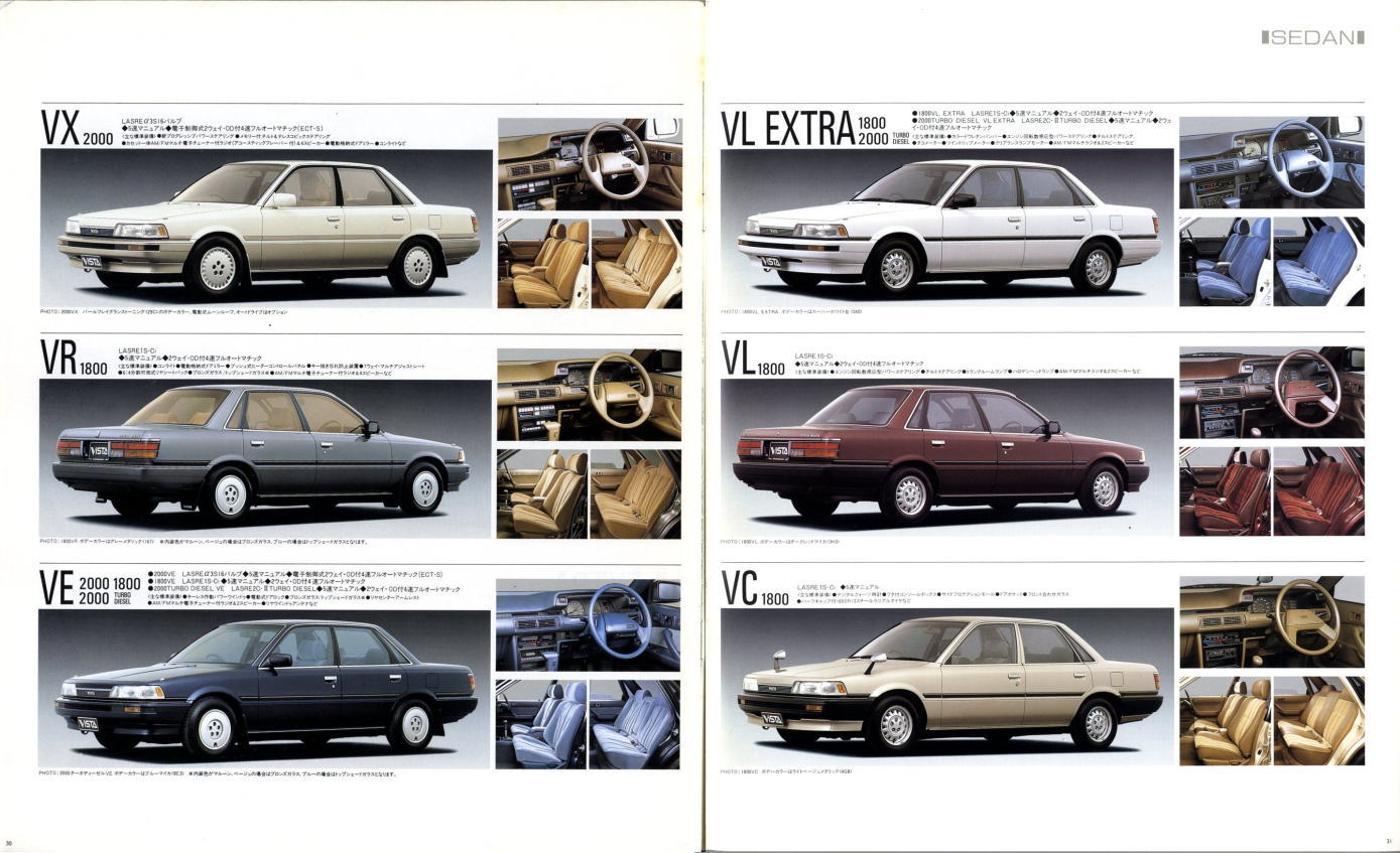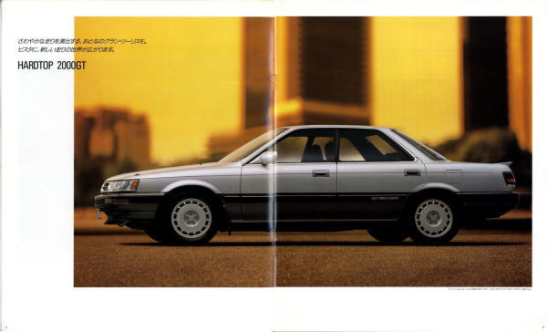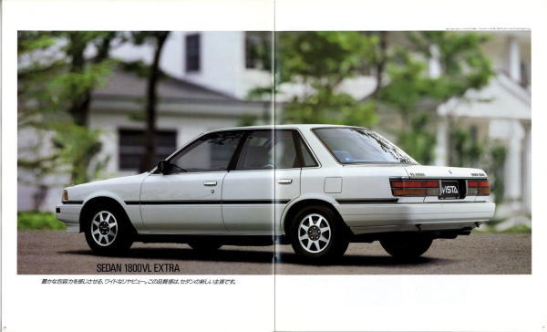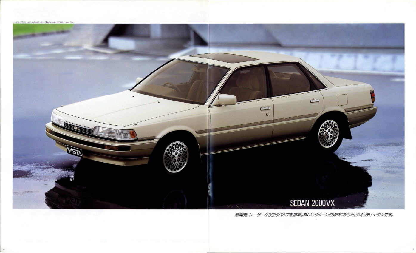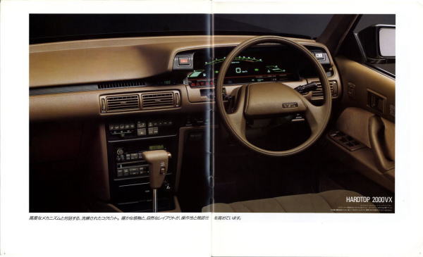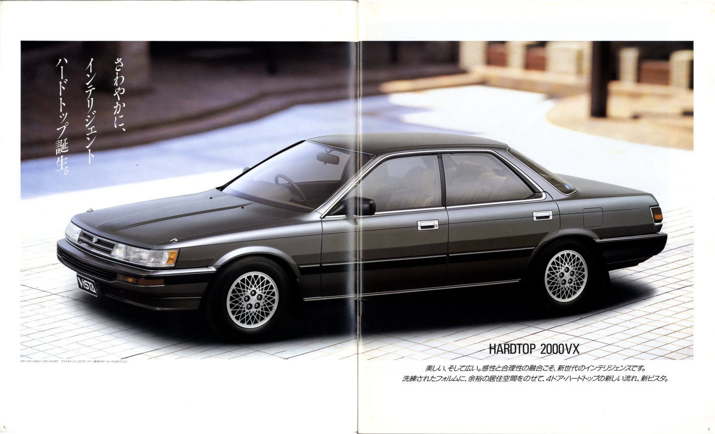 さて、姉妹車云々は置いておき、このビスタ、特にハードトップタイプはなかなかカッコいいですね。当時はカムリともどもマーク2三兄弟の影に隠れて少々存在感が薄かったのですが、改めてカタログを見てみるとマーク2のようにもカリーナEDのようにも見えてそのどちらでもなく、おまけに“2000GT”なるグレードまでありますね。“さわやかな走りを演出する、おとなのグラン・ツーリスモ。”このカタログは25年前のものですが、当時よりも今のほうがこのビスタが“おとなのグラン・ツーリスモ”に見えてしまうのは気のせいですかね?