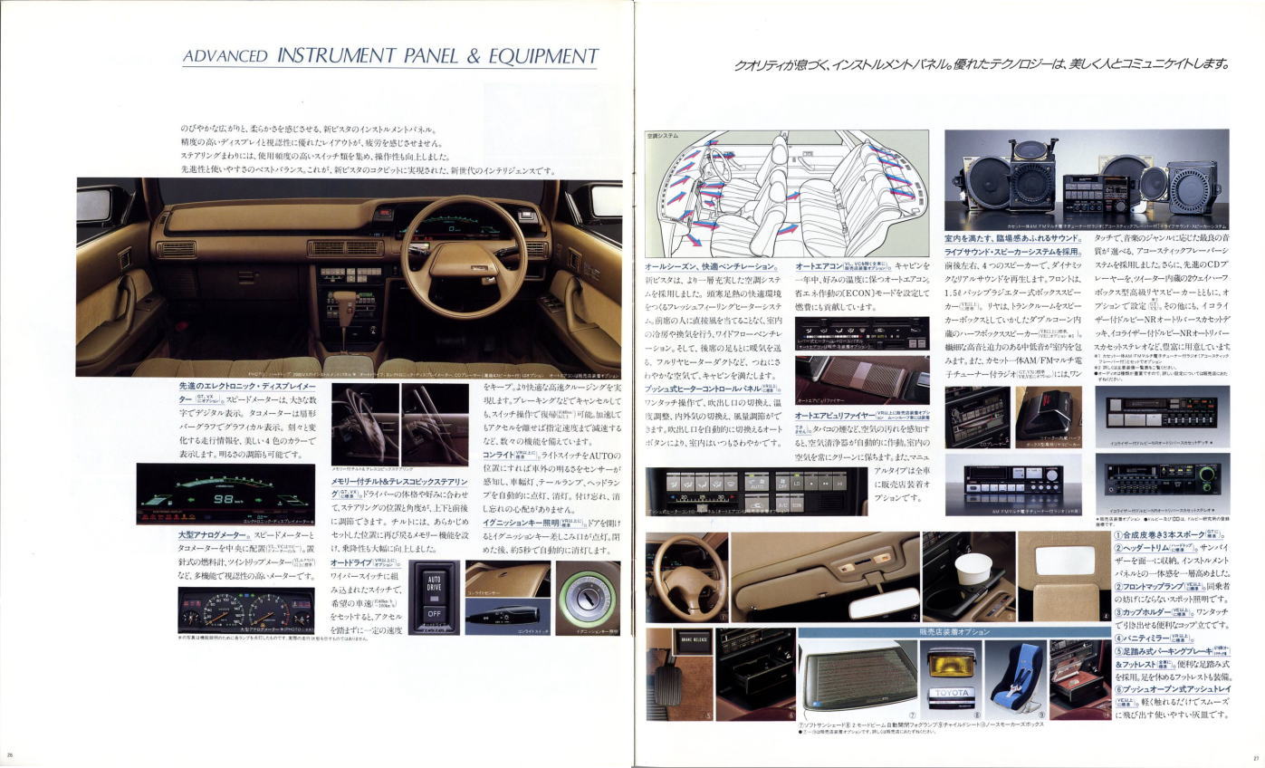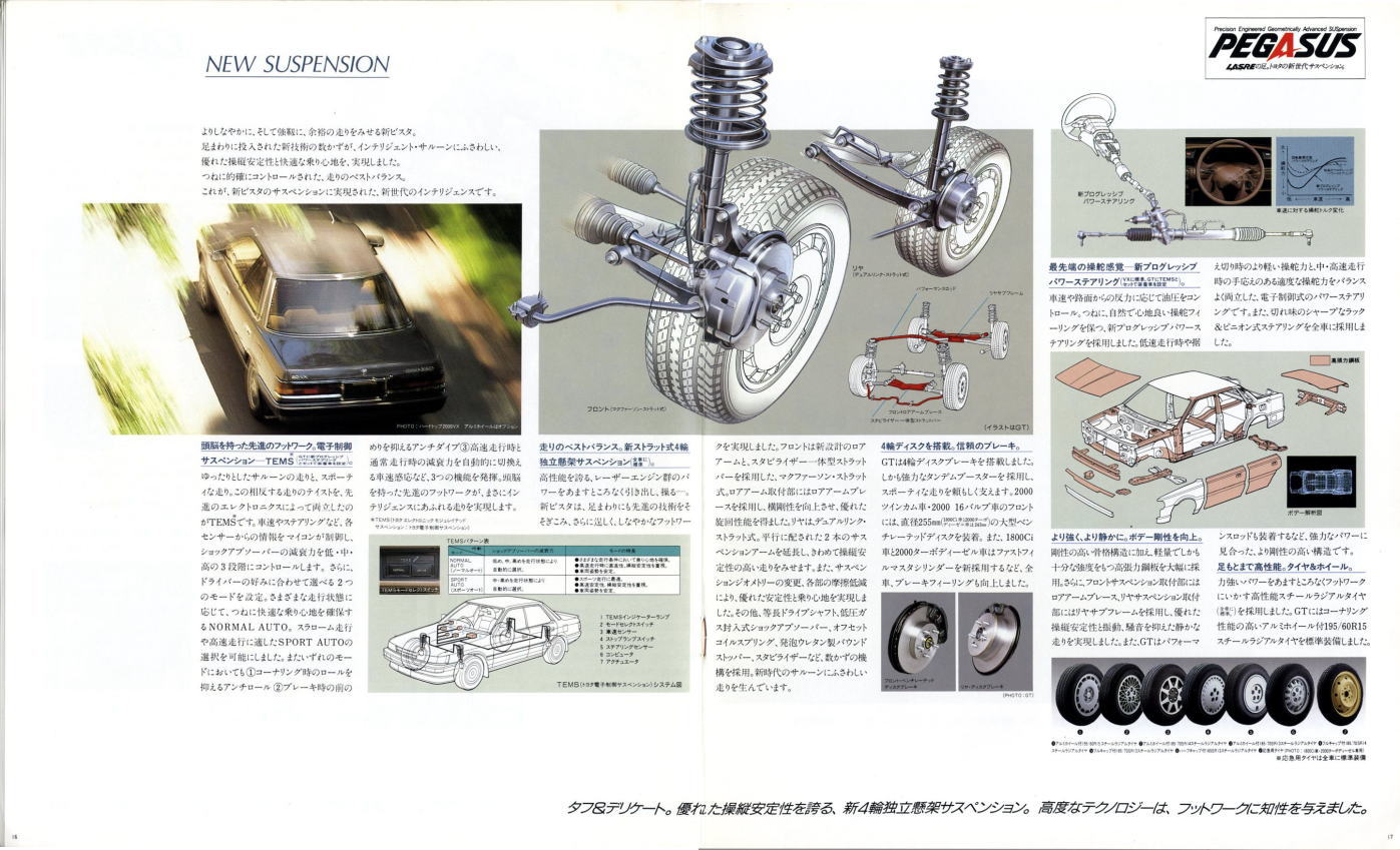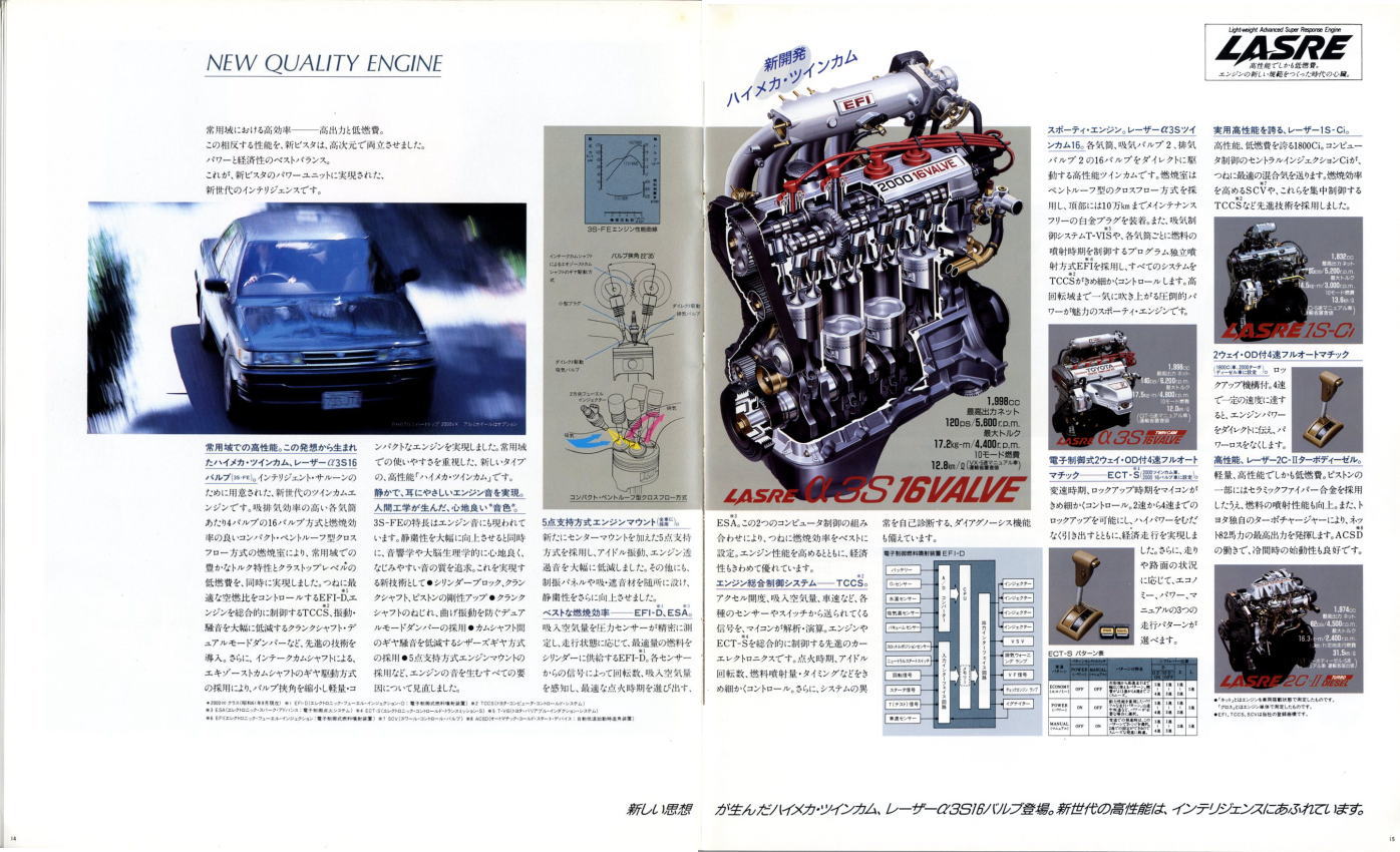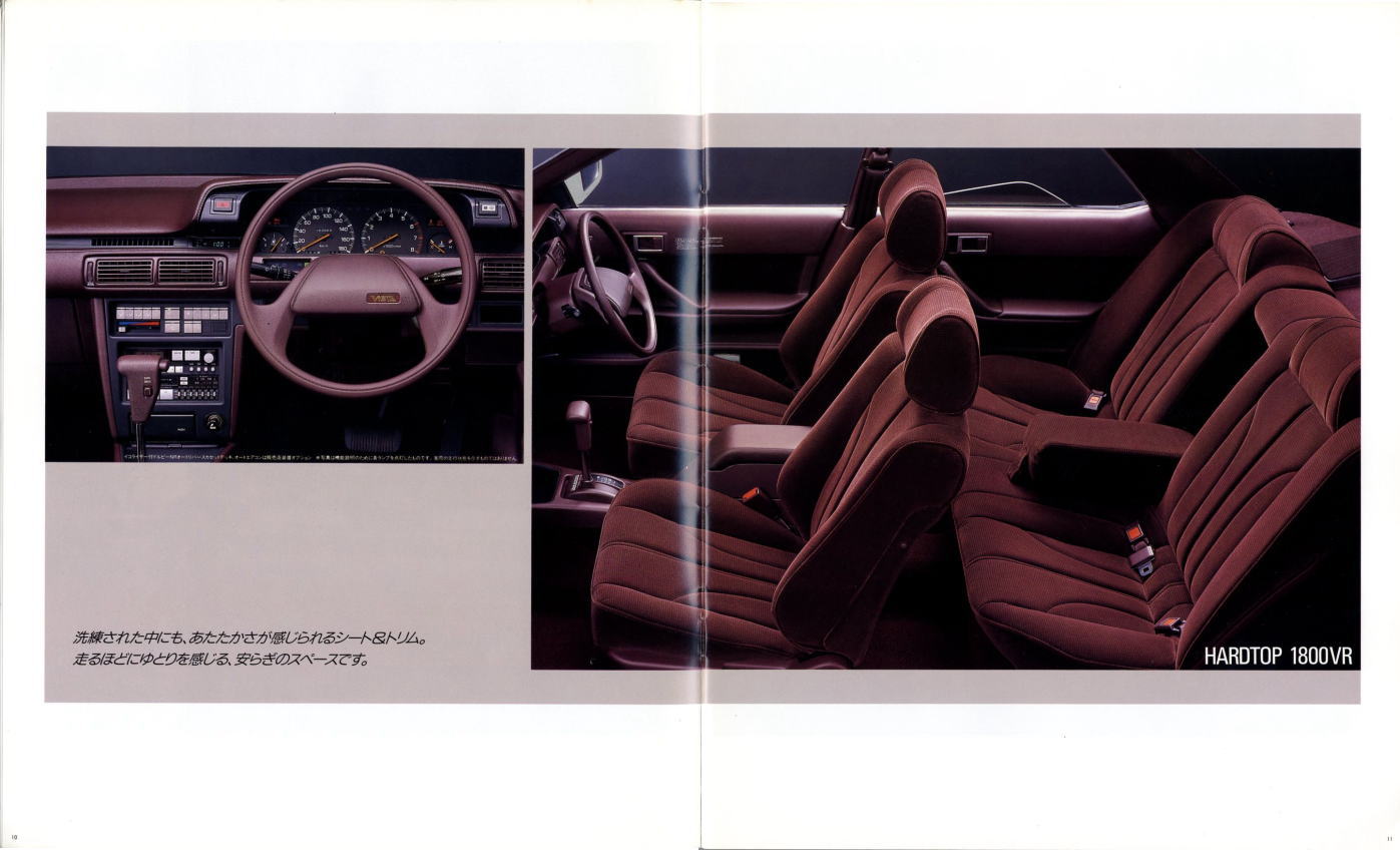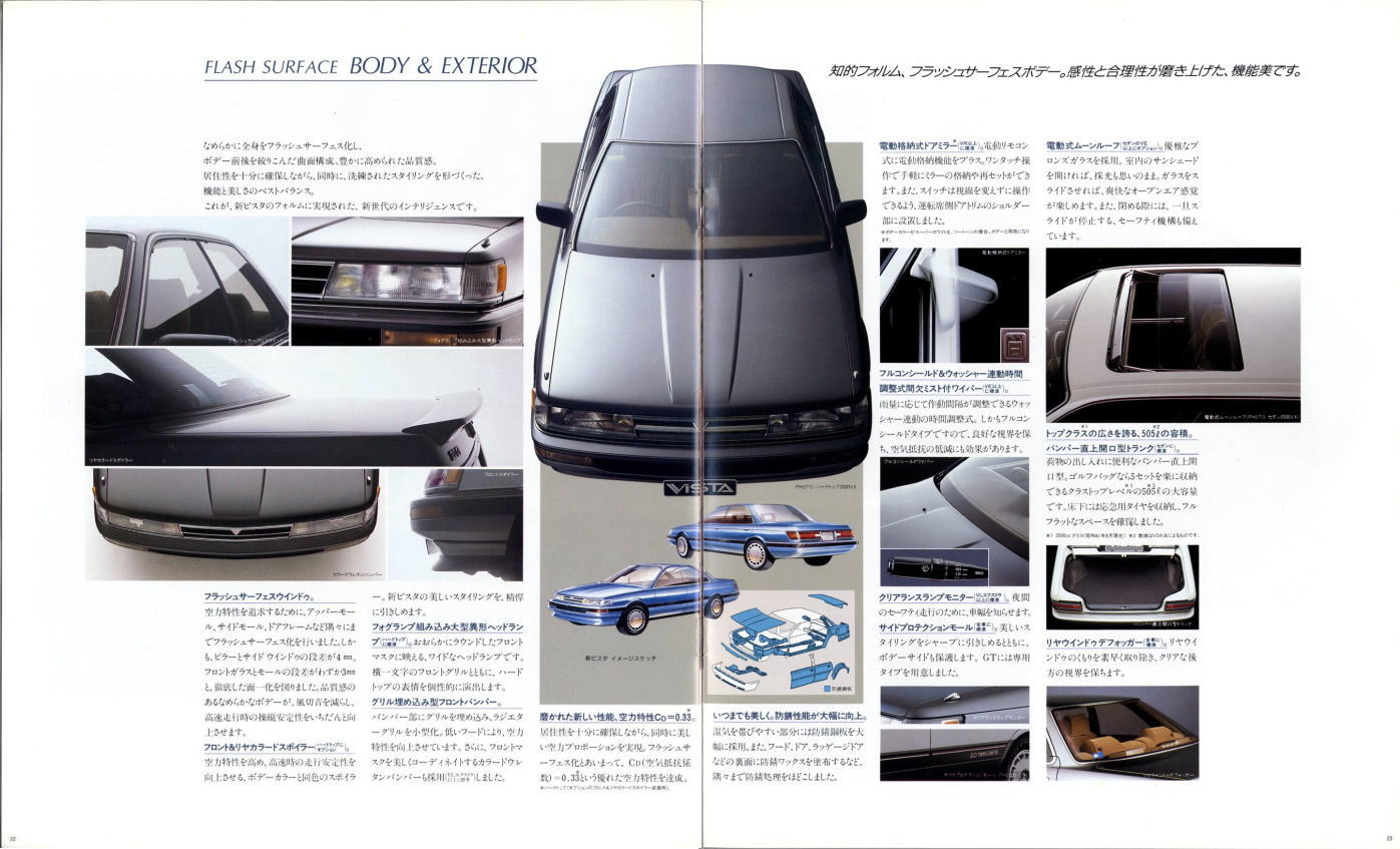 さて、姉妹車云々は置いておき、このビスタ、特にハードトップタイプはなかなかカッコいいですね。当時はカムリともどもマーク2三兄弟の影に隠れて少々存在感が薄かったのですが、改めてカタログを見てみるとマーク2のようにもカリーナEDのようにも見えてそのどちらでもなく、おまけに“2000GT”なるグレードまでありますね。“さわやかな走りを演出する、おとなのグラン・ツーリスモ。”このカタログは25年前のものですが、当時よりも今のほうがこのビスタが“おとなのグラン・ツーリスモ”に見えてしまうのは気のせいですかね?