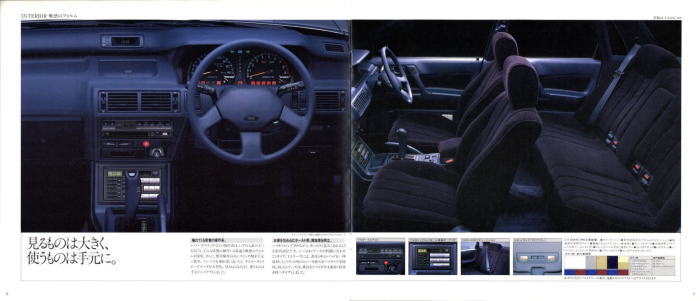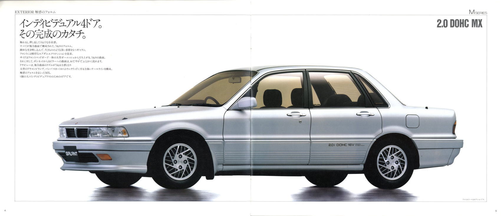 1987年に三菱から発売された6代目ギャラン(E31/32/33/39A型)です。いかにも三菱っぽい逆スラントノーズの精悍なフロントマスクが印象的で、カタログでも“インディビデュアル4ドア”という聞き慣れない外来語のキャッチコピーが使われている通り、個性的な存在でしたね。また皆様ご存知の通り、この代のギャランにはVR-4というスポーティーグレードが用意されており、4G63ターボエンジンが搭載された後のランエボの直接的な祖先としても有名ですね。