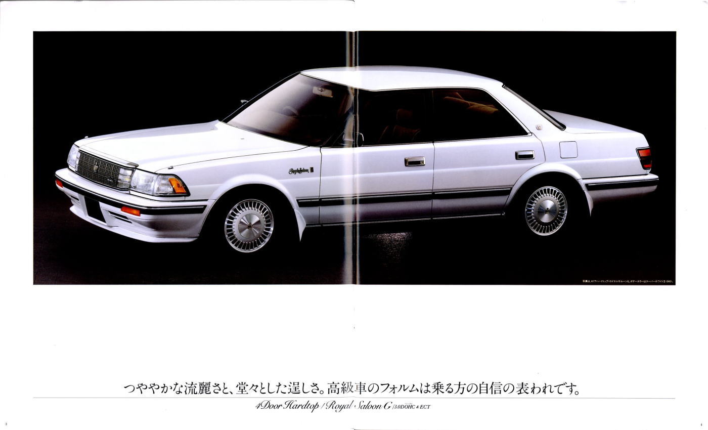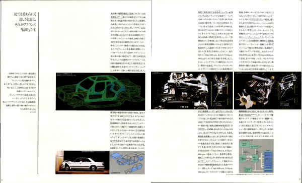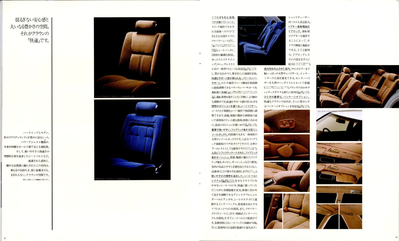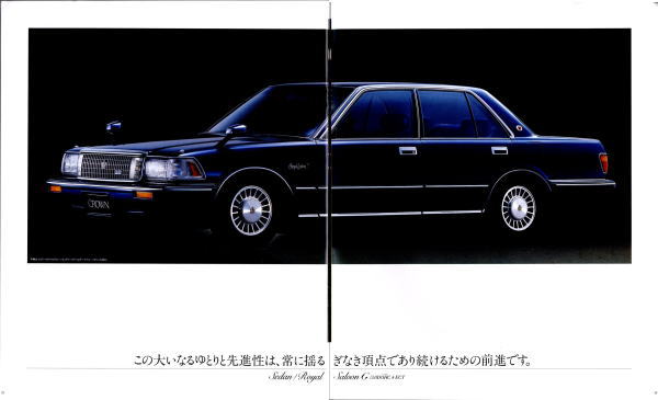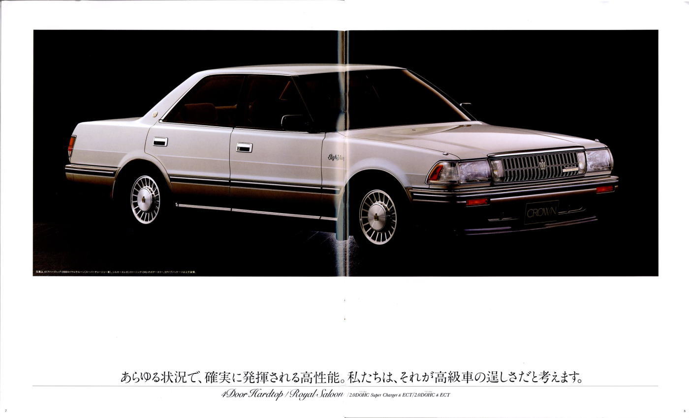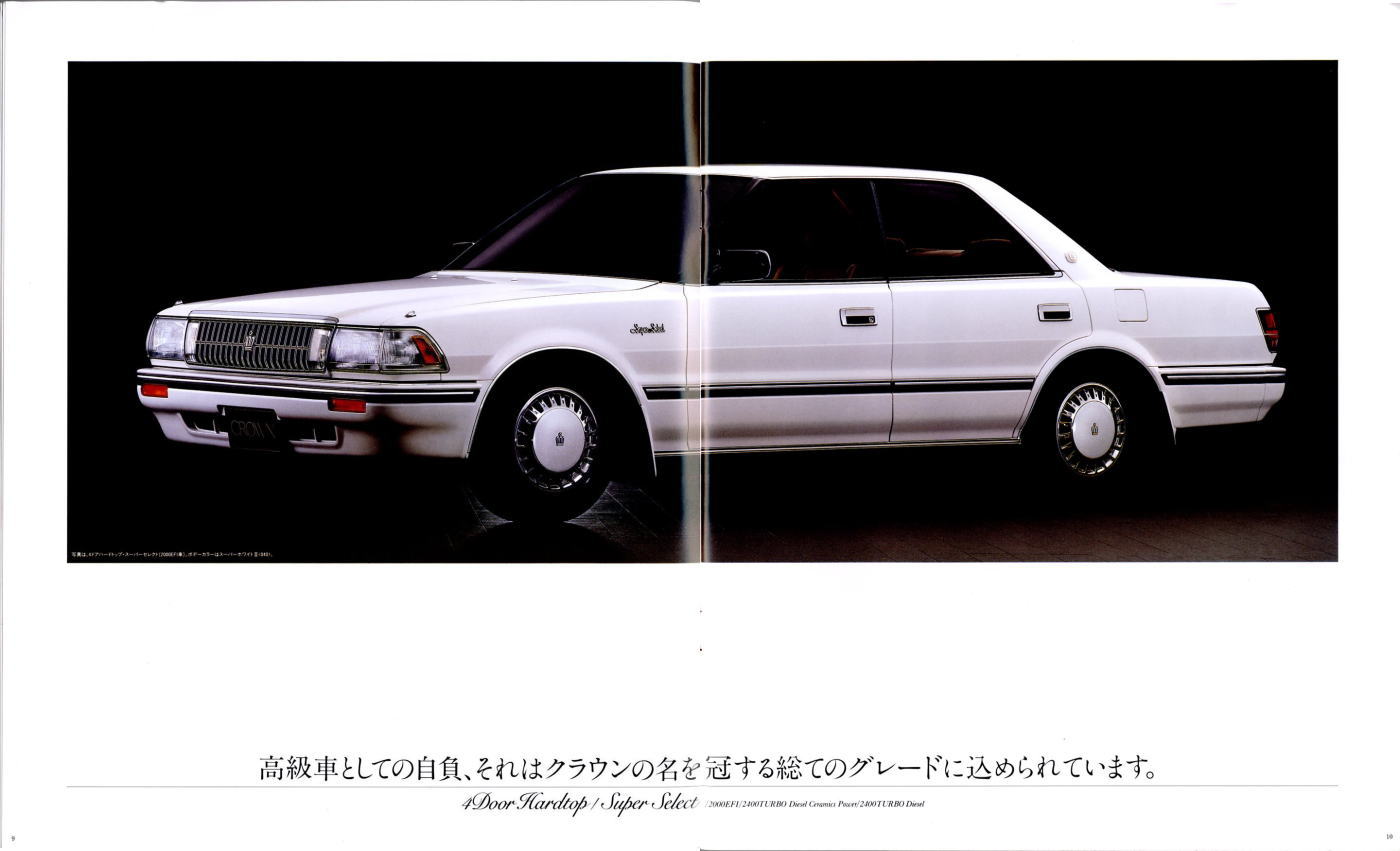 折からのバブル景気と、モデル途中の平成元年に税制変更があったこともあり、この代のクラウンは何でもありのクラウンでした。このカタログは前期型のものなのでまだ大人しいラインナップですが、後期型にはクラウンエイト以来の4リッターV8搭載車が生まれ、2リッターのワイドボディ車も生まれ、後の主流となる2.5リッター車が生まれたのもこの代です。