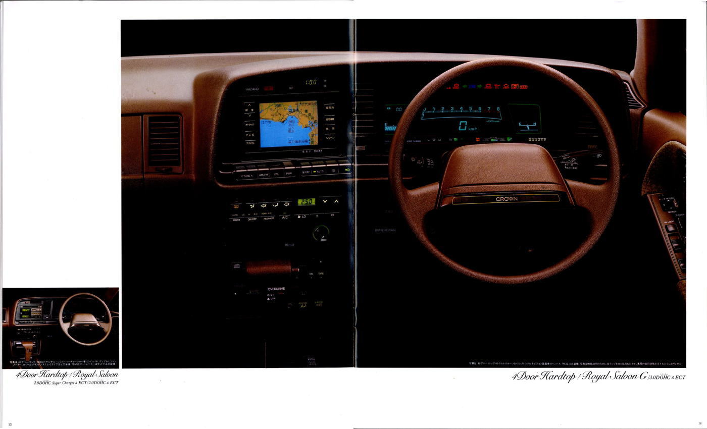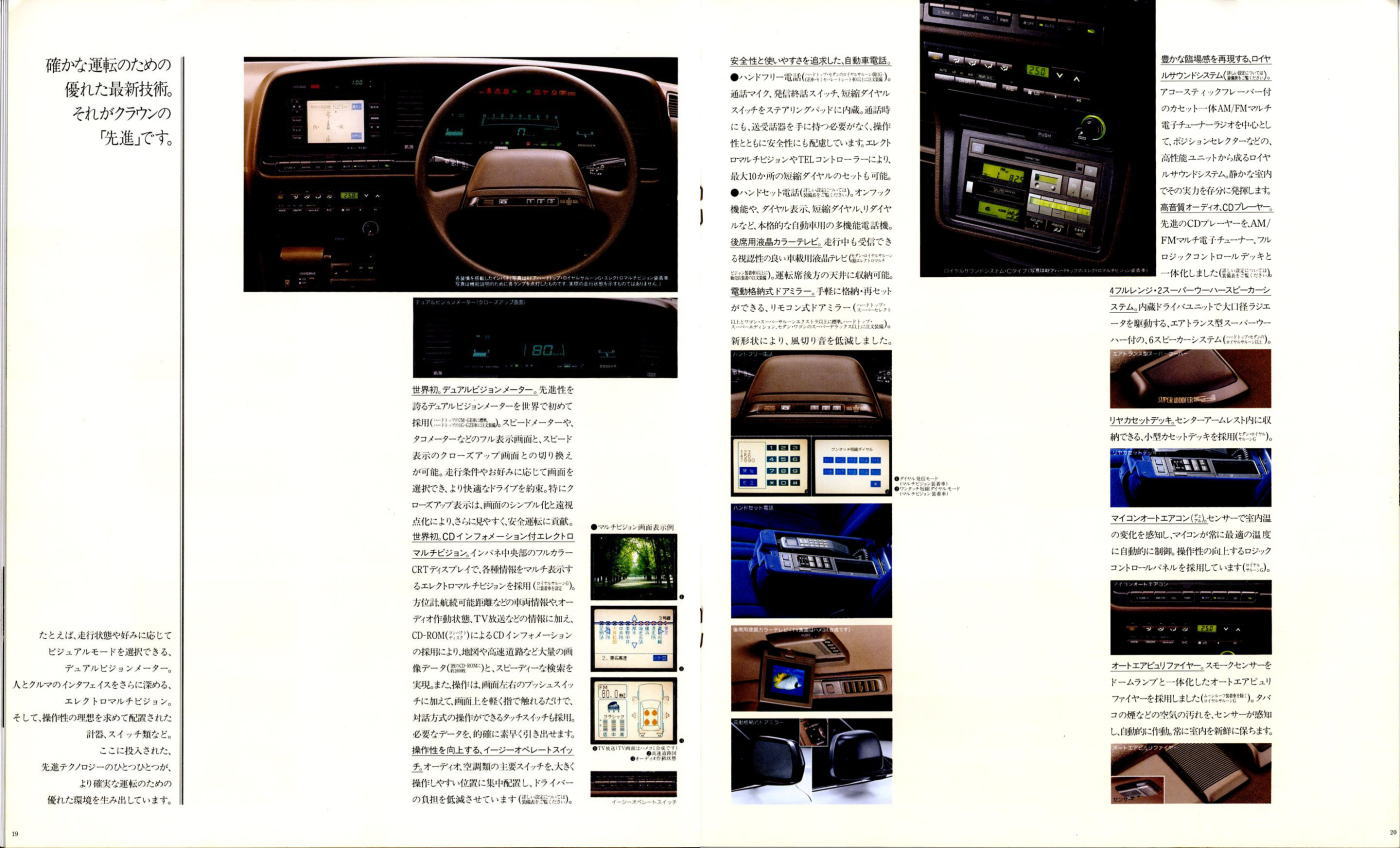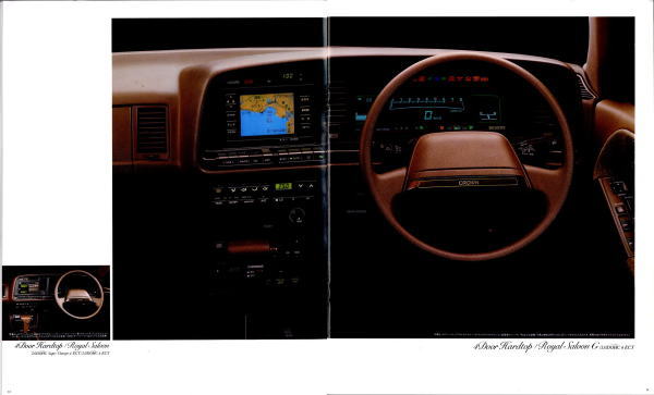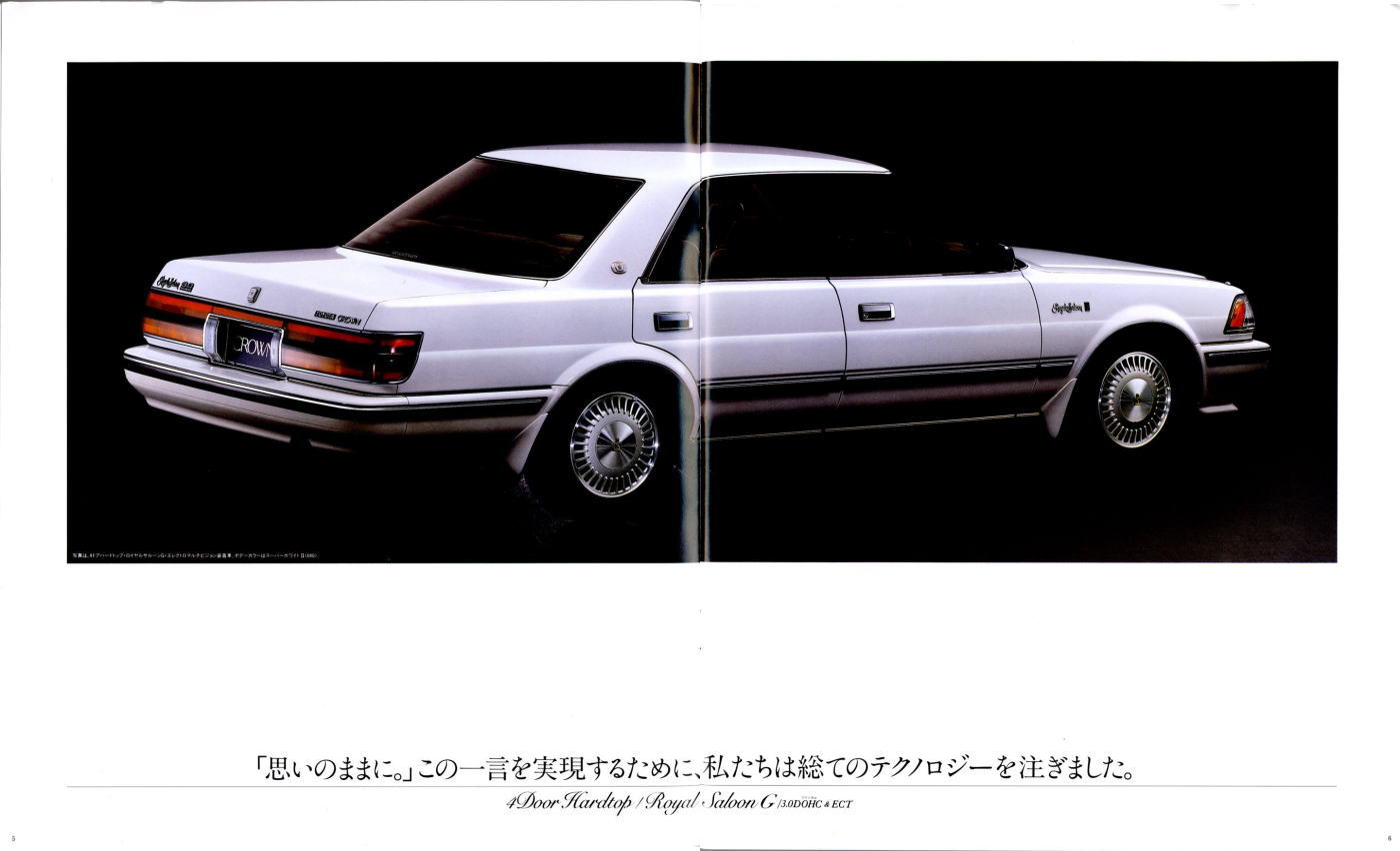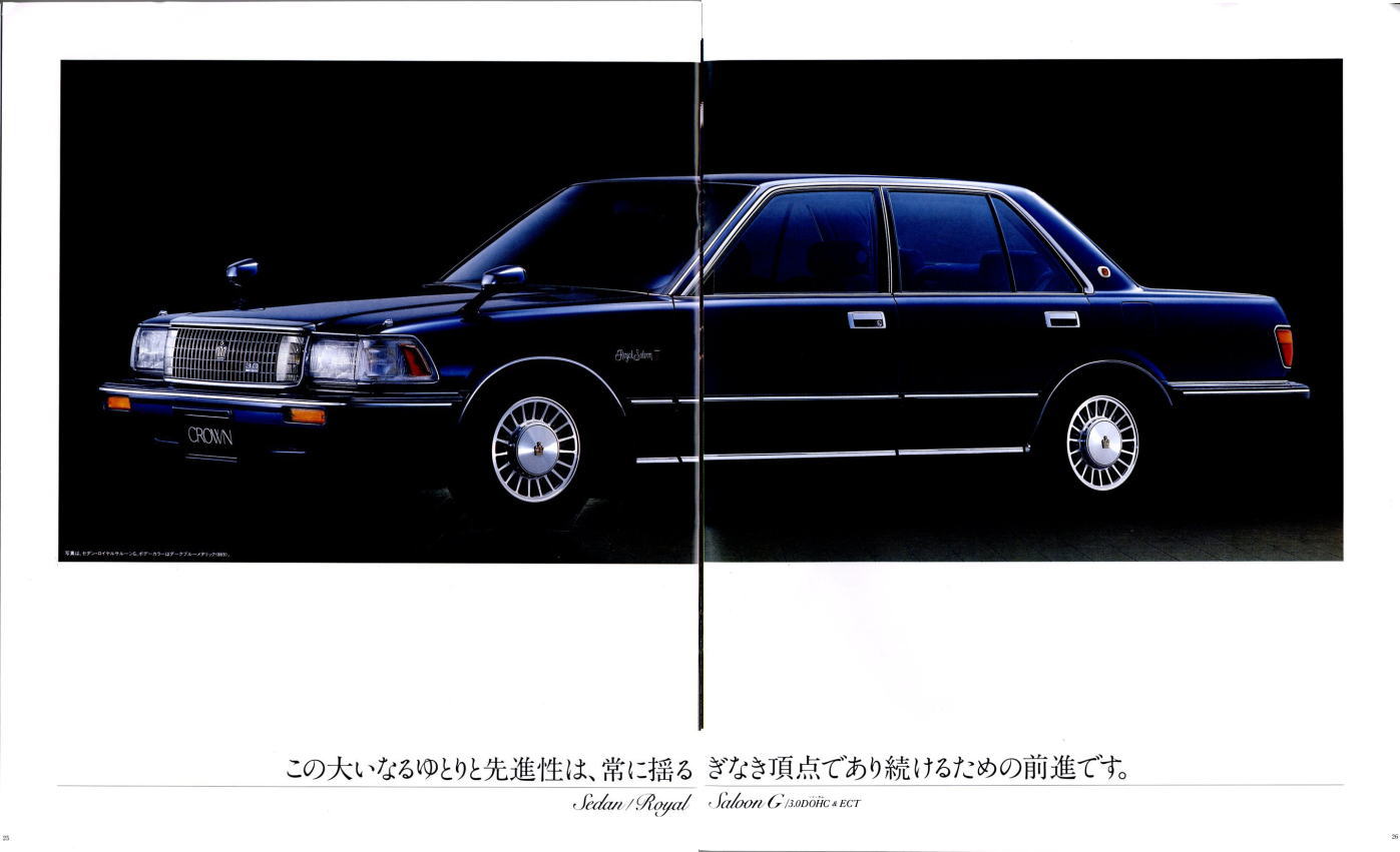 折からのバブル景気と、モデル途中の平成元年に税制変更があったこともあり、この代のクラウンは何でもありのクラウンでした。このカタログは前期型のものなのでまだ大人しいラインナップですが、後期型にはクラウンエイト以来の4リッターV8搭載車が生まれ、2リッターのワイドボディ車も生まれ、後の主流となる2.5リッター車が生まれたのもこの代です。