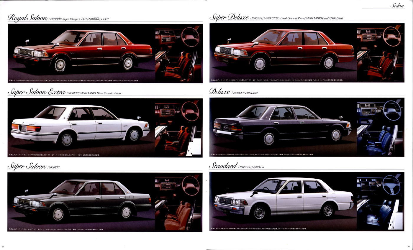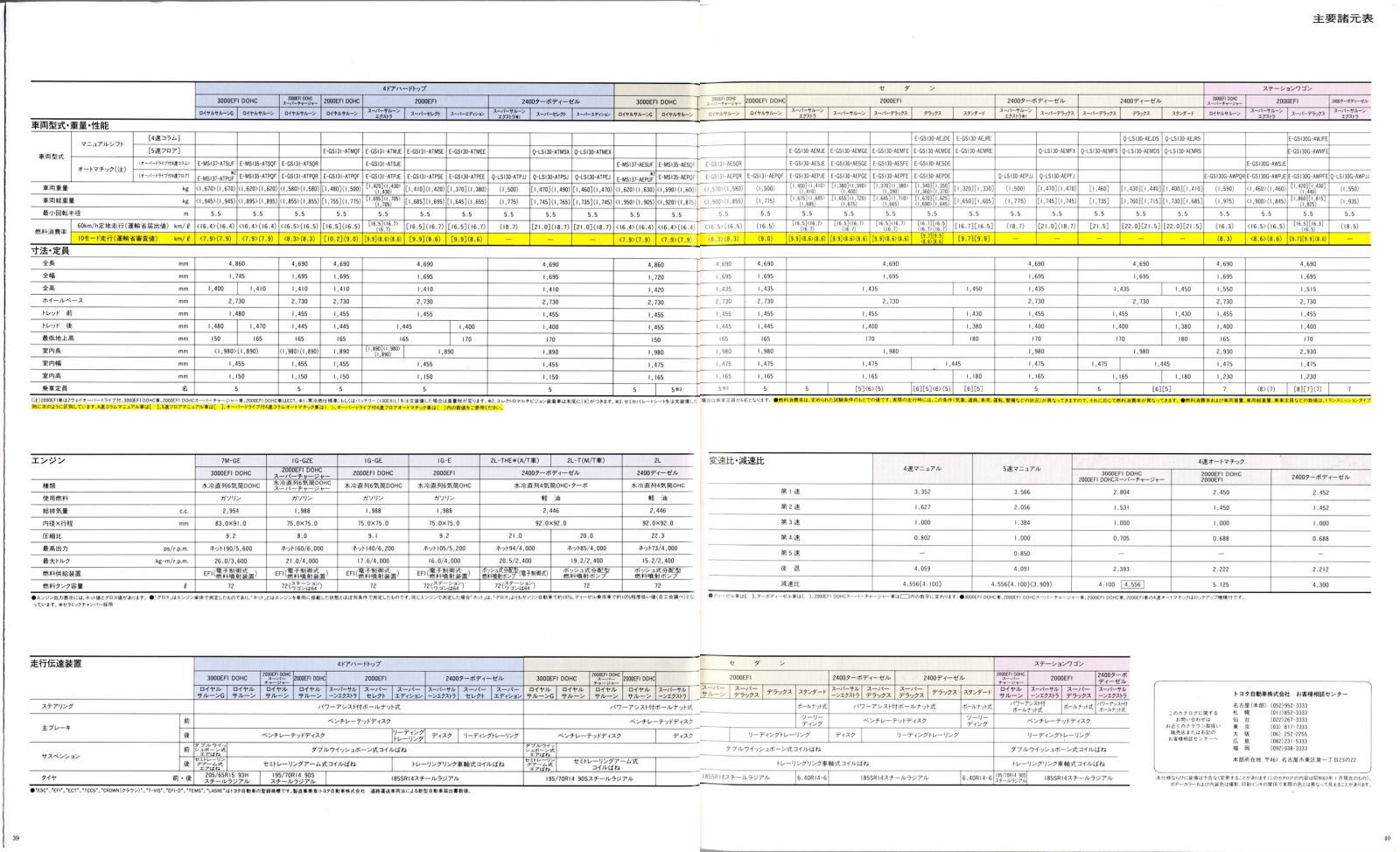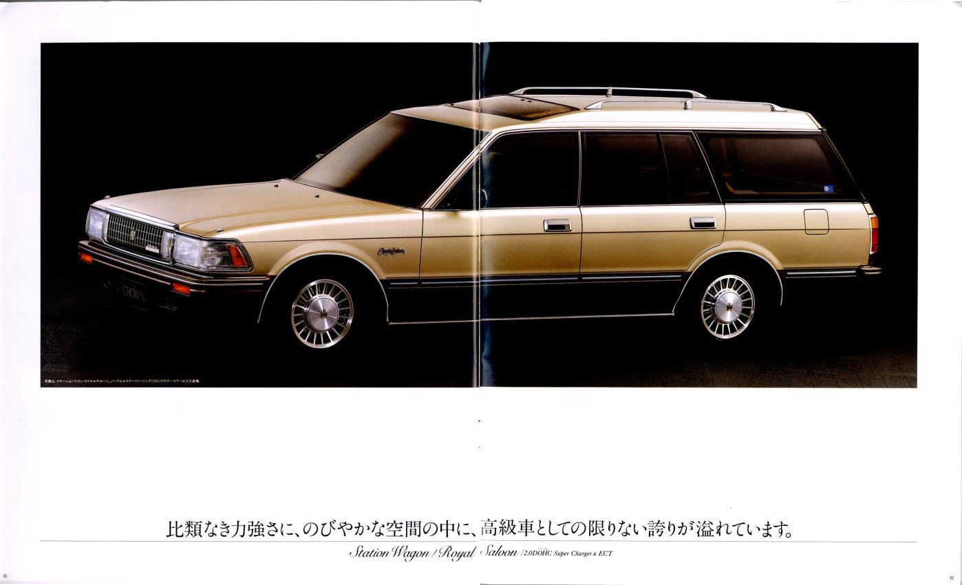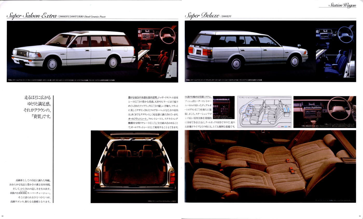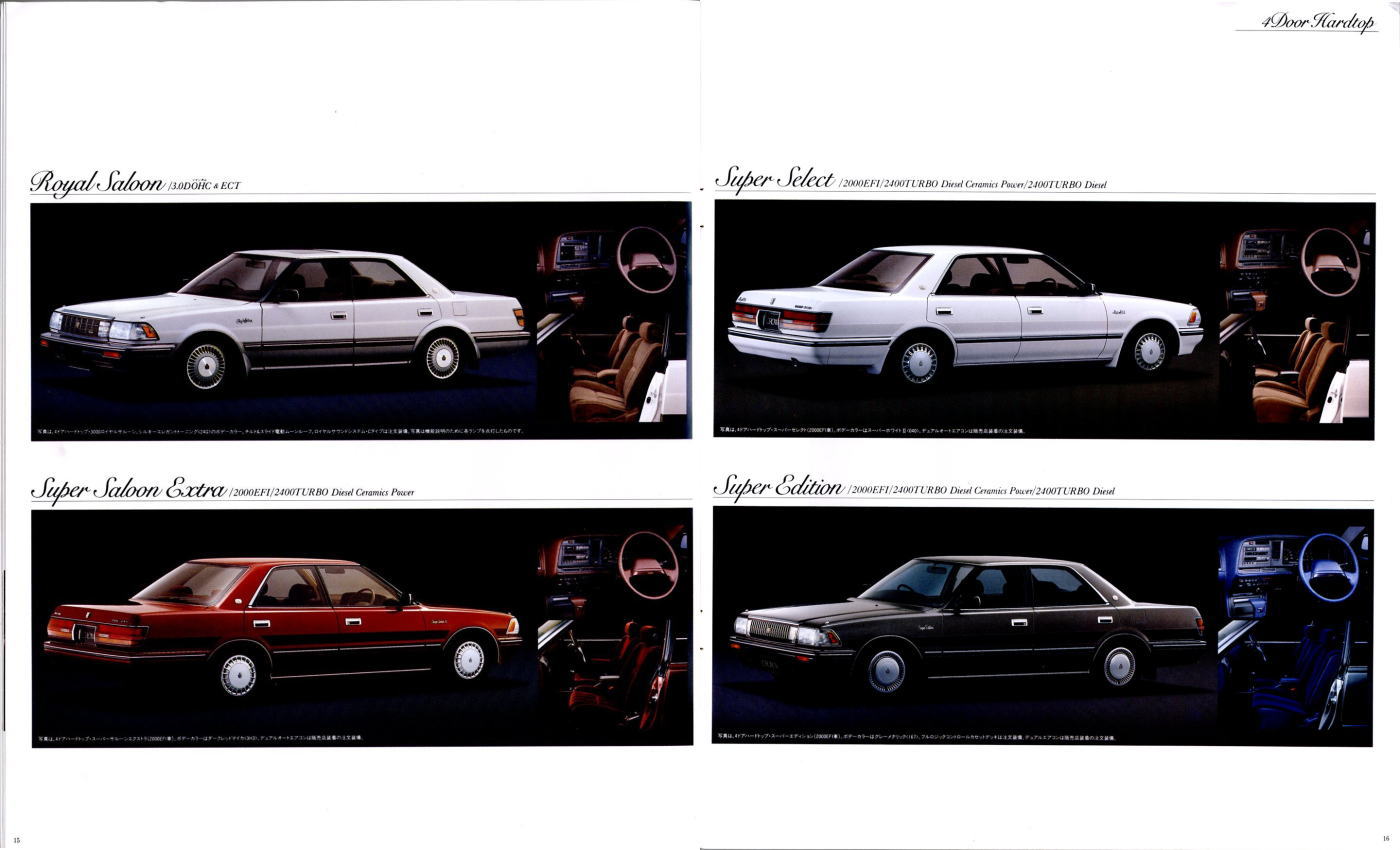 折からのバブル景気と、モデル途中の平成元年に税制変更があったこともあり、この代のクラウンは何でもありのクラウンでした。このカタログは前期型のものなのでまだ大人しいラインナップですが、後期型にはクラウンエイト以来の4リッターV8搭載車が生まれ、2リッターのワイドボディ車も生まれ、後の主流となる2.5リッター車が生まれたのもこの代です。